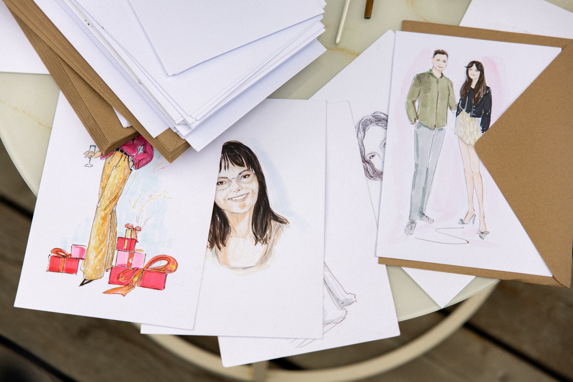 На welcome-зоне гости подписывали открытки и бросали их в почтовый ящик с марками, связанными с нашими путешествиями. Это было отсылкой к нашему с Костей общему увлечению посткроссингом. На конвертах гости указывали дату, когда нам стоит открыть и прочесть их послания. А художница тем временем рисовала скетчи на память для каждого приглашённого.