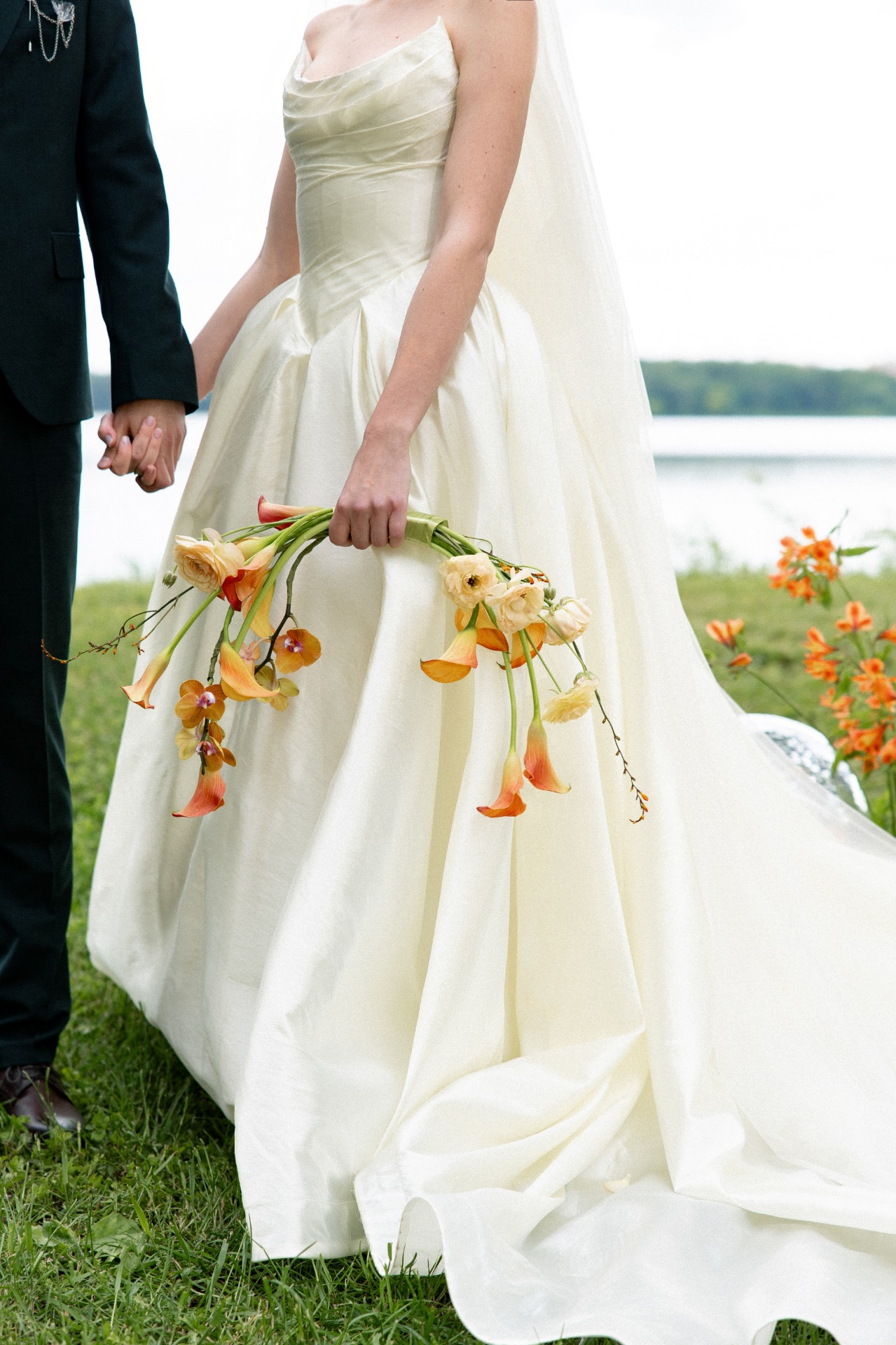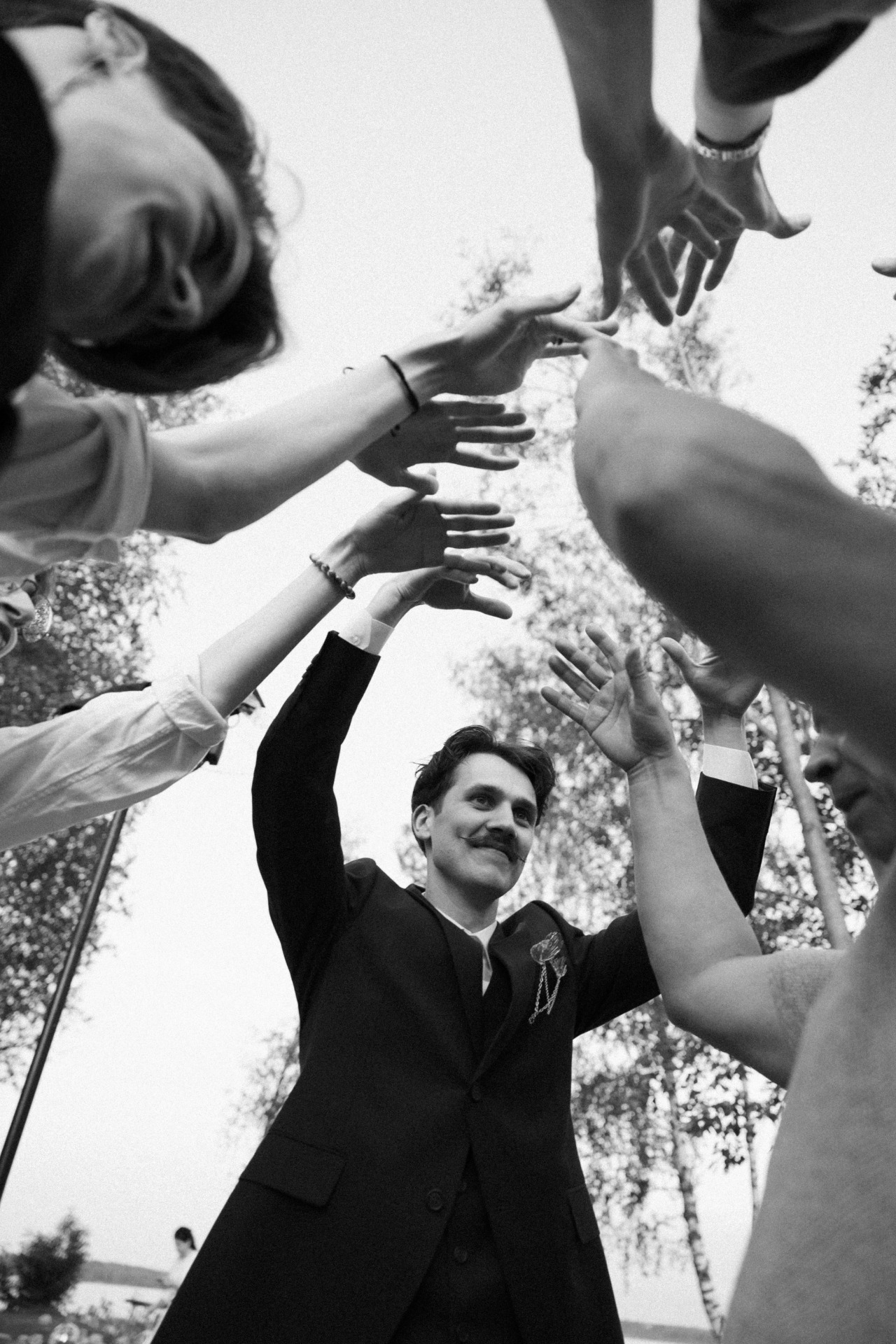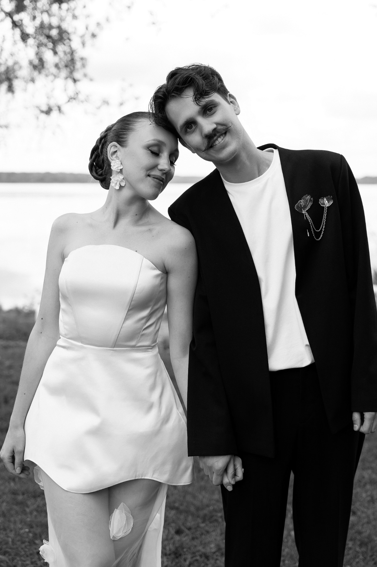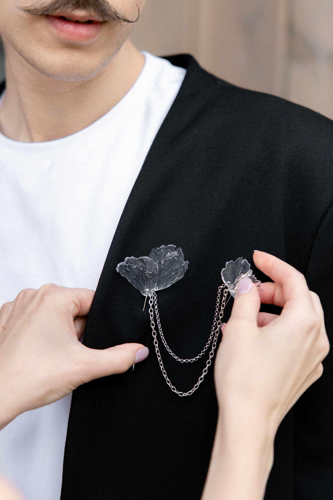 В Костин образ мы тоже добавили необычную деталь. Вместо бутоньерки он прикрепил на нагрудный карман цепочку с лепестком, выполненную на заказ. Она отлично сочеталась с моими аксессуарами в цветочном стиле.