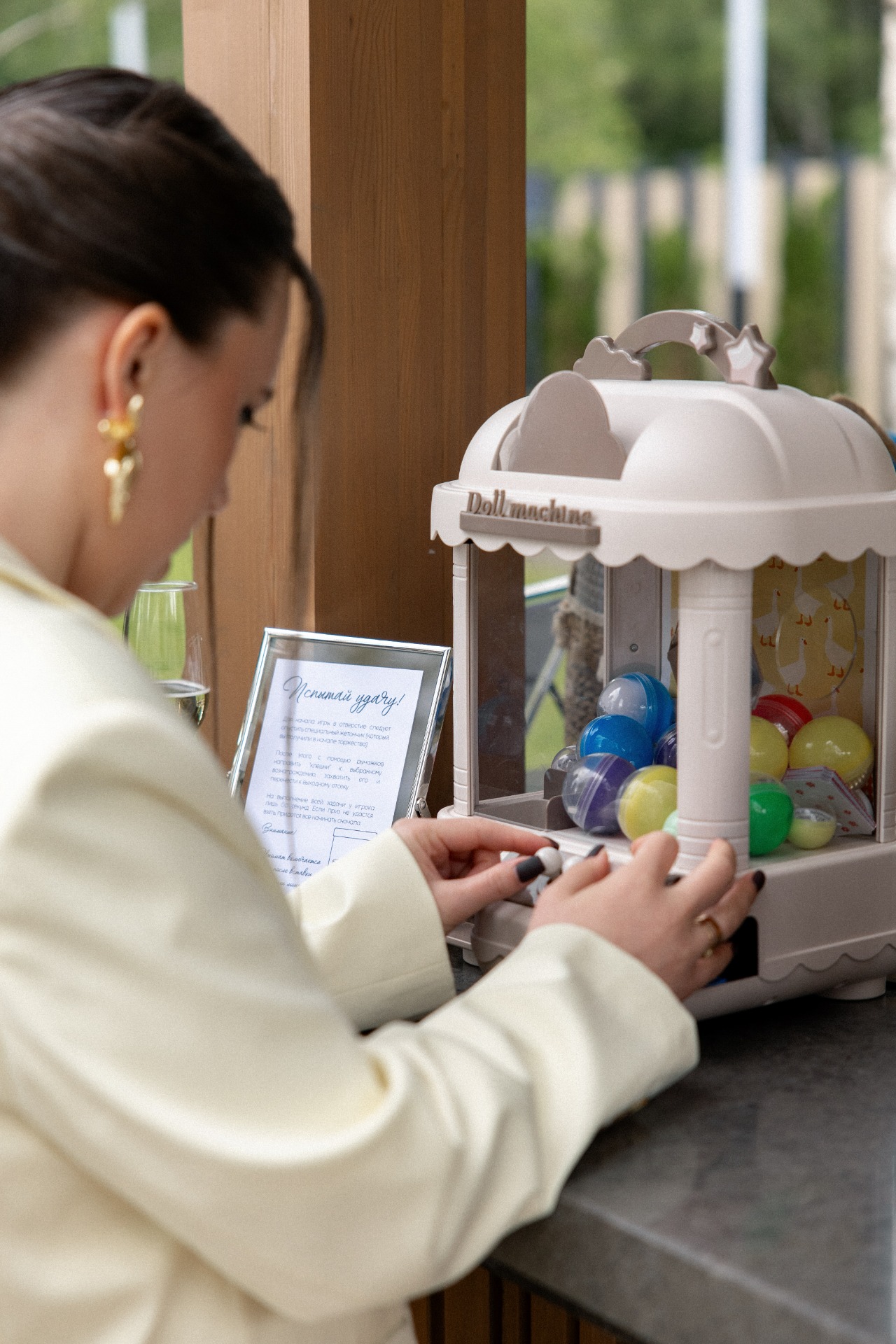 Ещё одной фишкой нашего велкома стал автомат с игрушками из детства, где в качестве призов были сувениры, связанные с нашими интересами и поездками. А вместо альбома для пожеланий мы поставили мольберт, на котором разместили задания для позирования для наших гостей.
