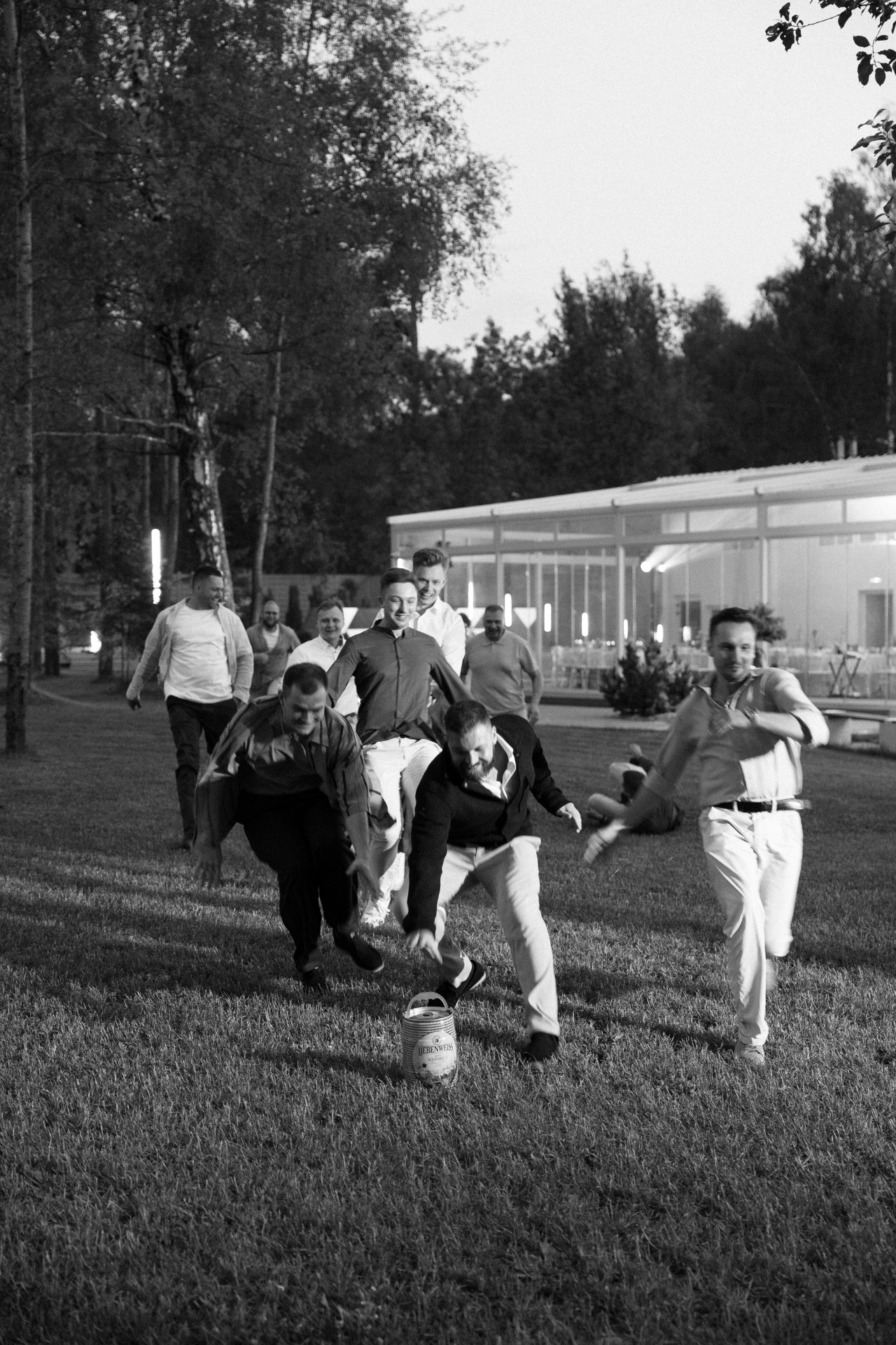 Финалом вечера стало бросание букета и шуточное соревнование для парней: вместо подвязки они наперегонки бежали за бочонком пива.