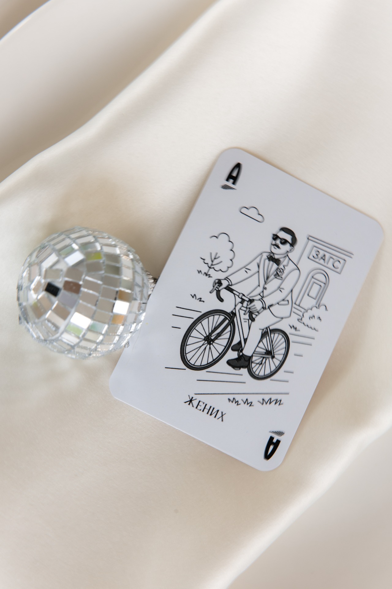 Одним из наших хобби является коллекционирование игральных карт, поэтому карточки рассадки были выполнены в виде карточной колоды. На «рубашках» красовались гуси, а для каждого гостя мы сделали индивидуальный рисунок с помощью нейросетей.