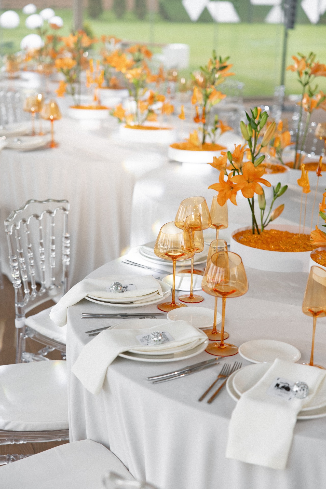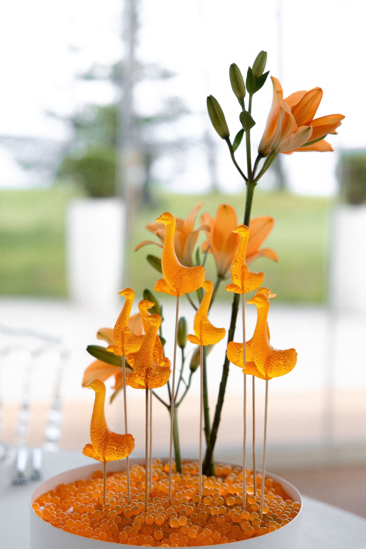 В декор мы добавили леденцы в форме гусей и мягкую игрушку «гусь-обнимусь» в зону отдыха, а в качестве основного цвета нашей свадьбы выбрали ярко-оранжевый оттенок в тон гусиных лапок.
