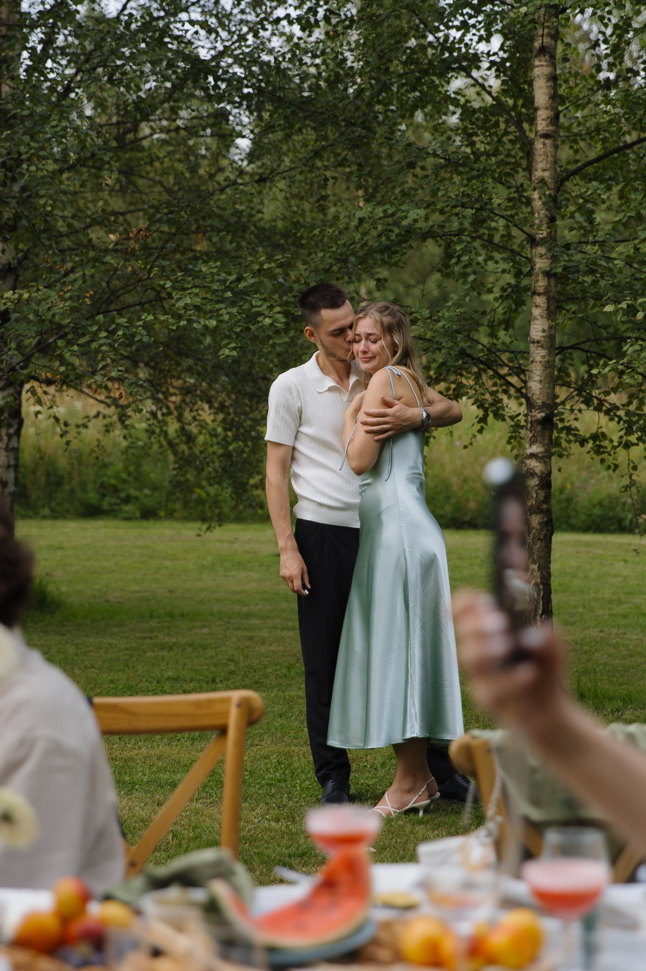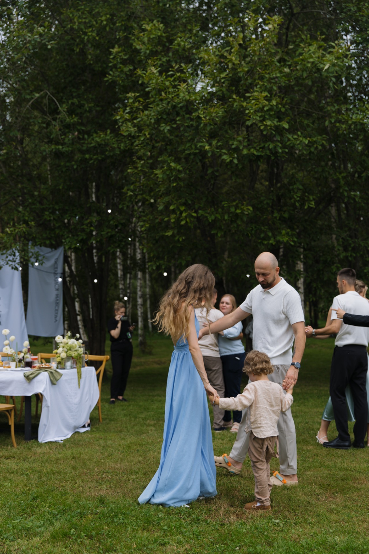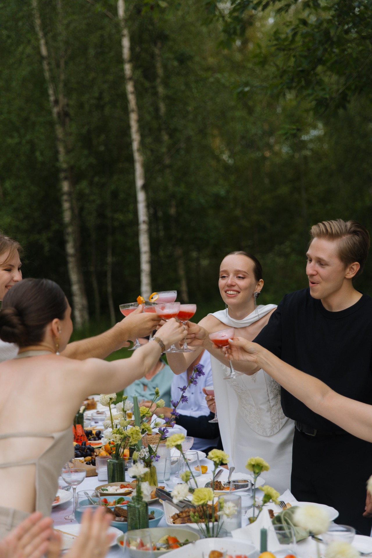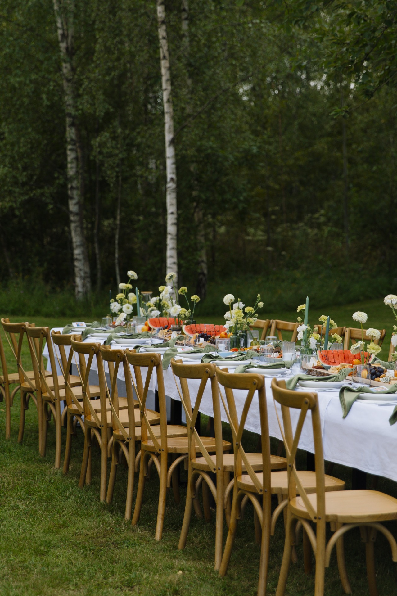 Мы решили пожениться через год и начали готовиться к свадьбе заранее. Мы сразу знали, что хотим камерный праздник на природе, в семейной атмосфере. В центре нашей концепции была идея одного длинного стола в поле под большими деревьями, где будут только мы и наши близкие люди.