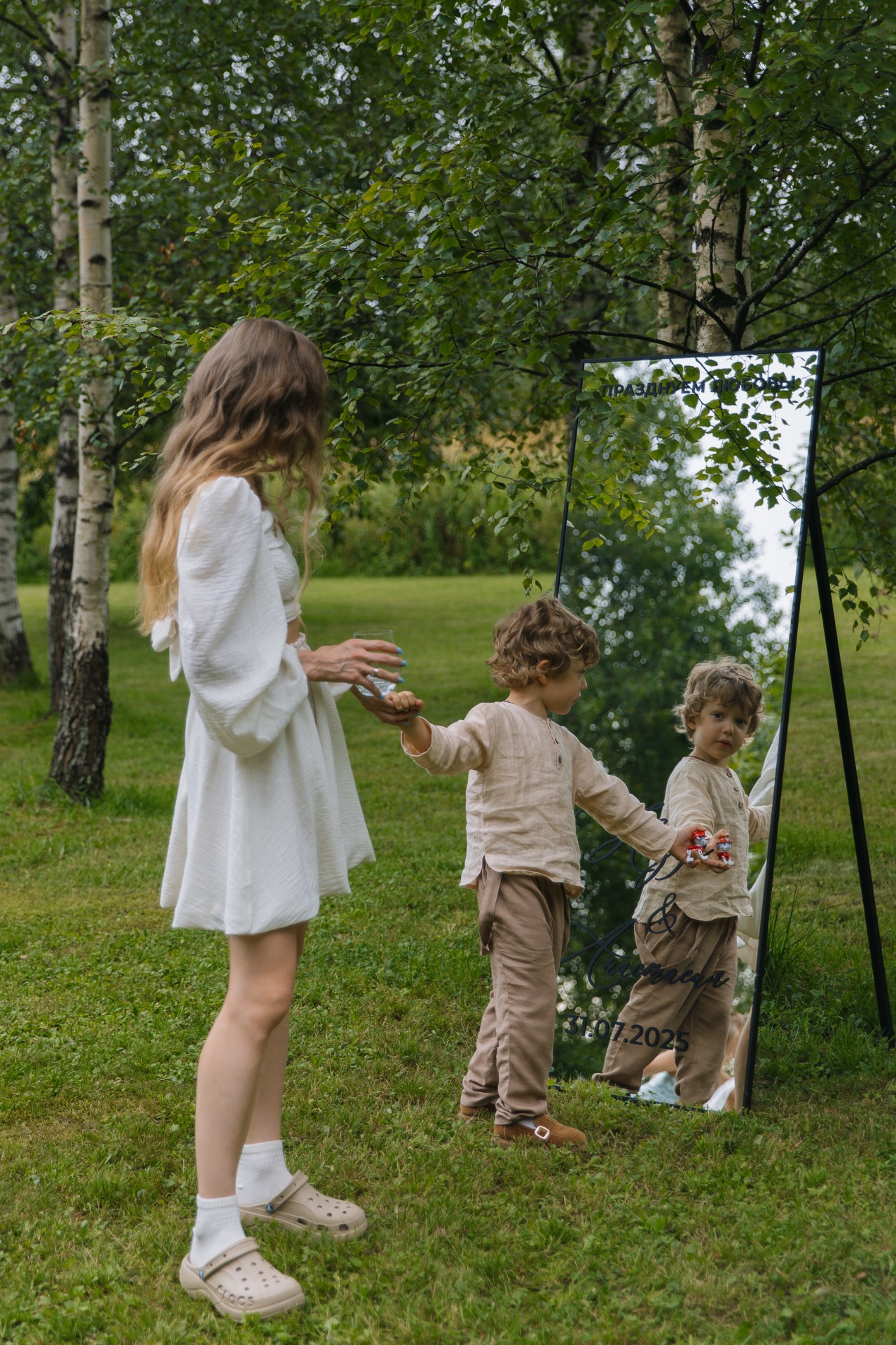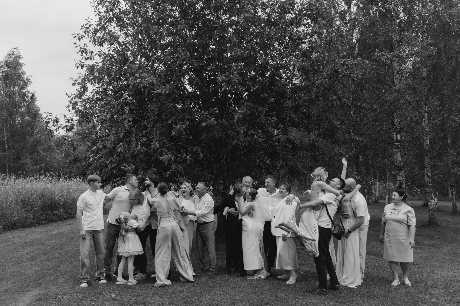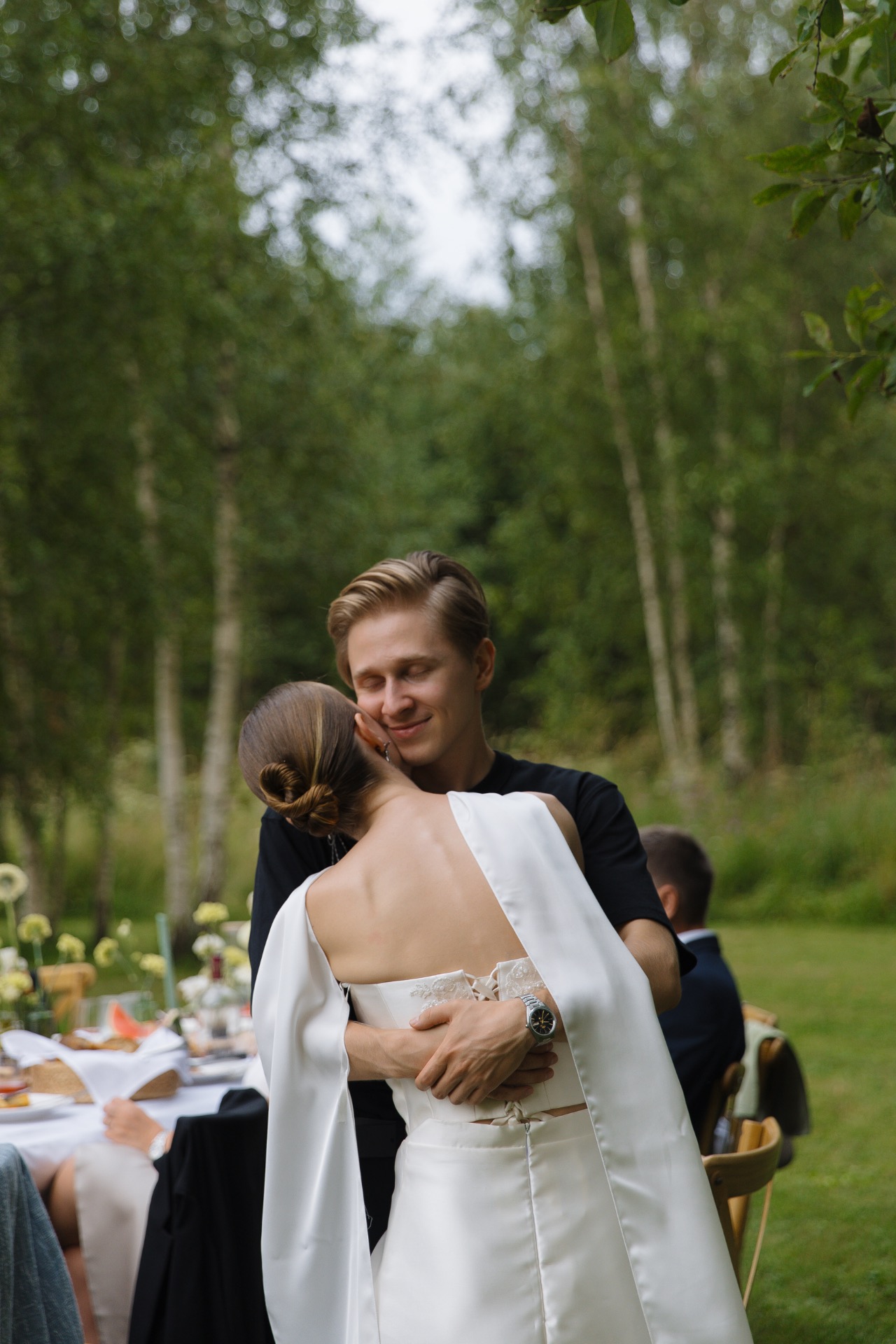 Мы решили пожениться через год и начали готовиться к свадьбе заранее. Мы сразу знали, что хотим камерный праздник на природе, в семейной атмосфере. В центре нашей концепции была идея одного длинного стола в поле под большими деревьями, где будут только мы и наши близкие люди.