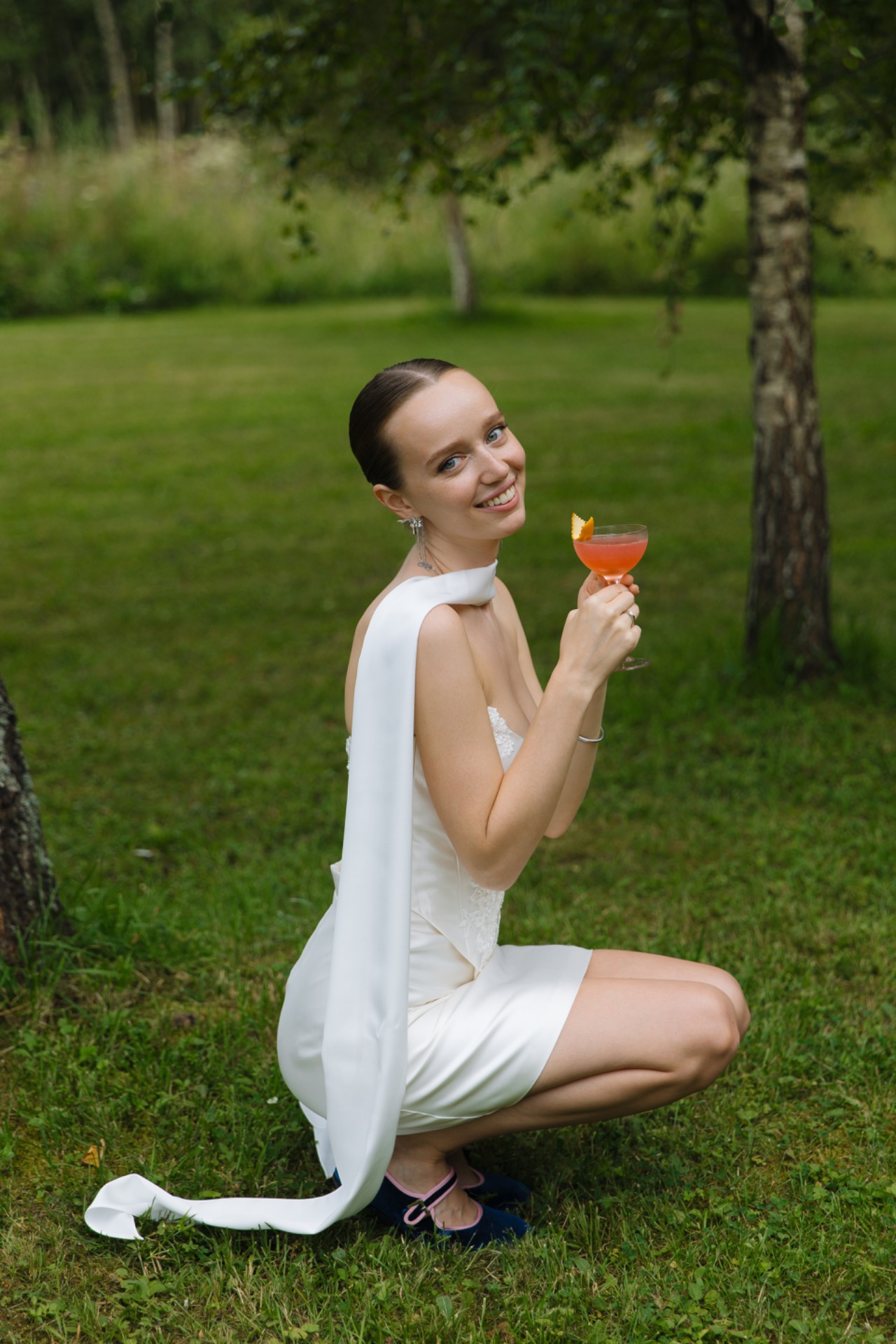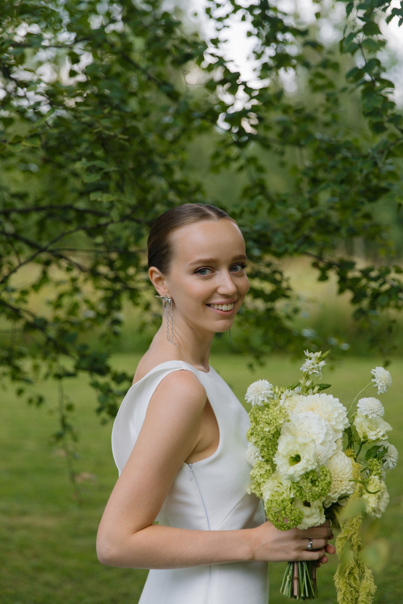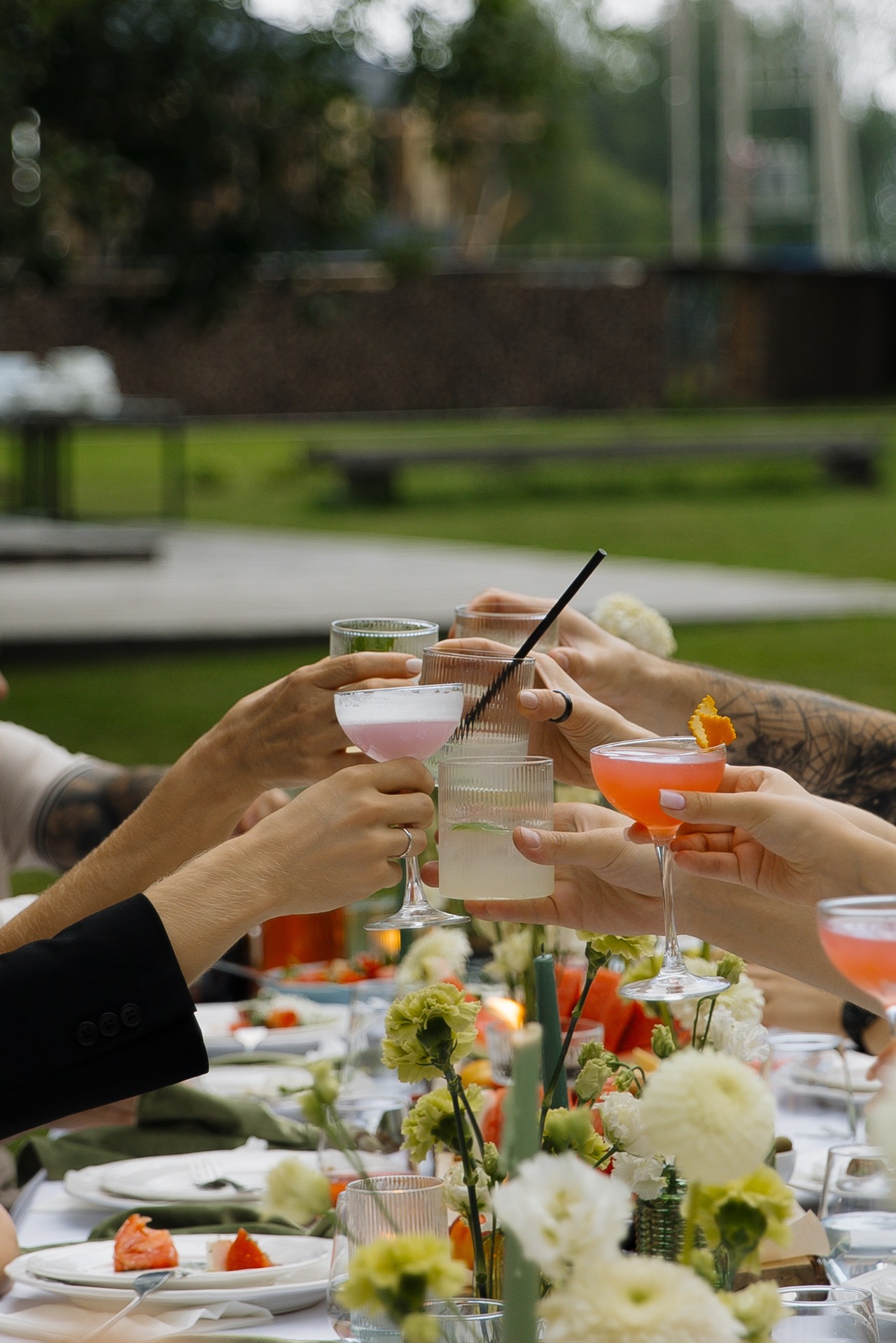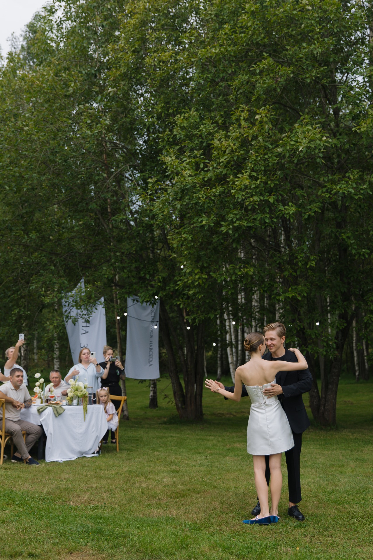 После ЗАГСа мы отправились на нашу площадку. Пока гости собирались на welcome-зоне, неожиданно начался дождь. Все пятнадцать минут, пока он шёл, я представляла различные варианты дальнейшего развития нашего праздника. В этот момент меня очень поддержали наш координатор и фотограф — большое им спасибо за это! Наша команда сработала идеально: за несколько минут пересервировали столы после дождя, и мы смогли провести банкет под открытым небом, как и мечтали.