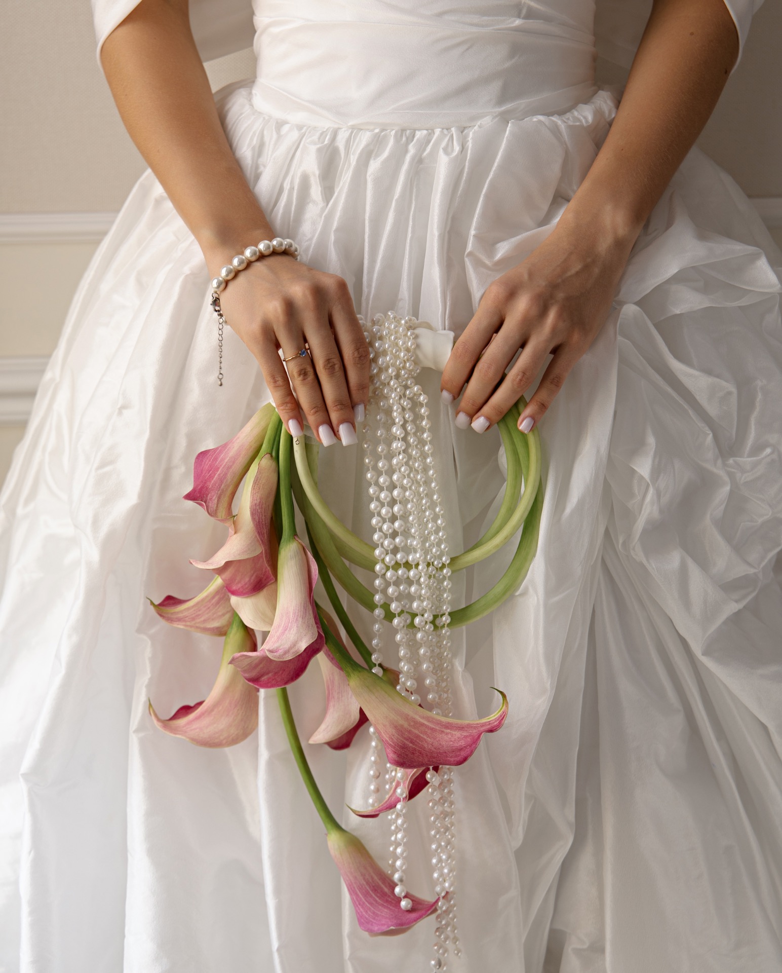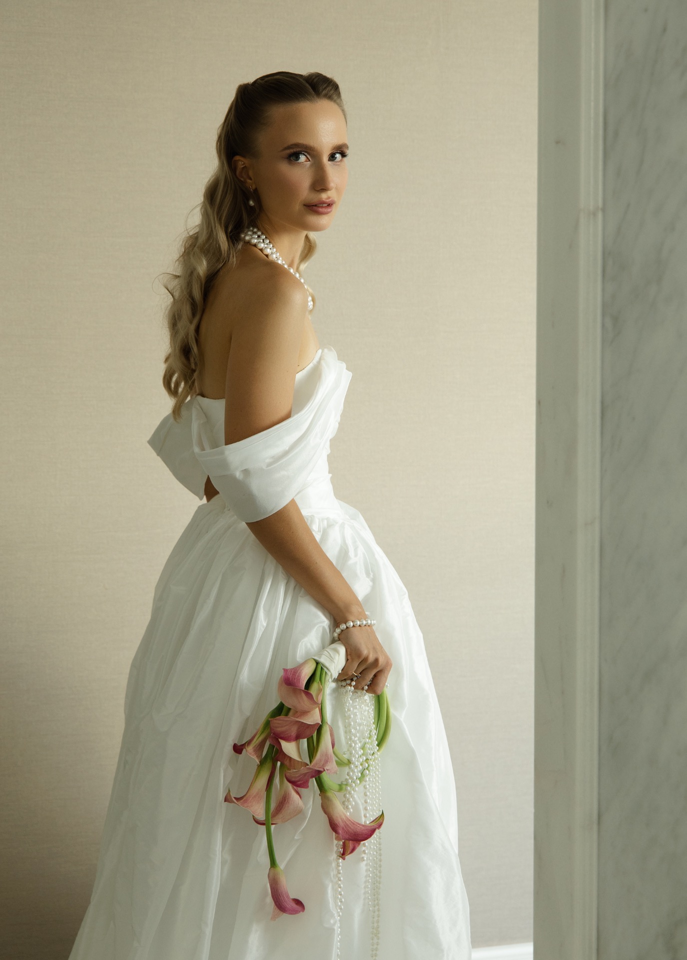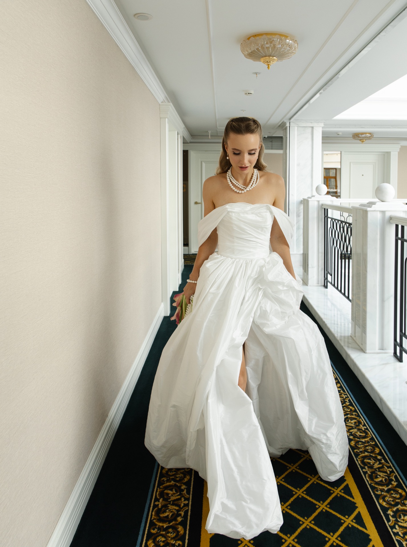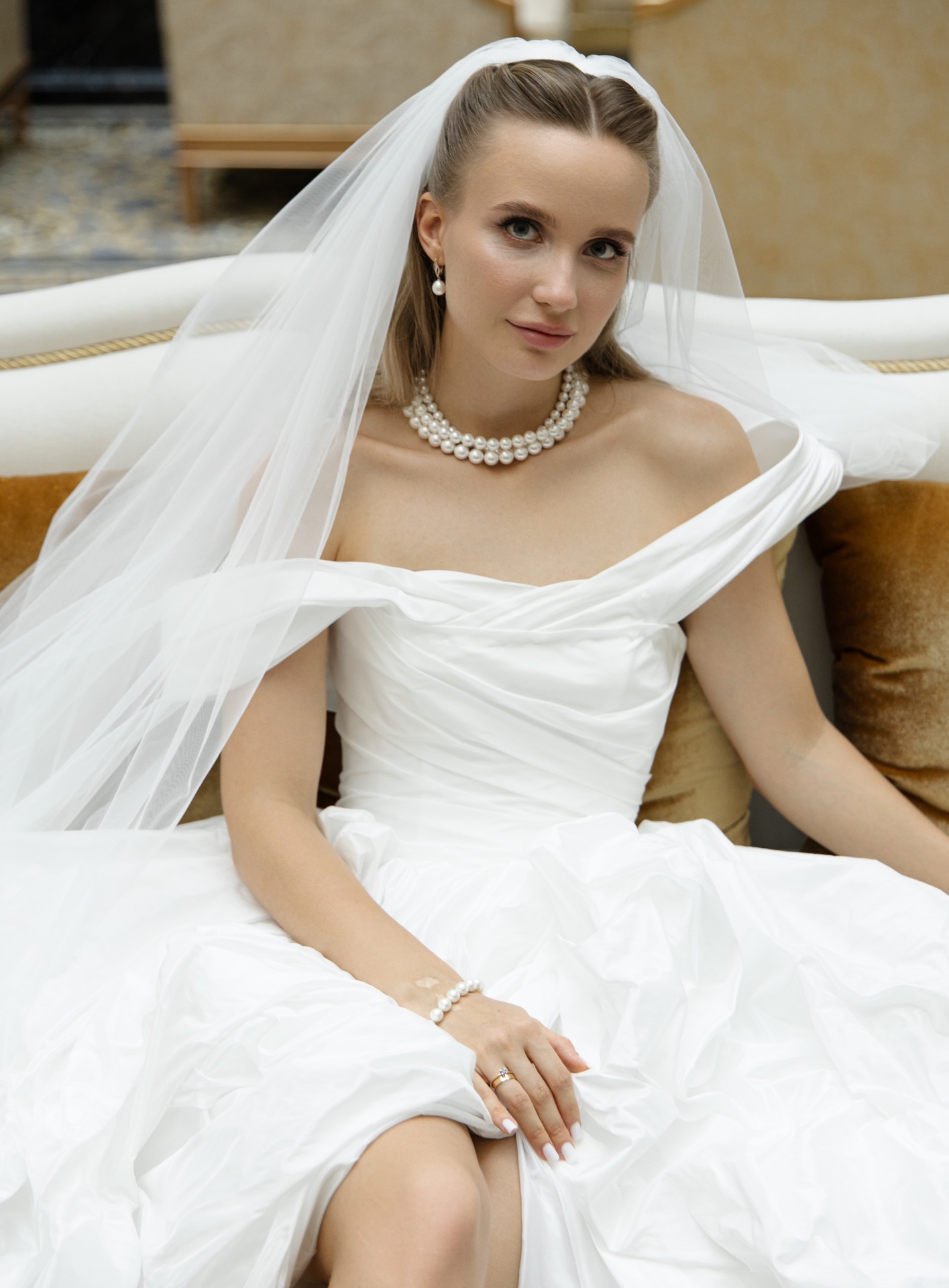 У Арины было три образа: элегантный комплект с жемчужными нитями, классическое платье с крупной драпировкой и фатой, и третий образ для вечеринки с кавер-группой — короткое платье-зефирка, как те, что использовались в декоре.