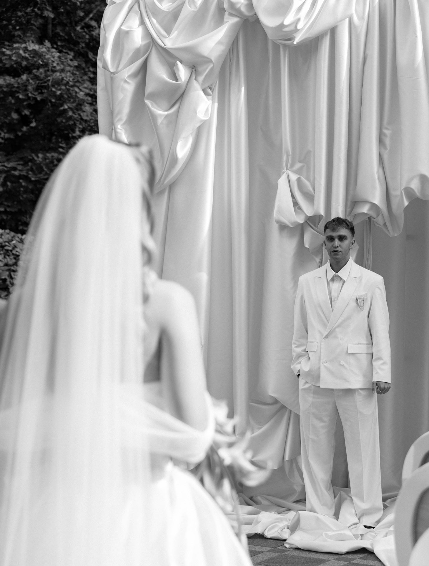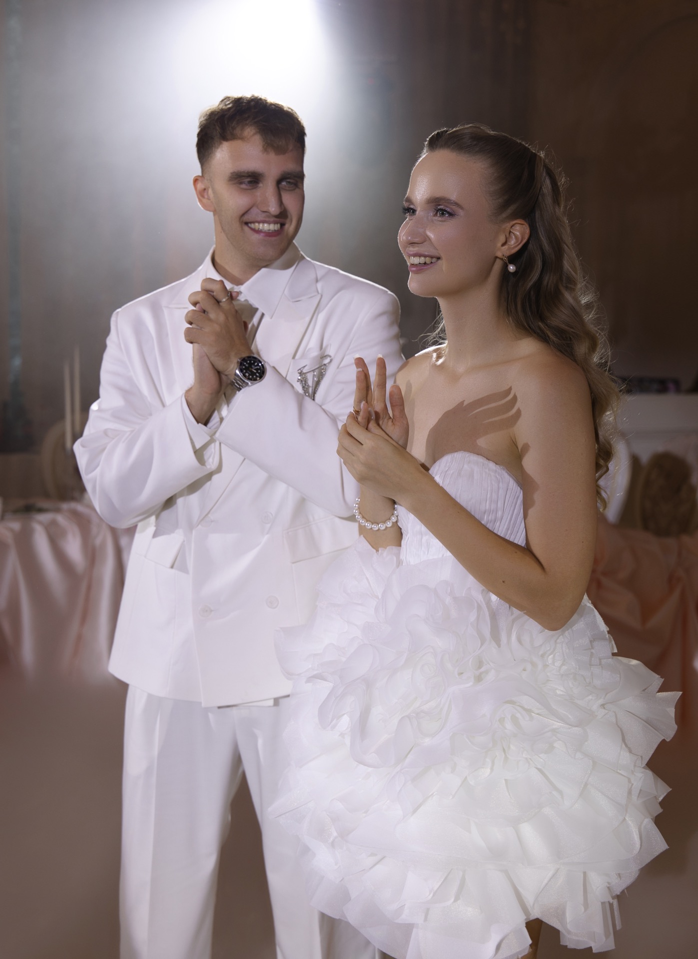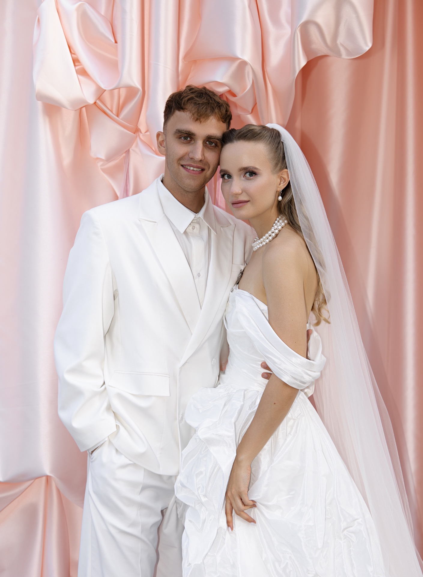 Костюм Димы отшивался по индивидуальным меркам. Стильным и свежим решением стали total white образы пары, которые круто сочетались с цветовой палитрой декора.