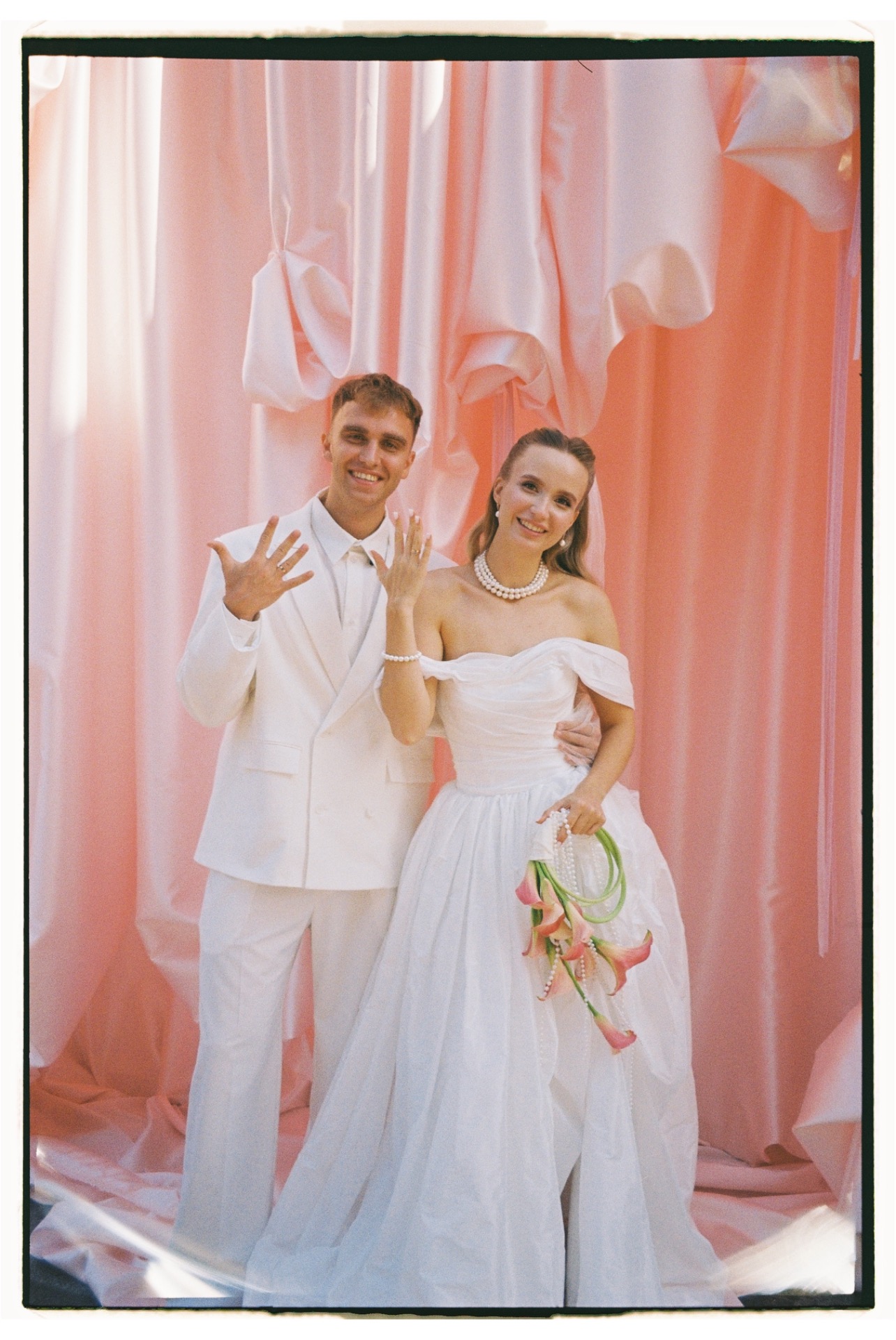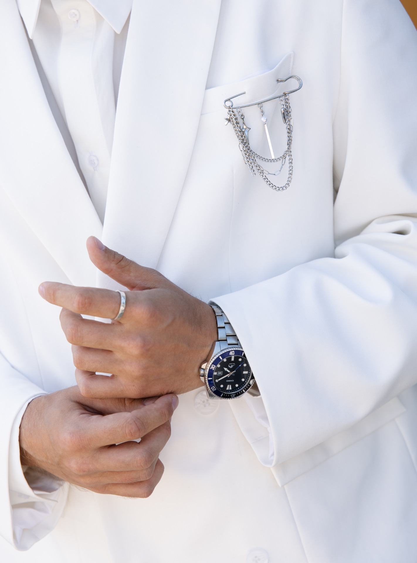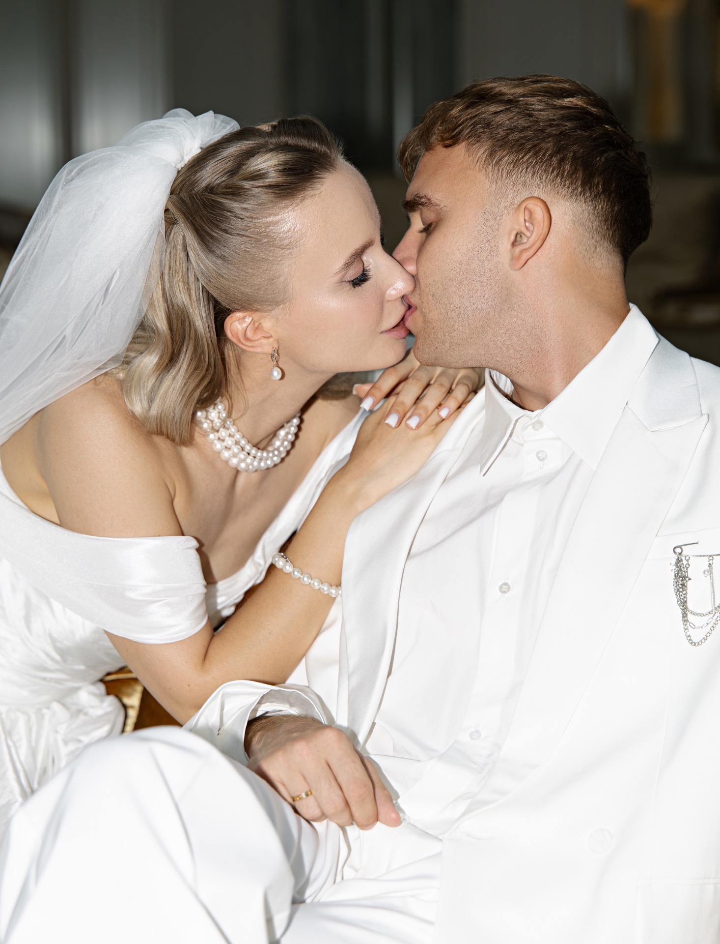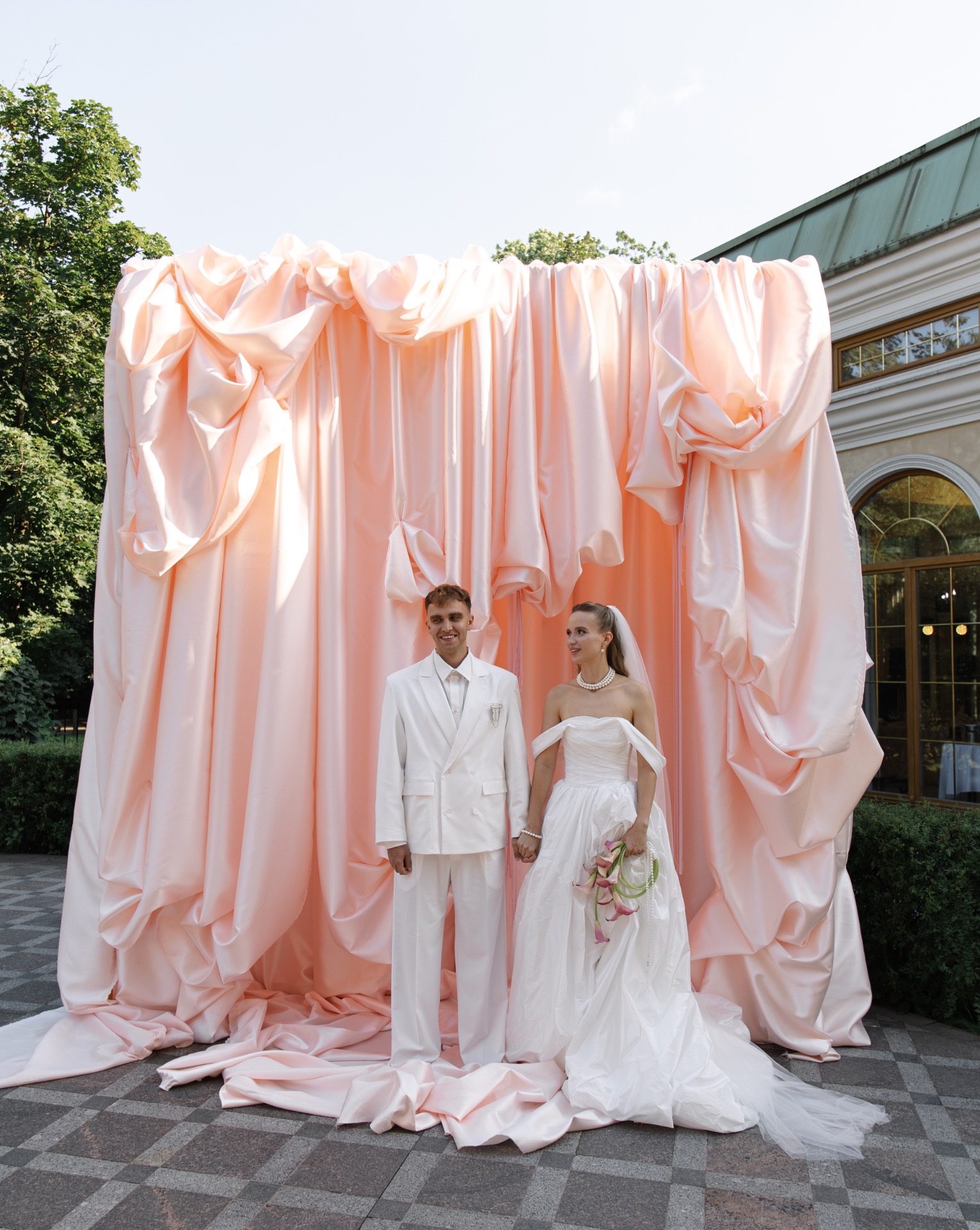 Костюм Димы отшивался по индивидуальным меркам. Стильным и свежим решением стали total white образы пары, которые круто сочетались с цветовой палитрой декора.