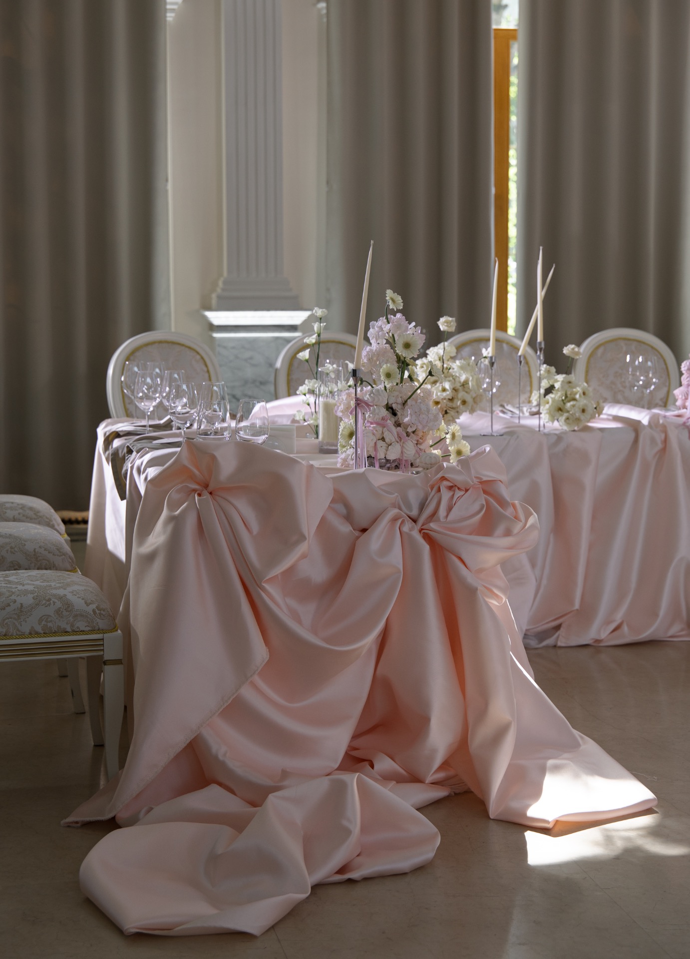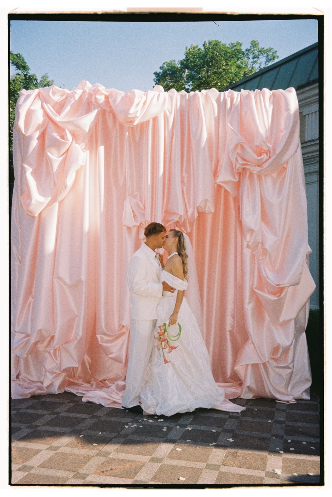 Зона регистрации выполнена из розовых, зефировых тканей с крупной, ниспадающей драпировкой. Перед церемонией Арина и Дима очень волновались, но как только Арина оказалась в объятиях папы, переживания исчезли — и вернулись лишь во время клятв, которые тронули всех гостей. Эмоции ребят не оставили никого без слёз.