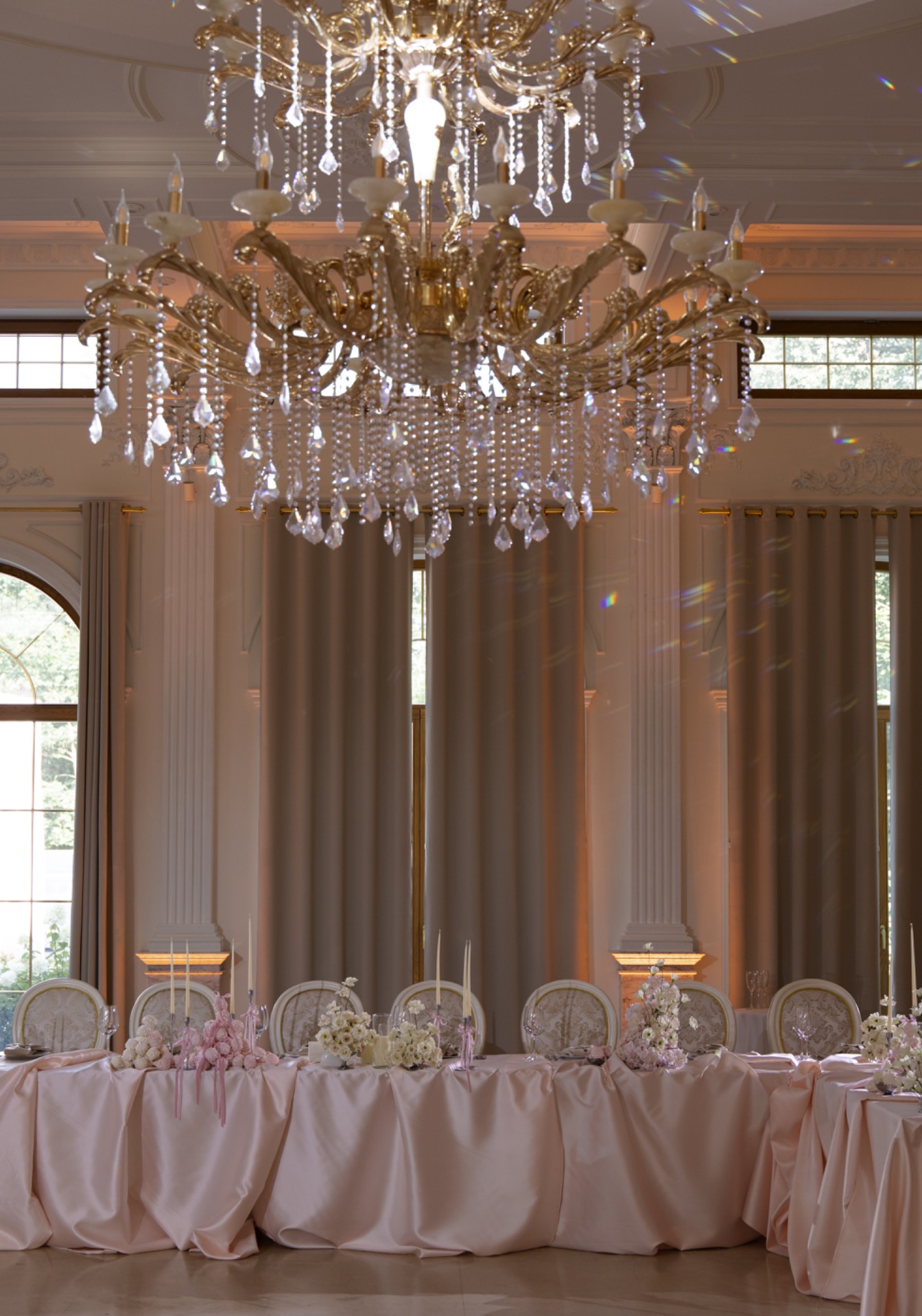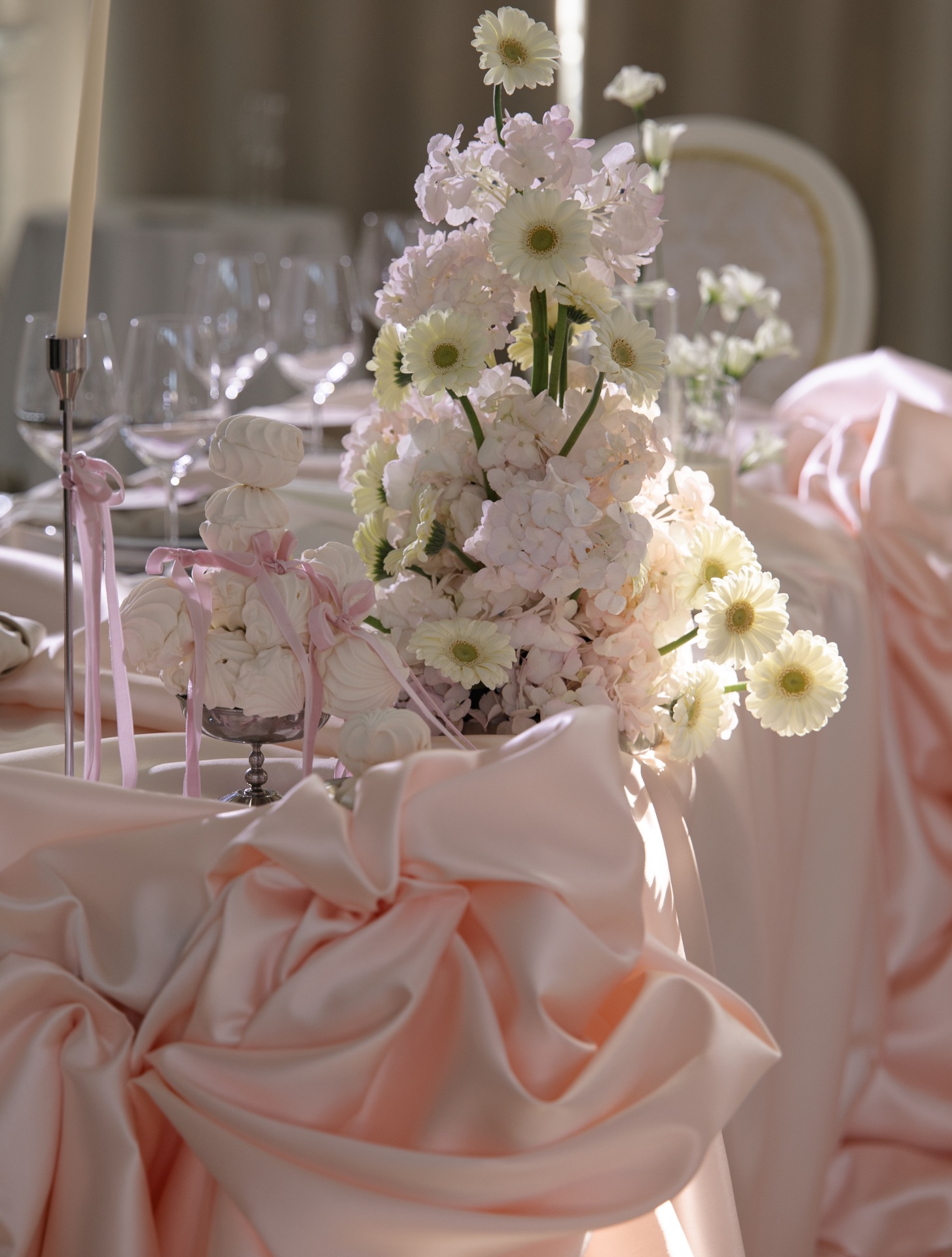 Розовый — любимый цвет невесты, он стал центральным при выборе палитры праздника. Арина — кондитер, поэтому мы решили добавить сладкие детали — зефирки в украшение банкета.