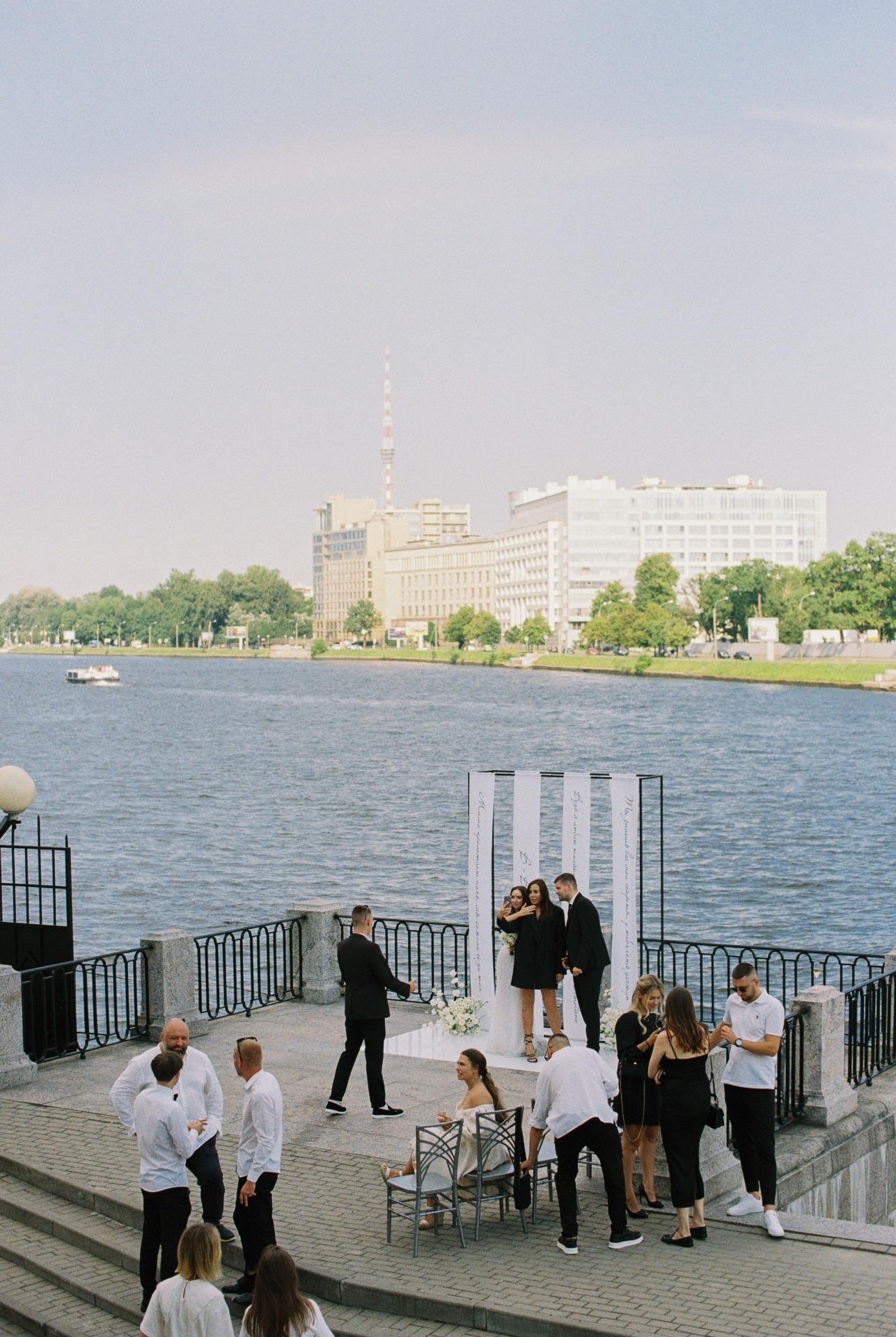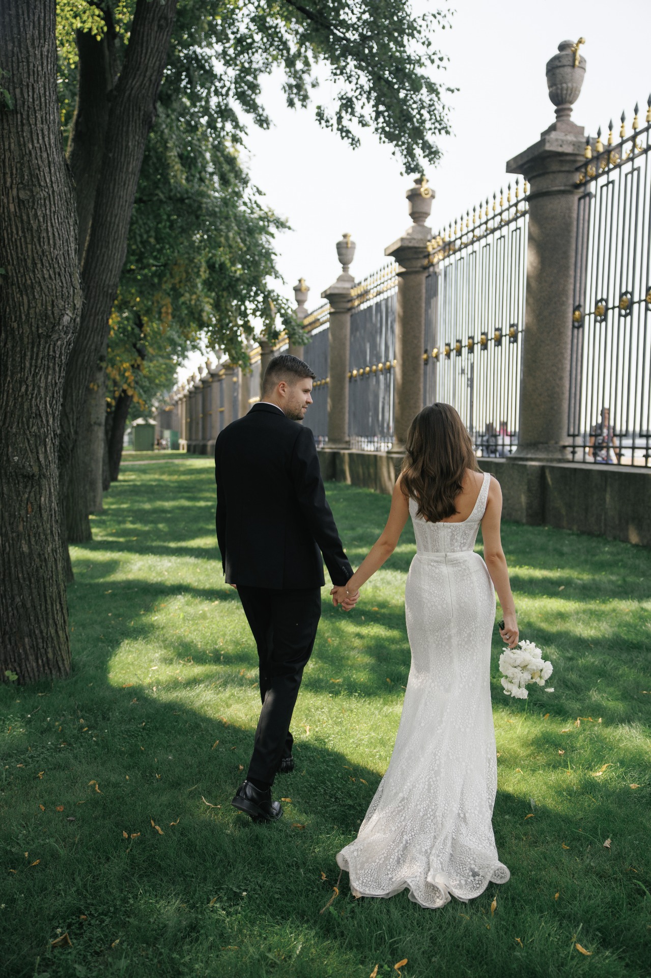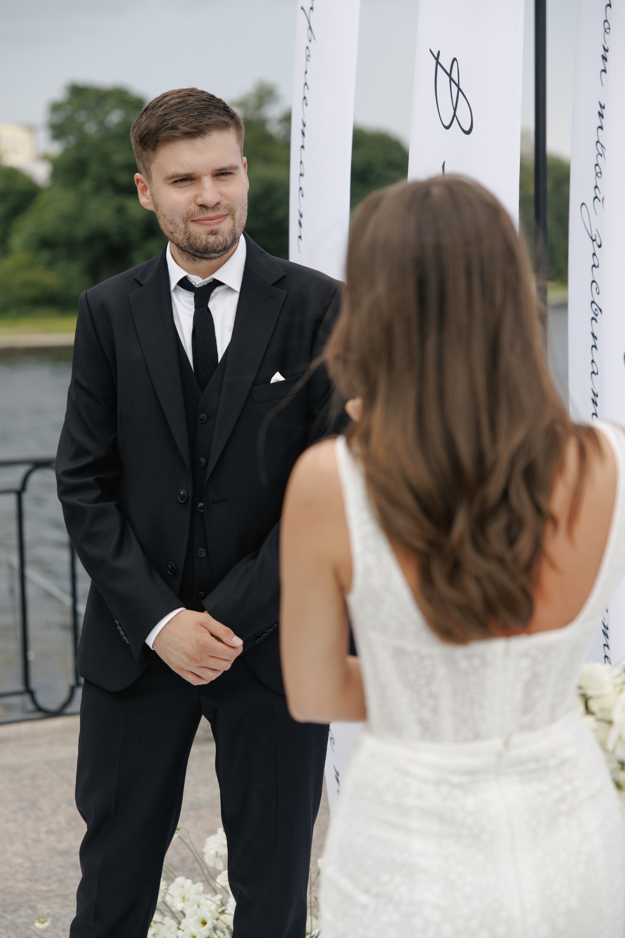 Хотелось воздушности и лёгкости, обязательно в центре Петербурга, где вырос жених, так мы выбрали особняк Путилова. Минимум цветов, необычная арка с важными словами из песен на берегу Невы, два стола без президиума, чтобы разделить все моменты с близкими, белые полевые нежные цветы и россыпь жемчуга на столах — так как я выросла на Сахалине. В каждой детали этого дня было что-то родное для нас.