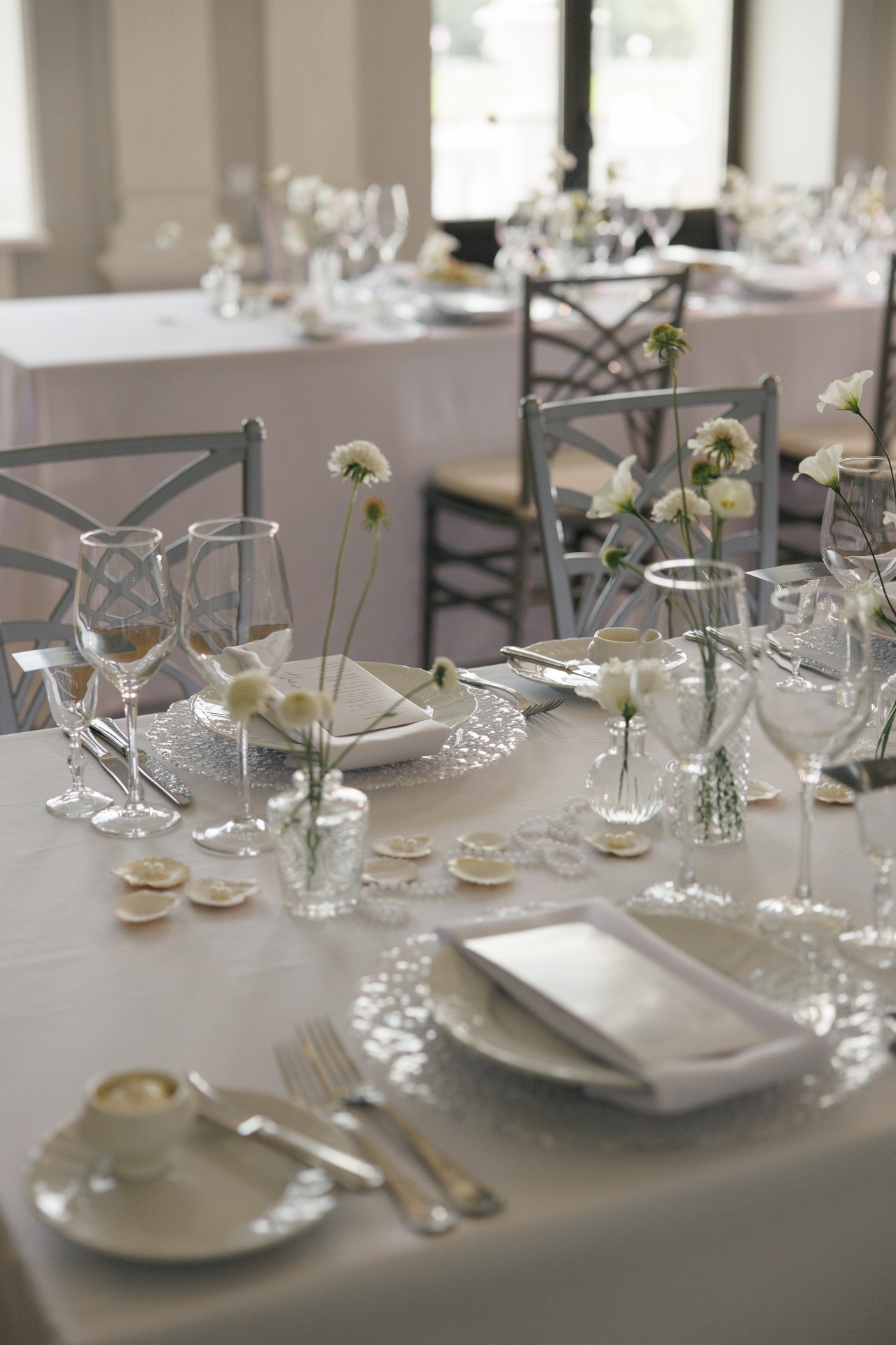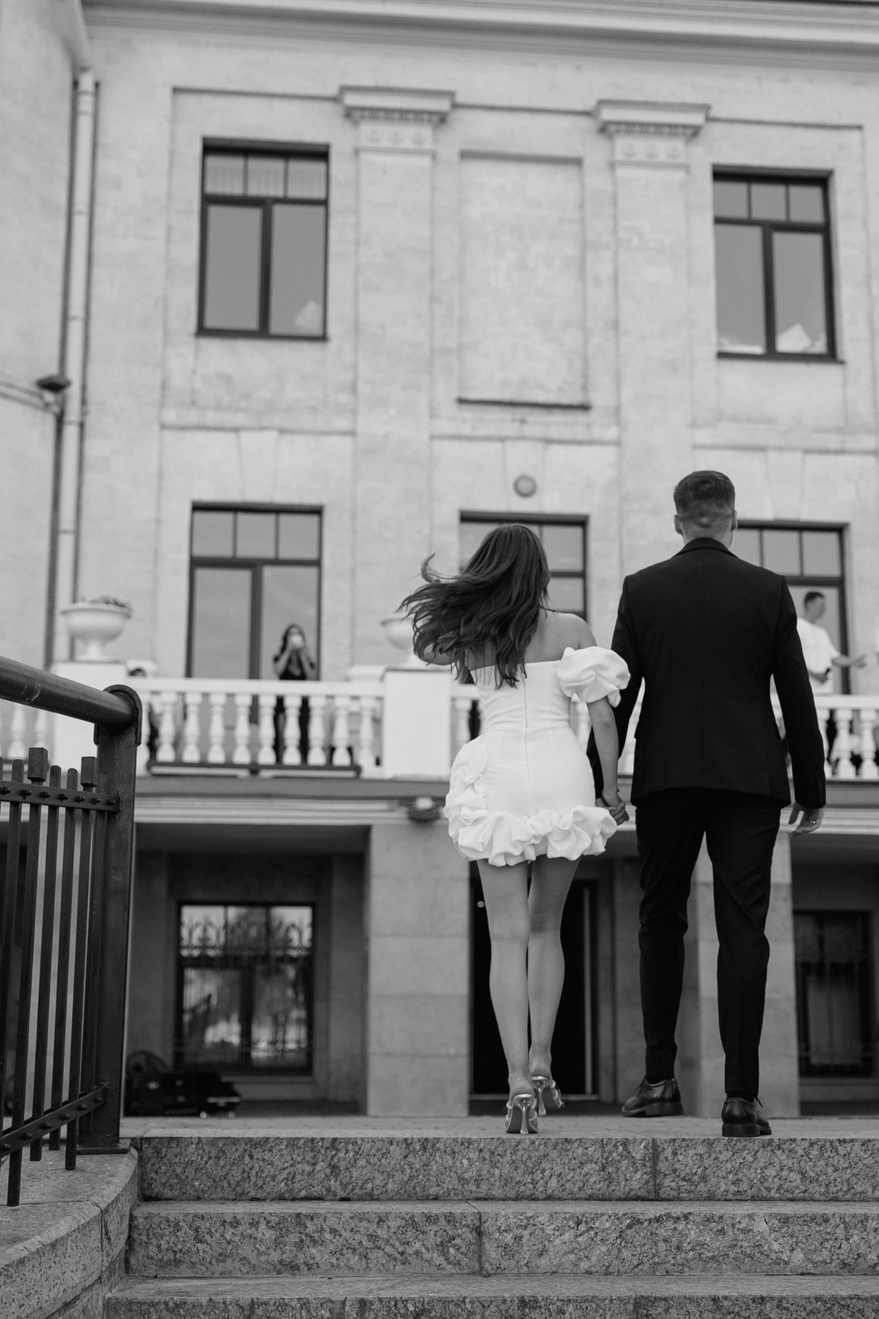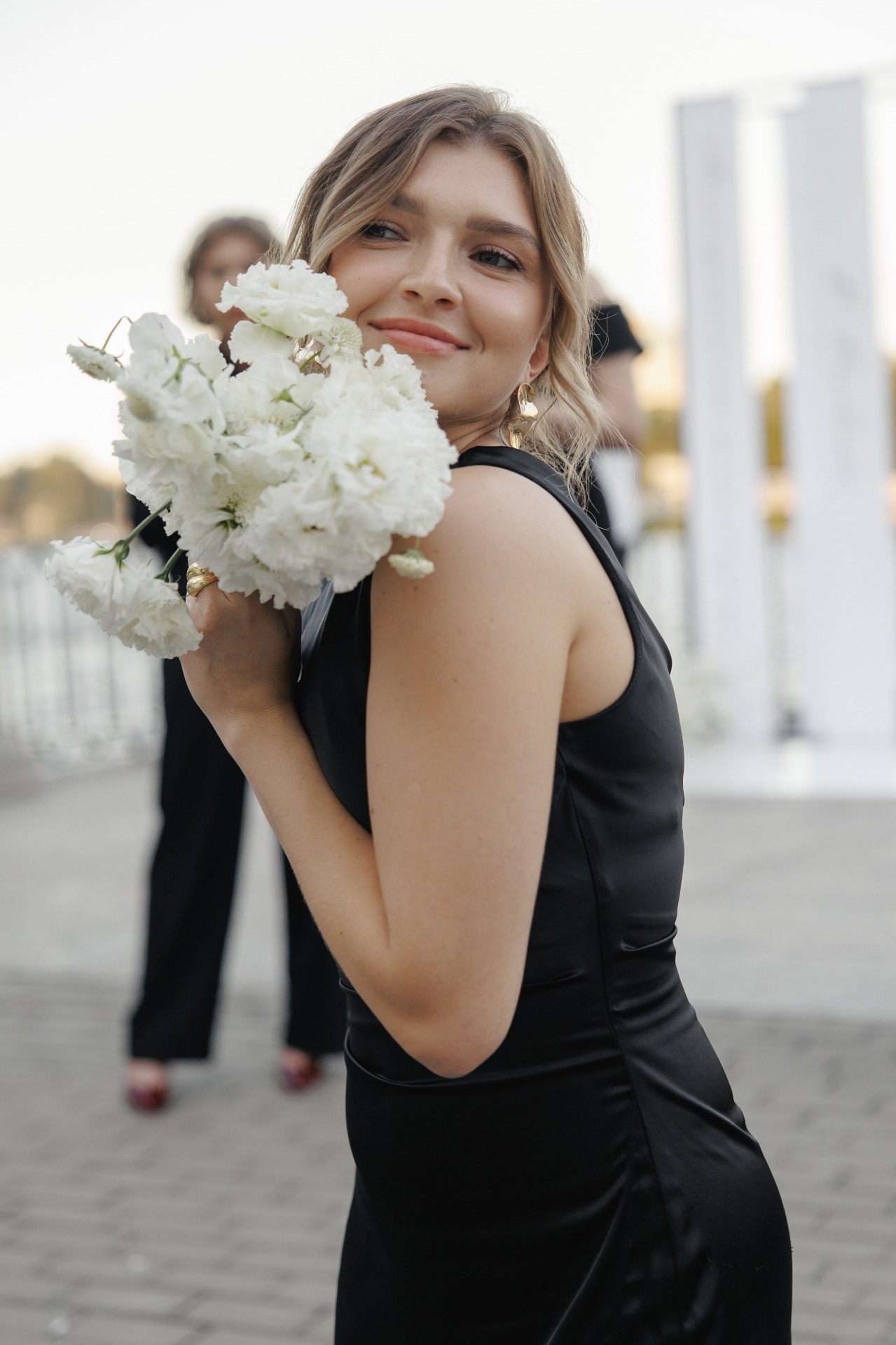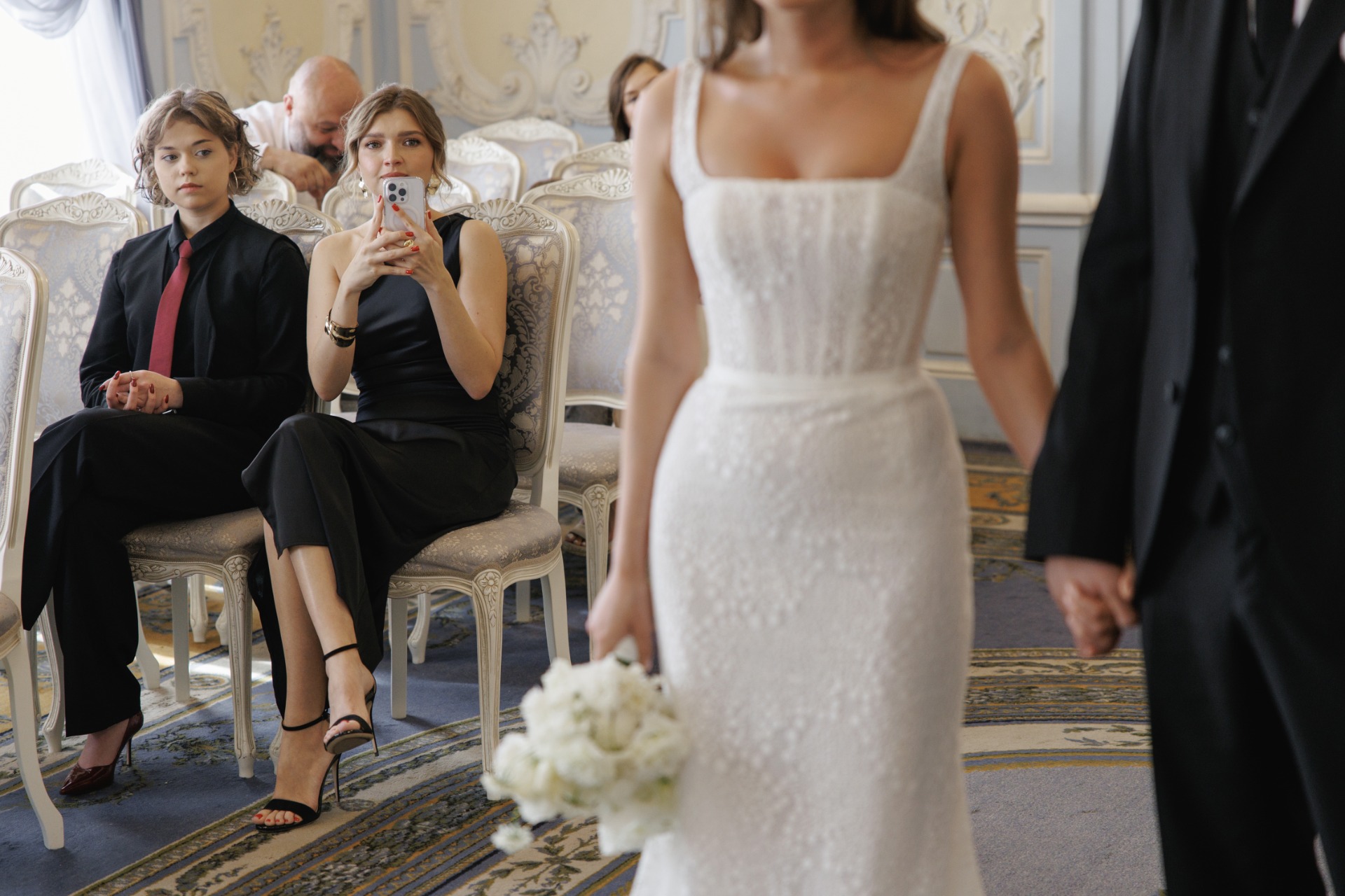 Хотелось воздушности и лёгкости, обязательно в центре Петербурга, где вырос жених, так мы выбрали особняк Путилова. Минимум цветов, необычная арка с важными словами из песен на берегу Невы, два стола без президиума, чтобы разделить все моменты с близкими, белые полевые нежные цветы и россыпь жемчуга на столах — так как я выросла на Сахалине. В каждой детали этого дня было что-то родное для нас.