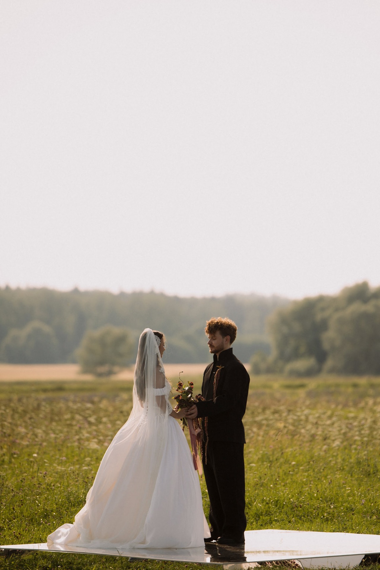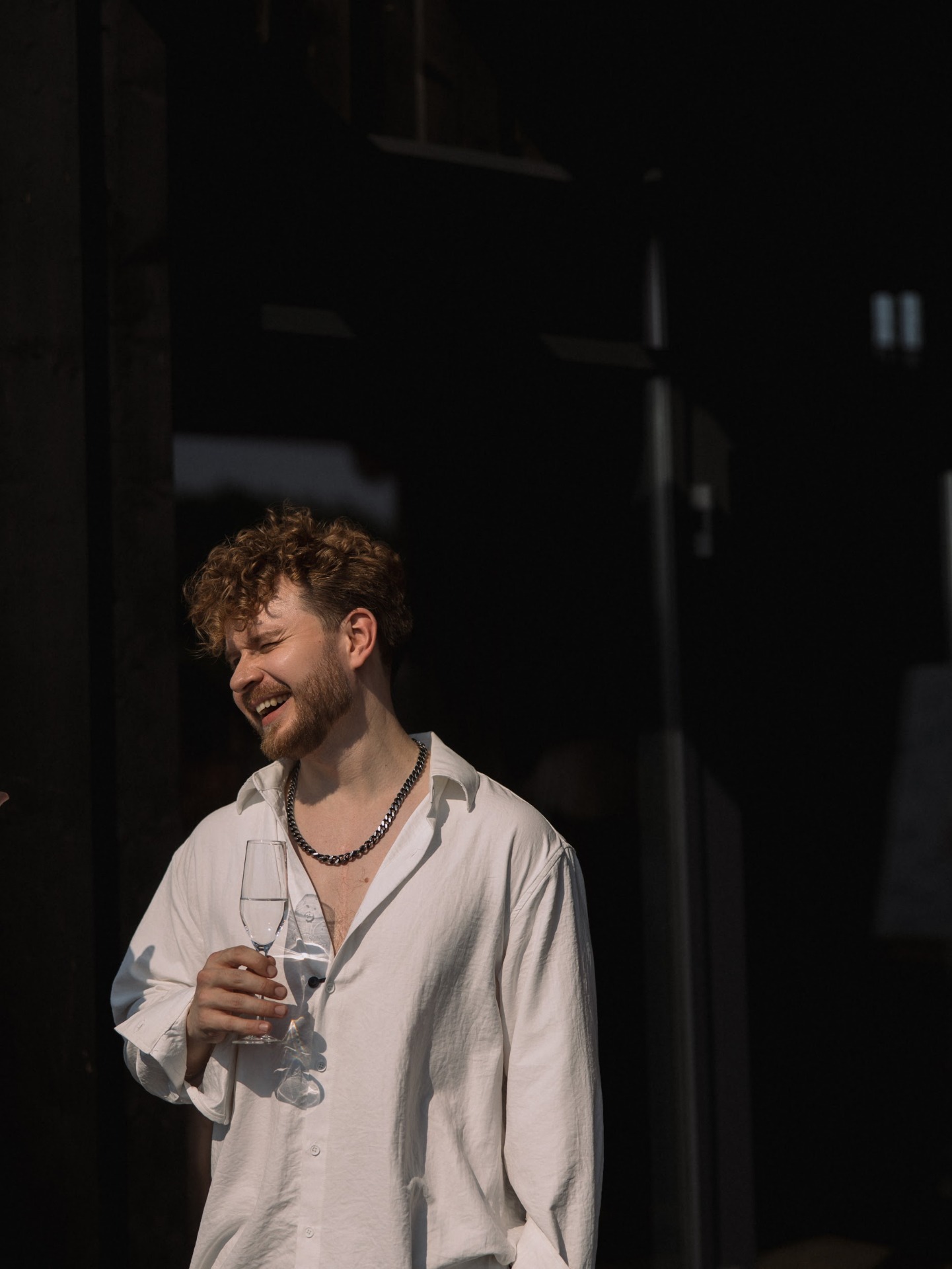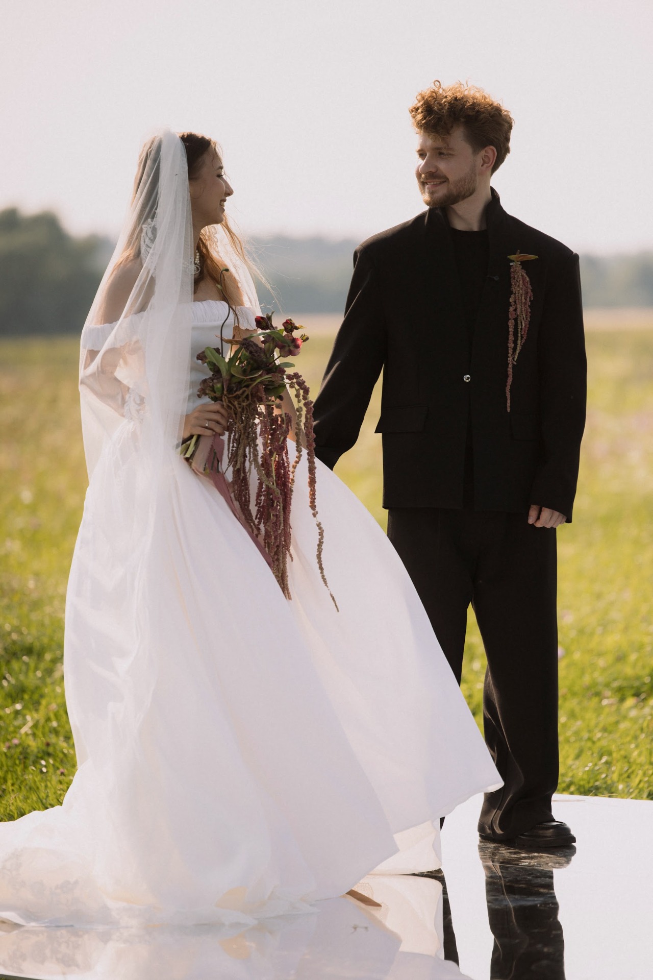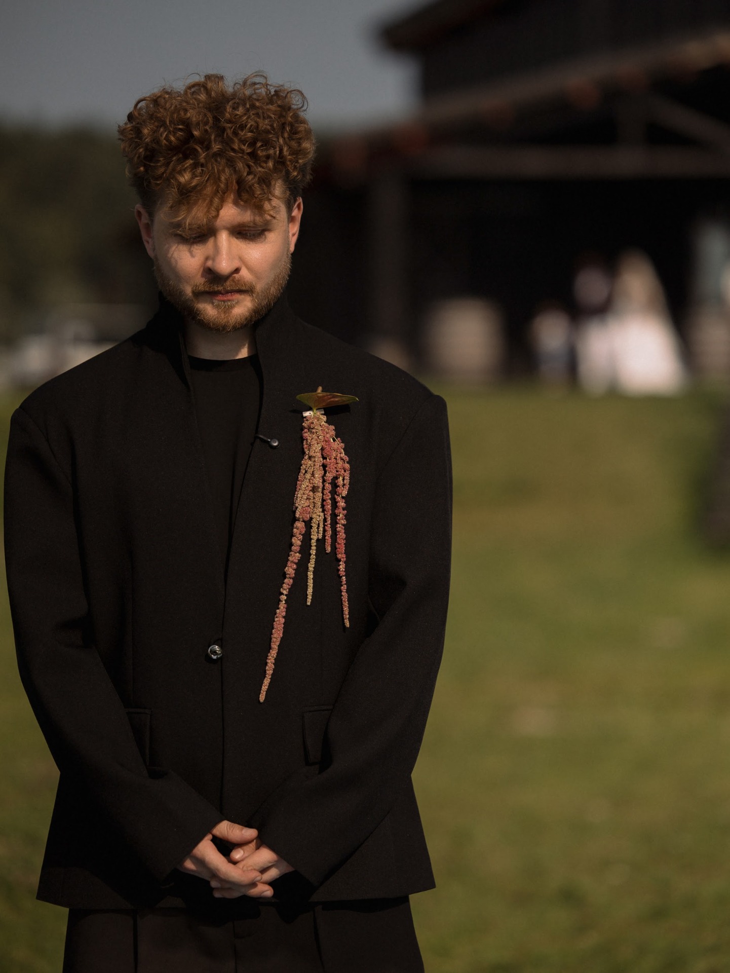 Для Гриши мы выбирали образ вместе: пиджак со стоячим воротником и брюки от бренда NonConcept. Его образ дополнила бутоньерка в стиле моего букета невесты.