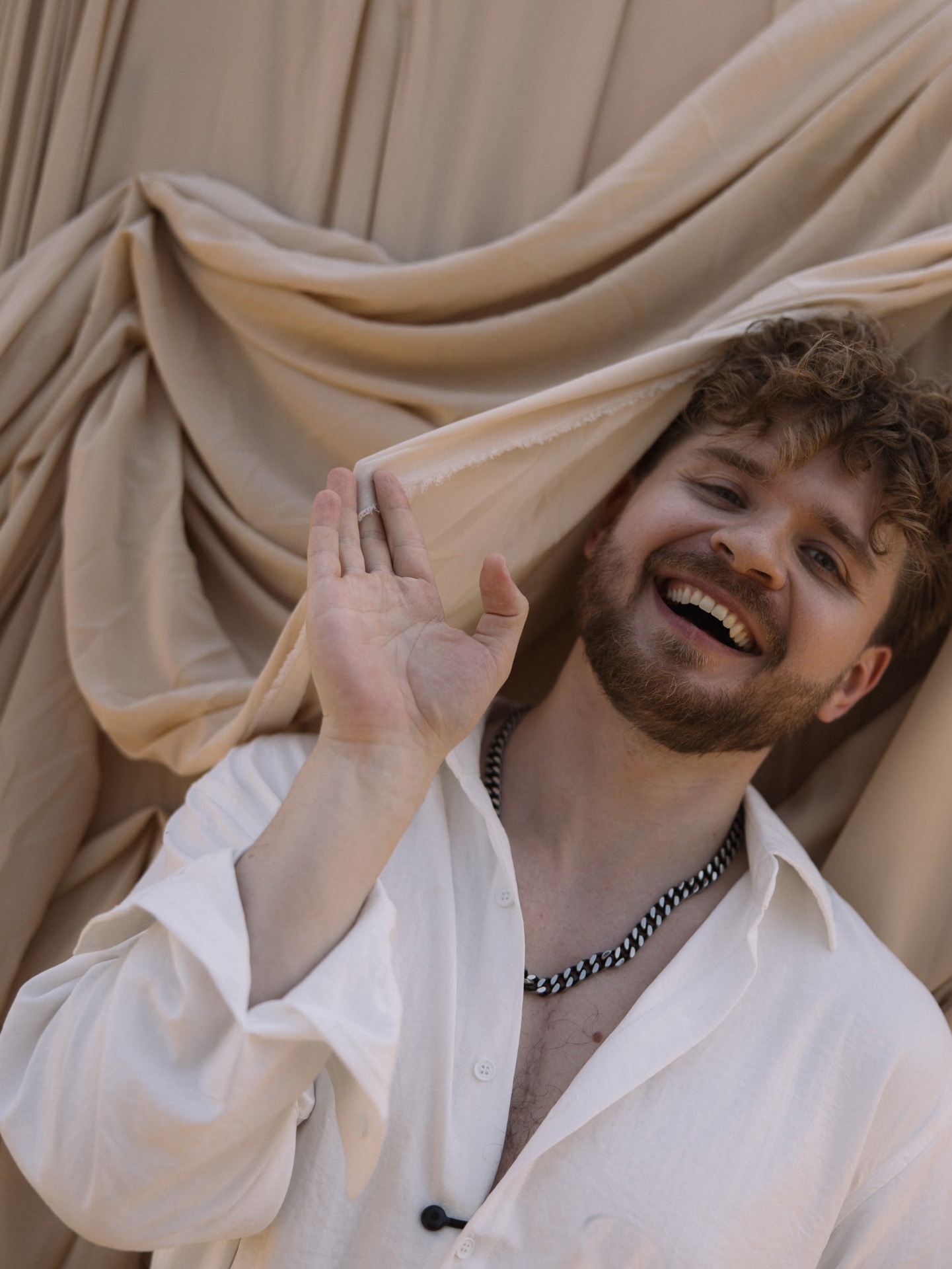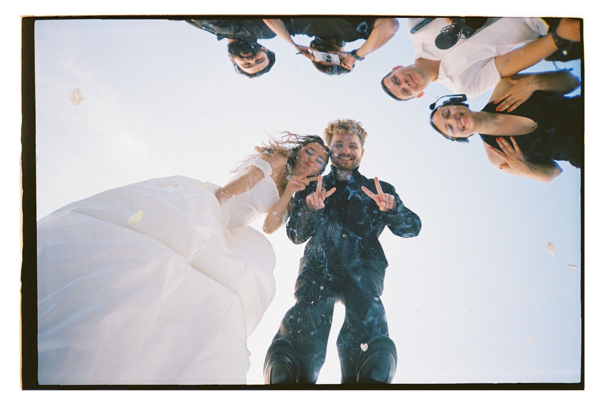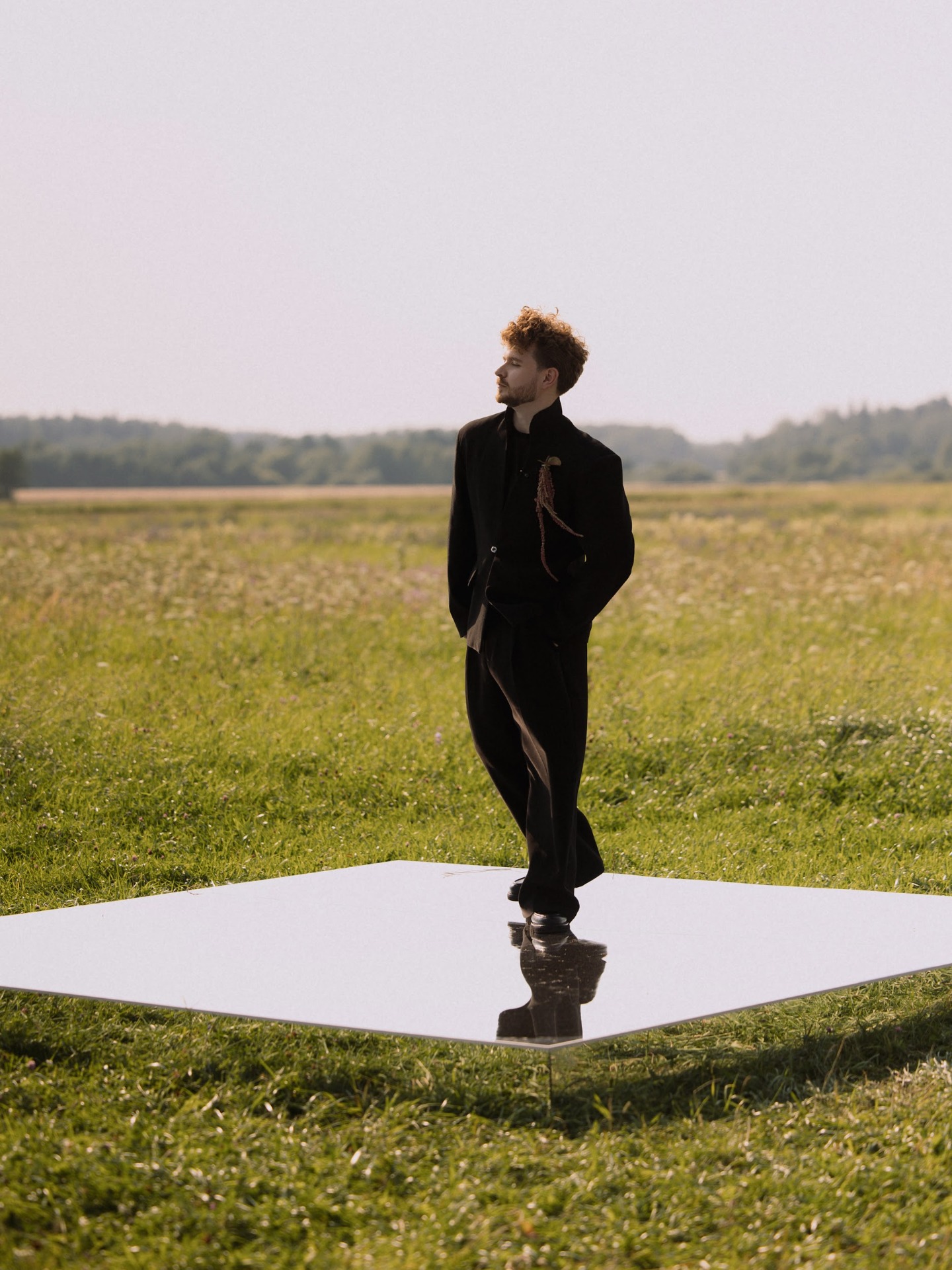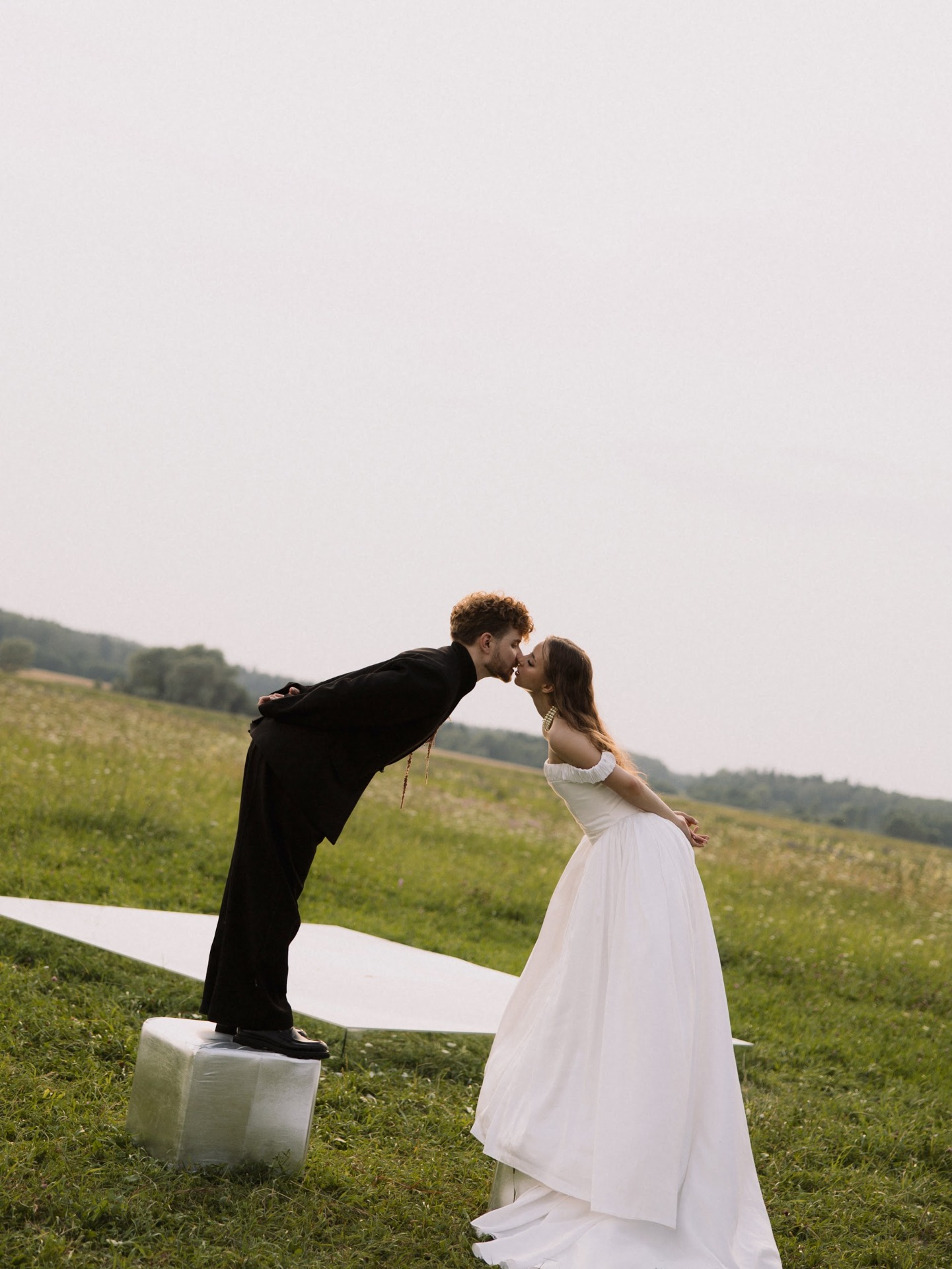 Для Гриши мы выбирали образ вместе: пиджак со стоячим воротником и брюки от бренда NonConcept. Его образ дополнила бутоньерка в стиле моего букета невесты.