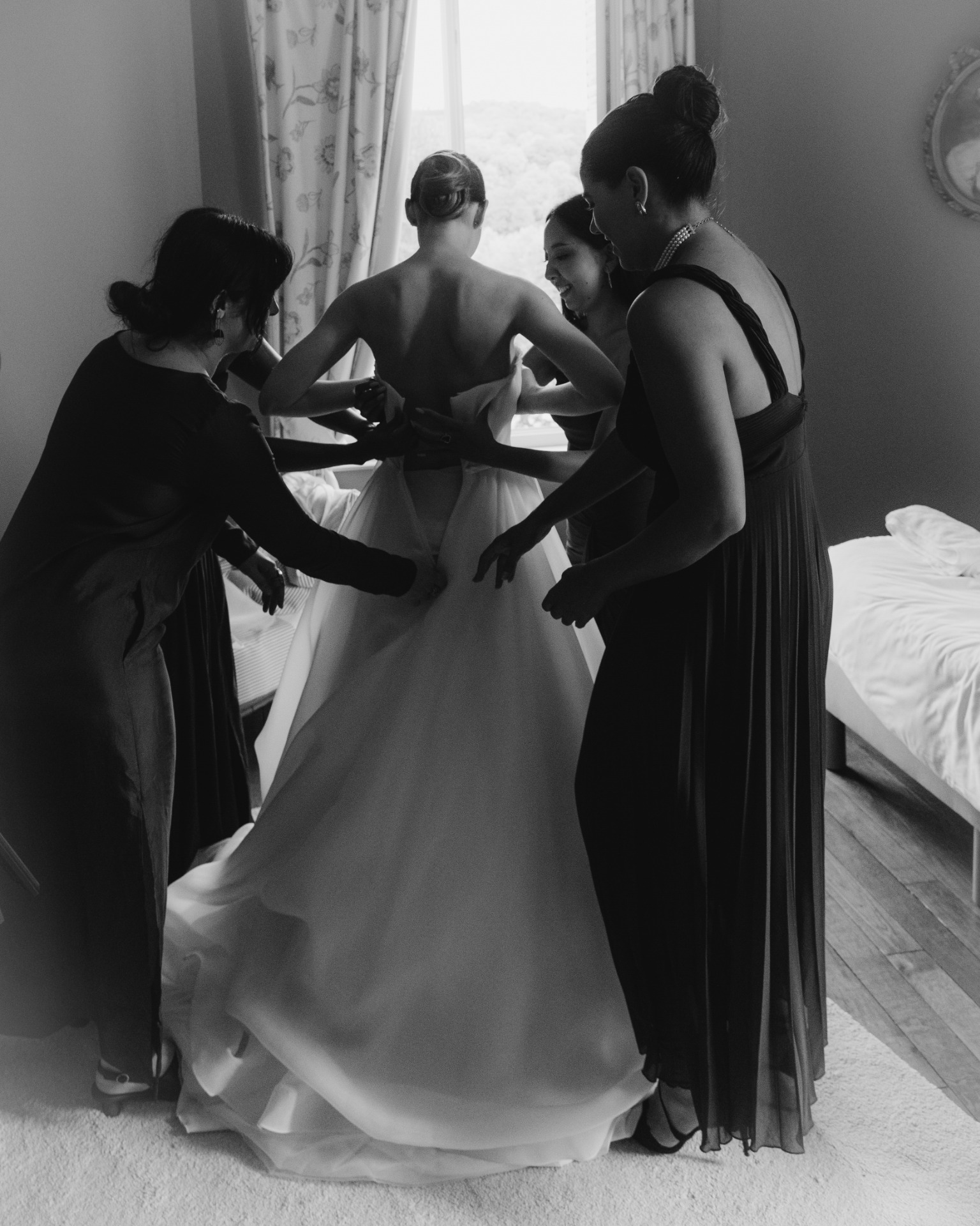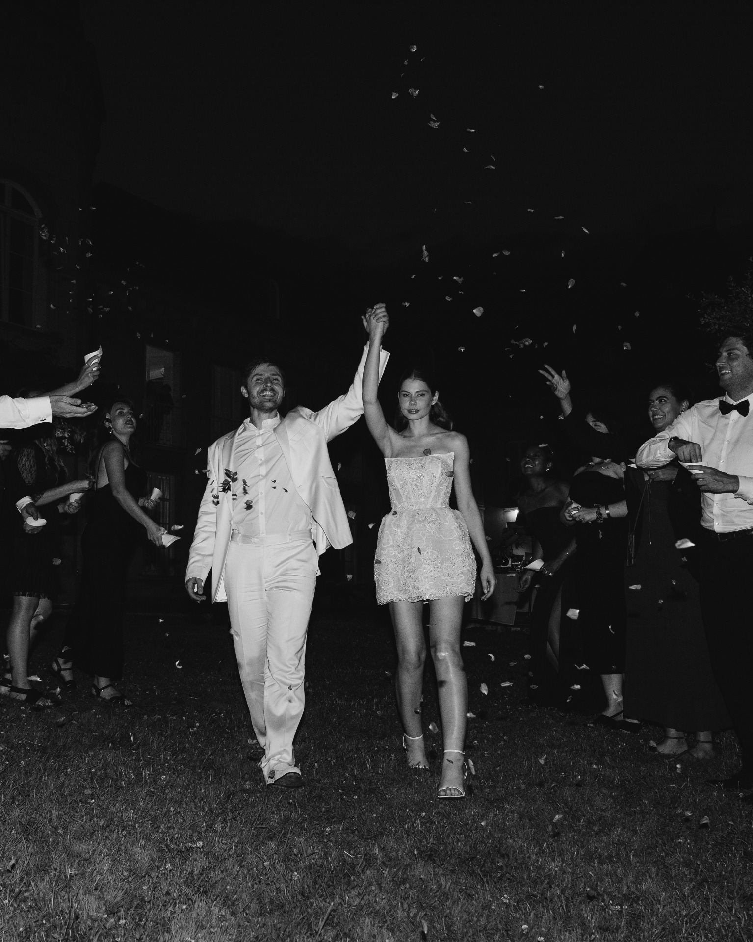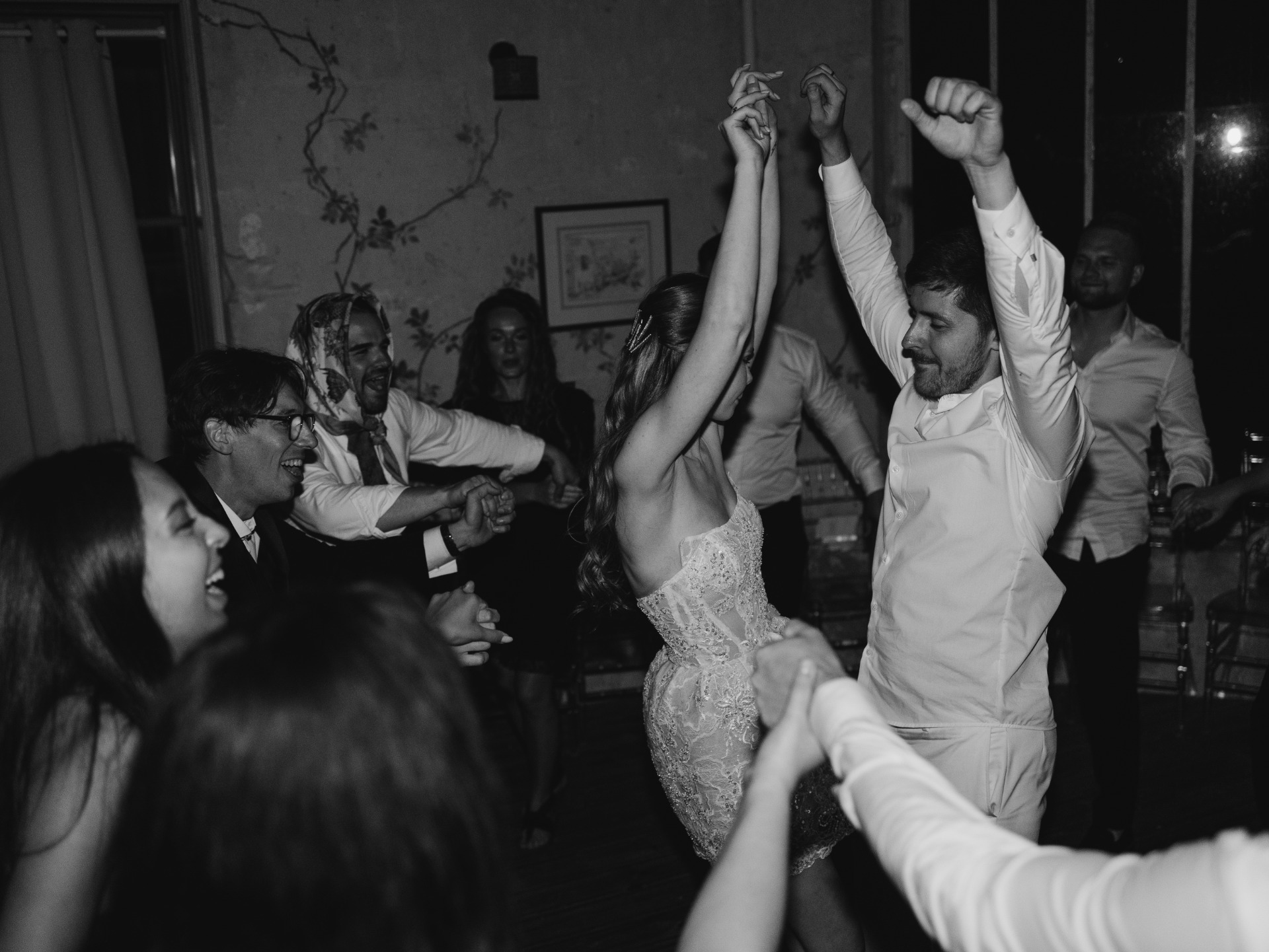 Свадьбу мы планировали в течение года, надеясь, что наши семьи смогут собраться вместе ради такого события. Изначально мы хотели камерное торжество на 20–30 гостей, на которое пригласили родных и друзей со всего мира. Клятвы и меню мы перевели на четыре языка, а на каждом приглашении сделали пометку: «Если вы не ответите до мая, захватите с собой стул и сендвич».