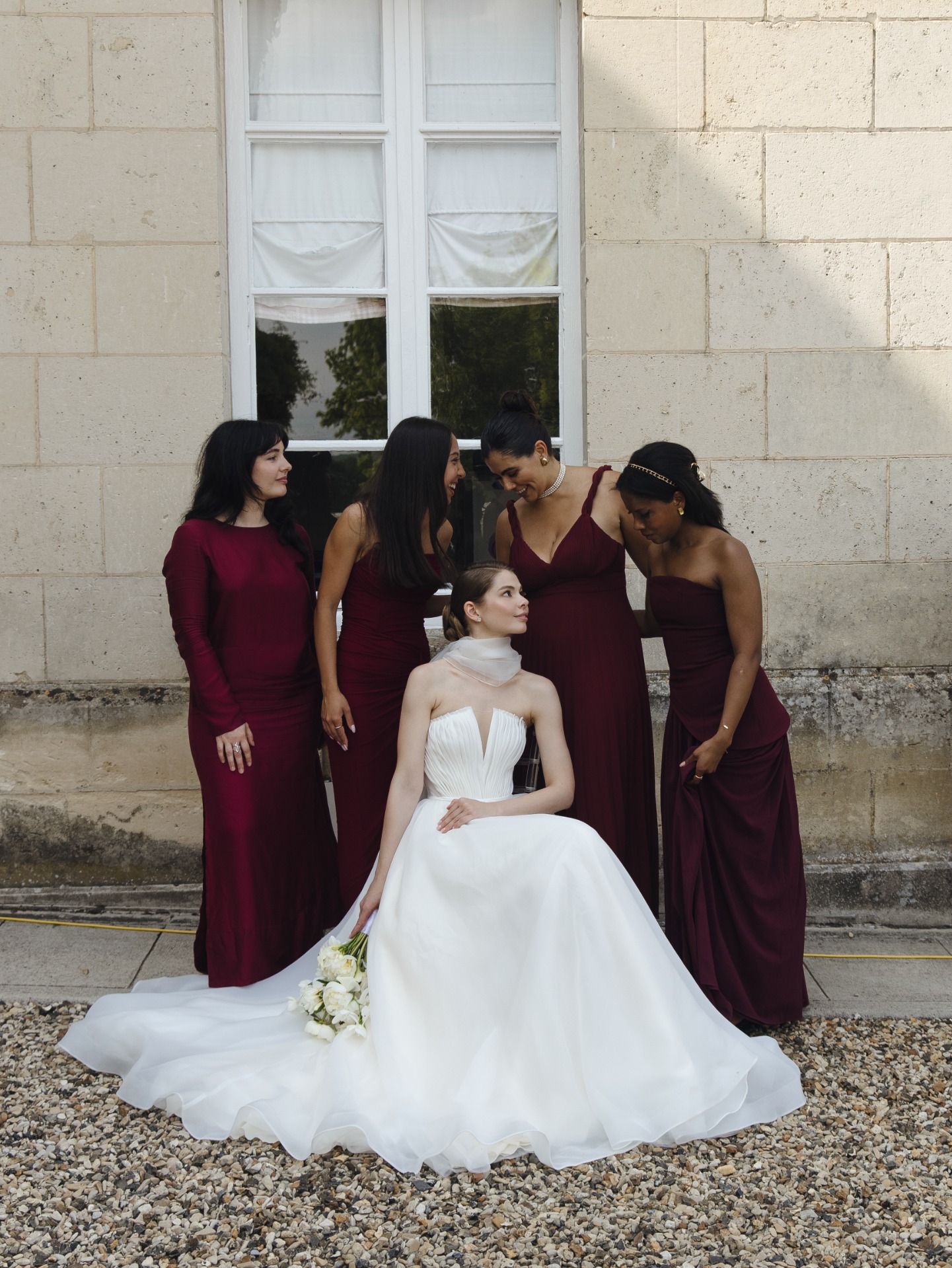 Для подружек невесты мы выбрали бордовую палитру в честь винного региона, в котором проходил наш праздник. А для единственного друга невесты мы попросили флористов подготовить бутоньерку в тон платьев подружек.
