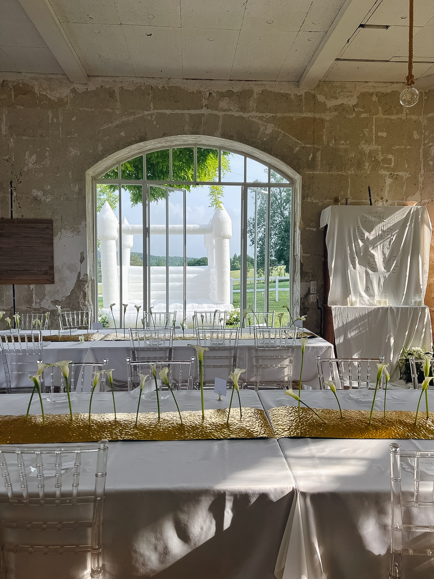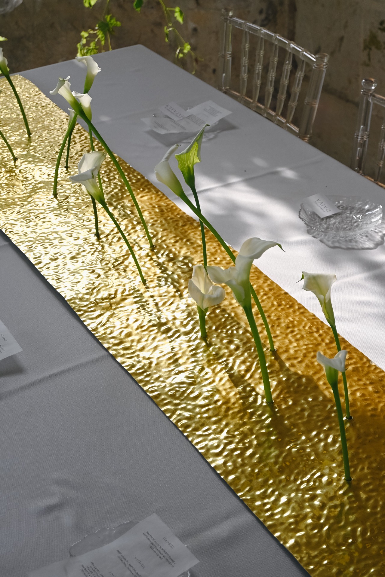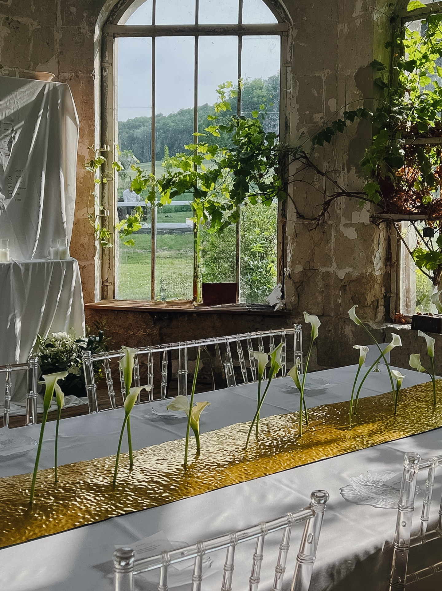 В итоге мы выбрали текстуру воды в качестве основной концепции, чтобы создать контраст с нашей площадкой. Водные мотивы повторялись в деталях ужина, были отражены на посуде и стойках для цветов. А каллы дополняли прозрачность и воздушность нашей задумки.