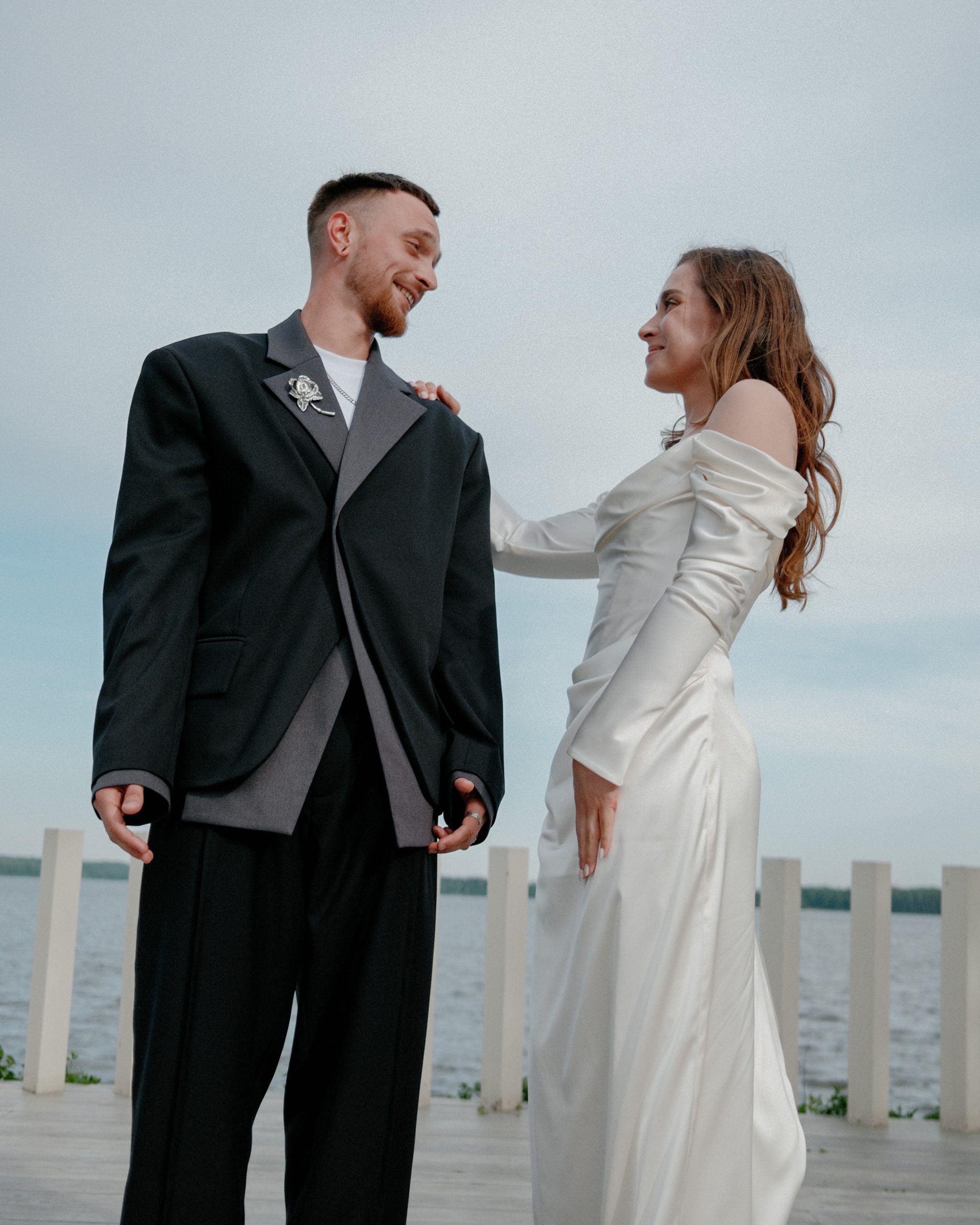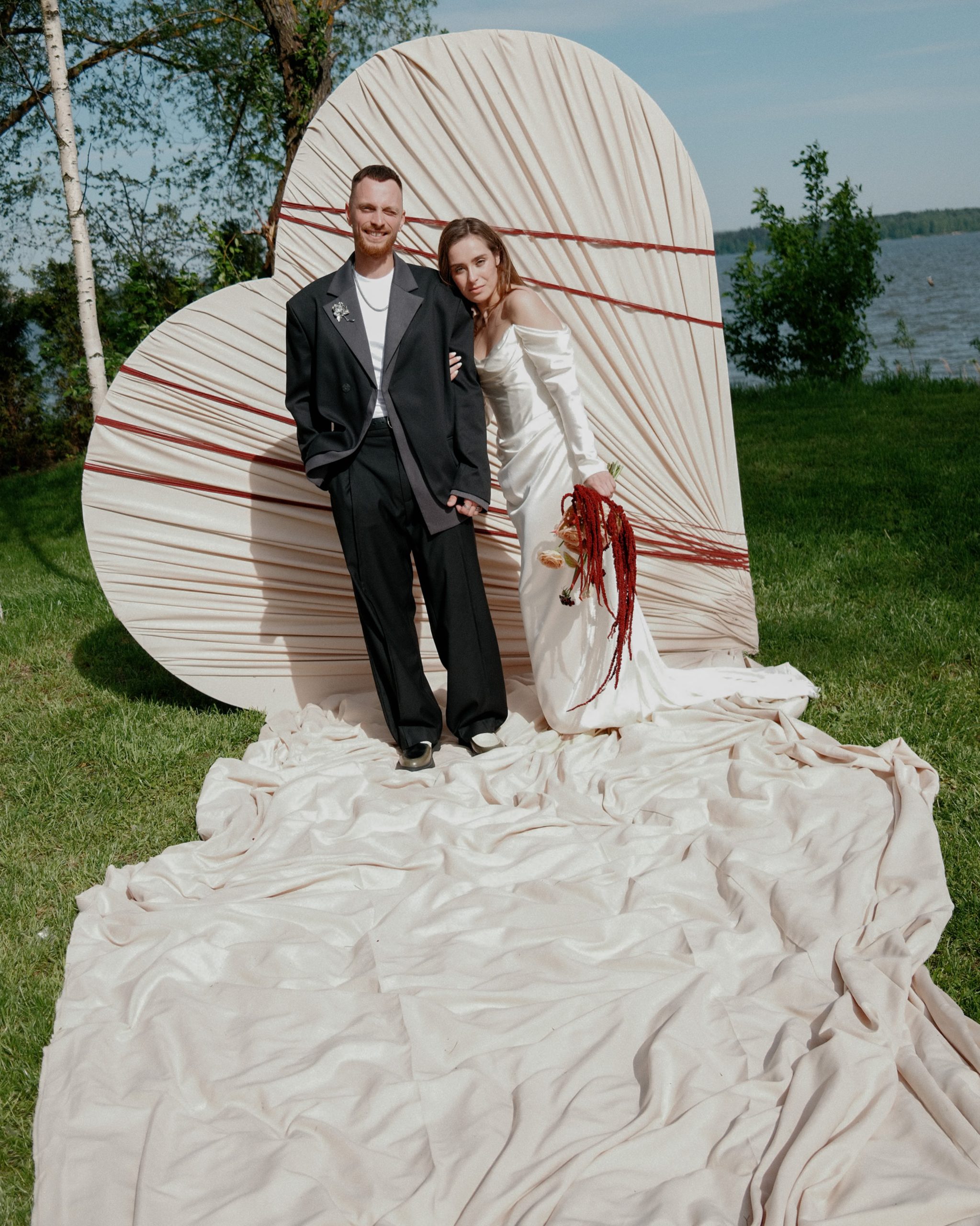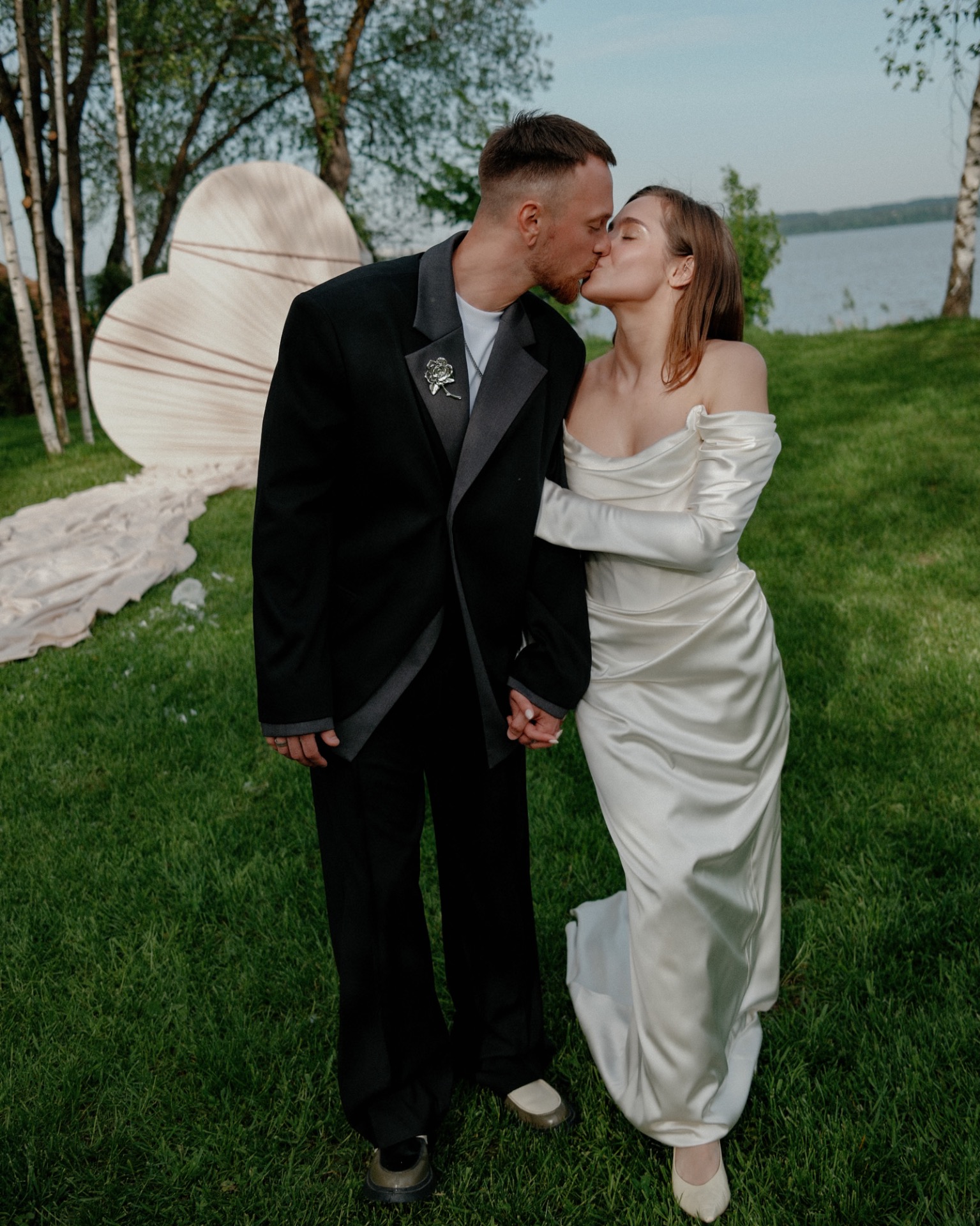 С платьем всё тоже получилось не сразу. Я шила его на заказ, но с каждой примеркой понимала: не могу полюбить то, что получается. Почти в отчаянии я зашла в салон Анастасии Бокши, померила платье и влюбилась. Наконец появилось ощущение: это точно оно. Огромное спасибо Насте за то, что она сшила для меня это платье с нуля всего за две недели. Оно получилось идеальным — стильным, с лёгким винтажным настроением. Я сразу влюбилась в ткань: мне не хотелось белоснежного платья, а у Насти оказалась роскошная, немного кремовая ткань с деликатным блеском.