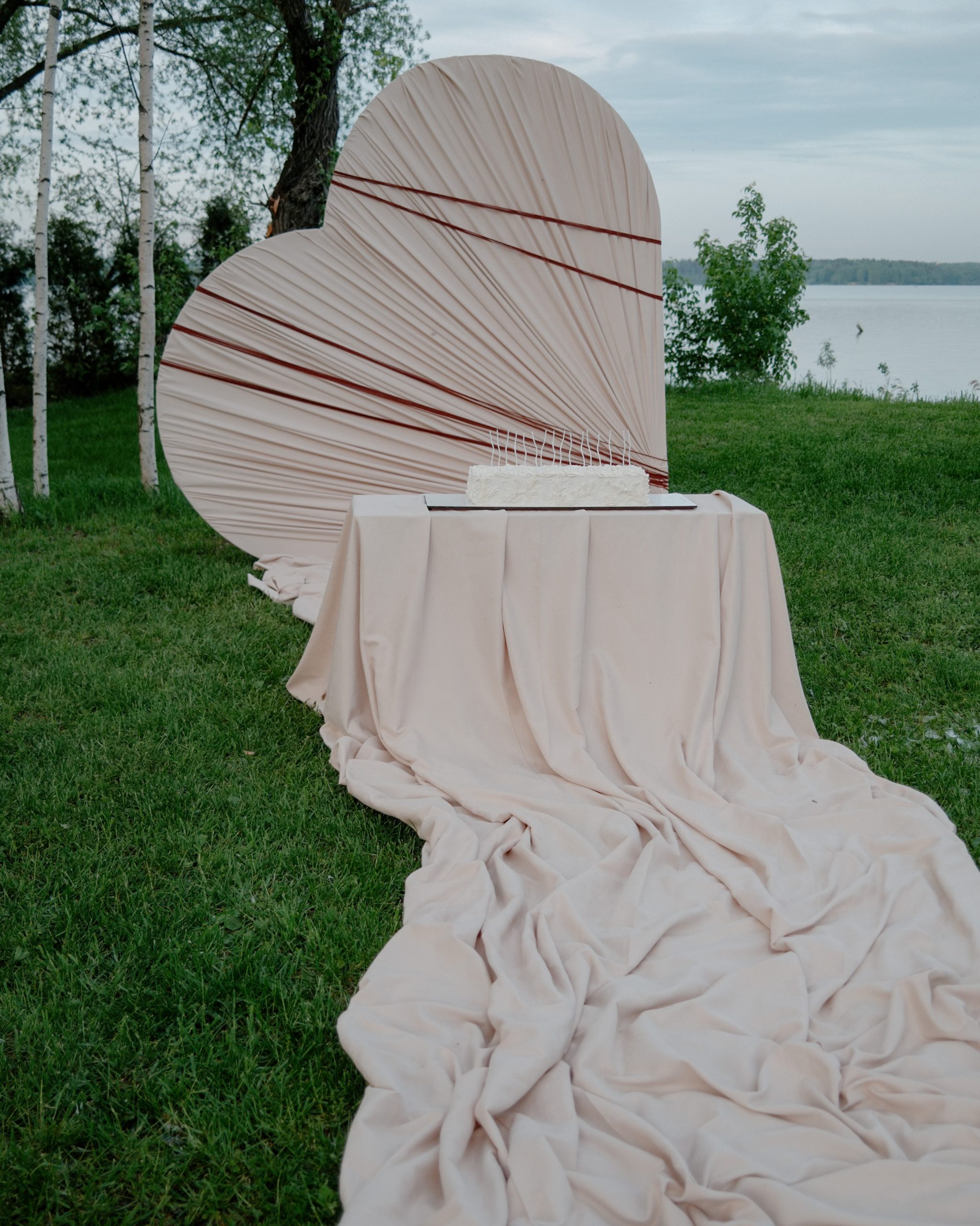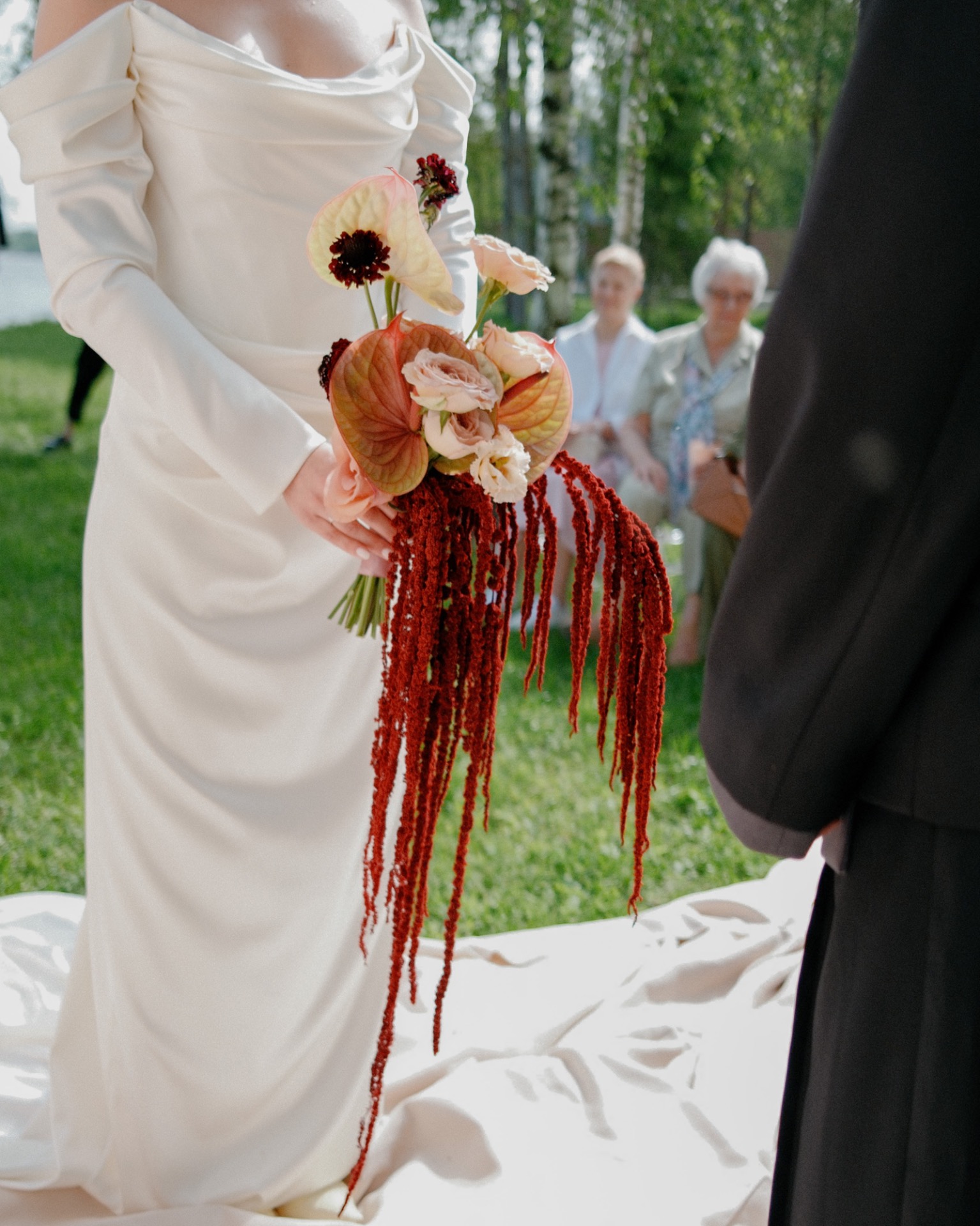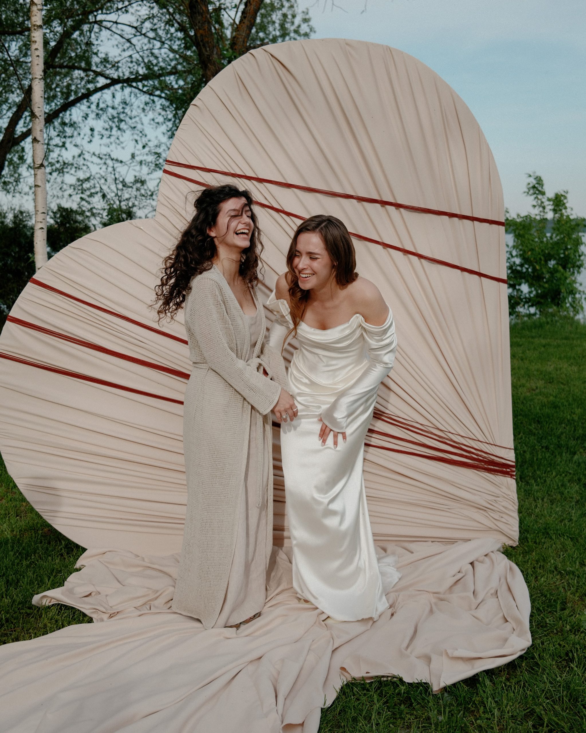 С платьем всё тоже получилось не сразу. Я шила его на заказ, но с каждой примеркой понимала: не могу полюбить то, что получается. Почти в отчаянии я зашла в салон Анастасии Бокши, померила платье и влюбилась. Наконец появилось ощущение: это точно оно. Огромное спасибо Насте за то, что она сшила для меня это платье с нуля всего за две недели. Оно получилось идеальным — стильным, с лёгким винтажным настроением. Я сразу влюбилась в ткань: мне не хотелось белоснежного платья, а у Насти оказалась роскошная, немного кремовая ткань с деликатным блеском.