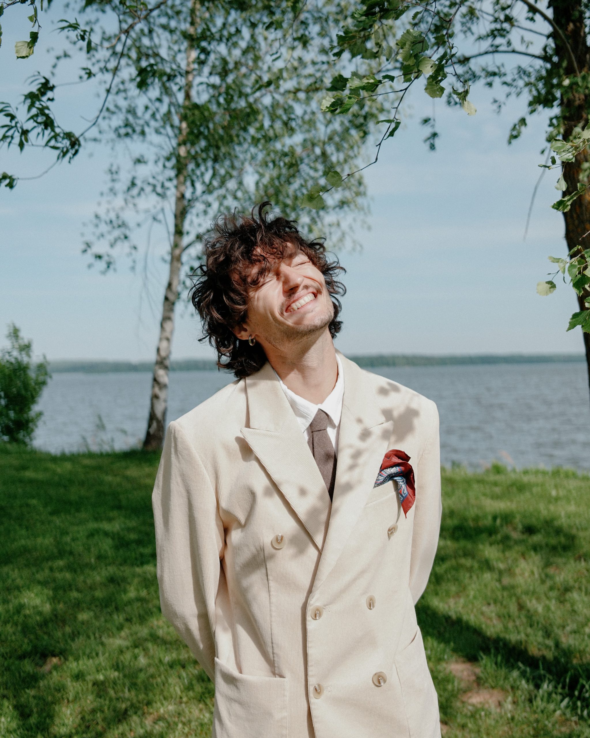 Образ Влада мы подобрали довольно быстро, костюм нашли в магазине «Черным черно». Он сразу идеально сел. Акцент на плечи, косая линия лацканов, сборка на спине — в образе чувствовалось немного театральности. Дополнением к образу стали разноцветные лоферы от Camper.