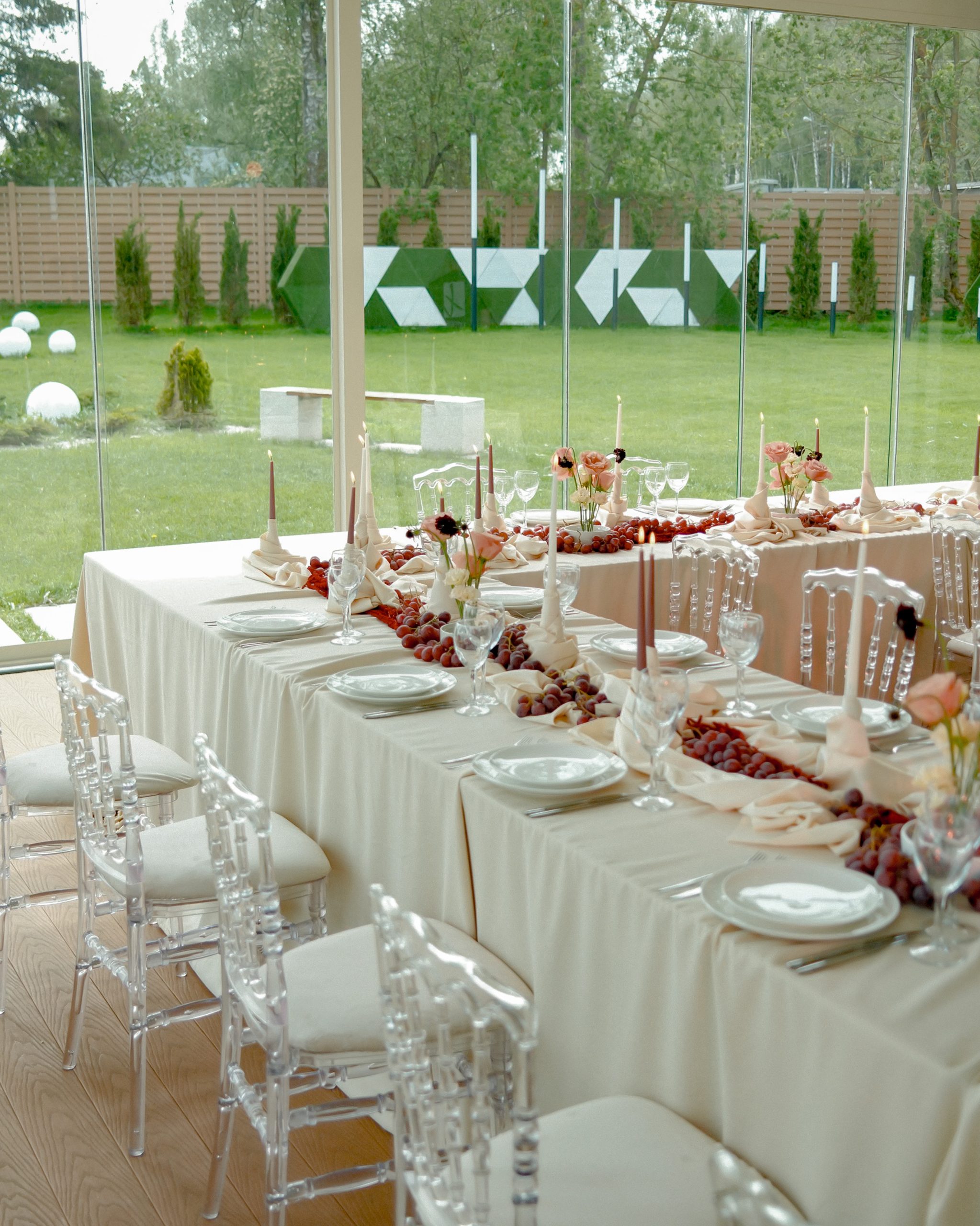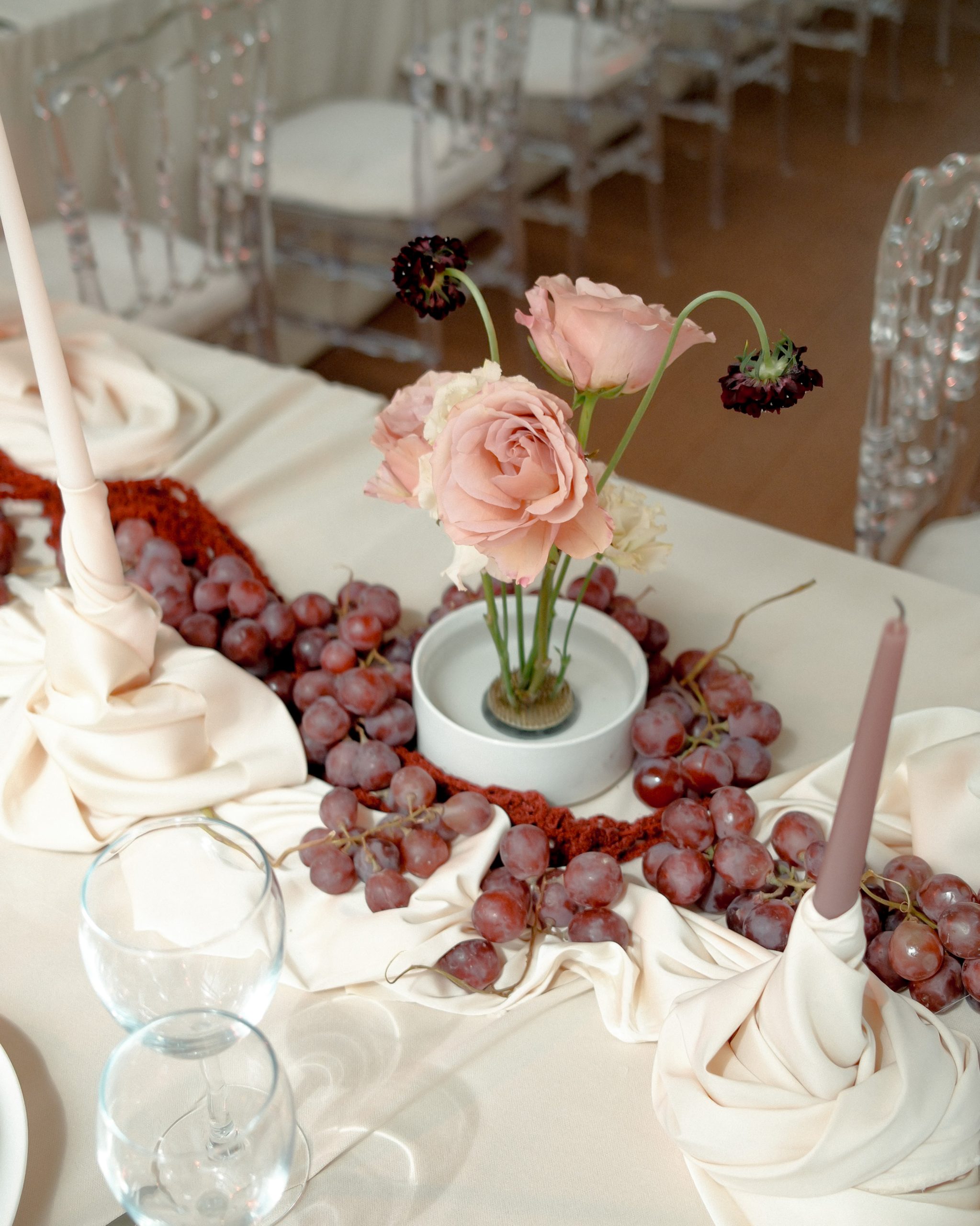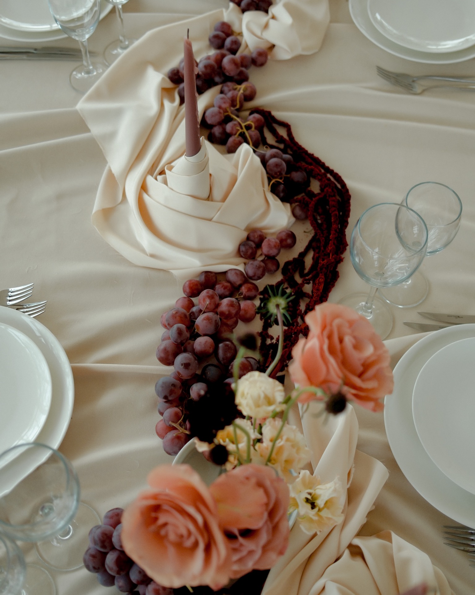 Мы любим винтаж и хотели, чтобы в оформлении свадьбы это чувствовалось. Отсюда и цветовая палитра: пыльная роза, винный, крем-брюле. Драпировки и сочетание тканей разных фактур тоже создавали нужное настроение. На столах были тёмный виноград, пыльные розы и необычные цветы — всё это идеально вписывалось в нашу концепцию.