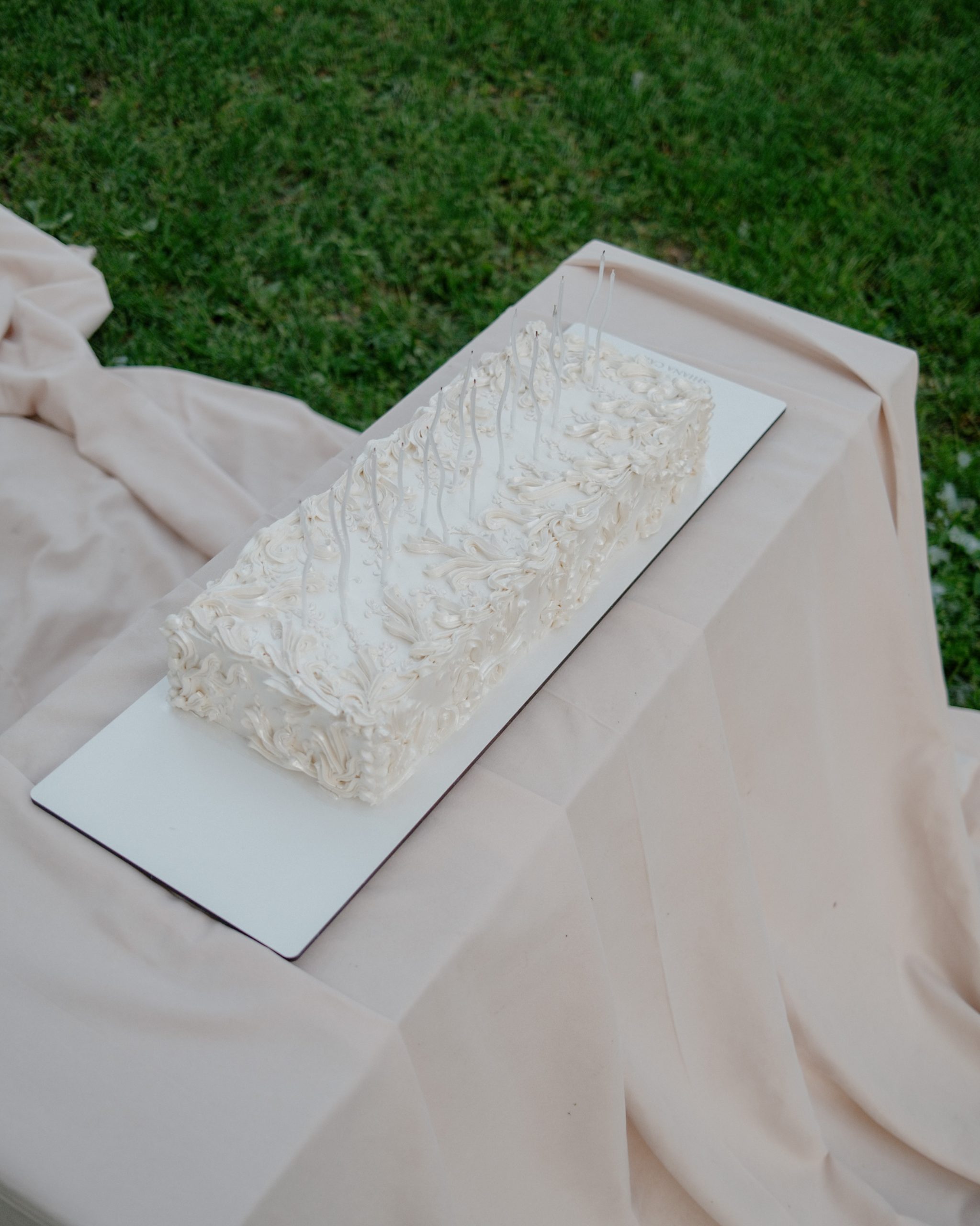 Торт мы оформили рюшами с перламутровым финишем, он был вытянутой формы, чтобы можно было задуть свечи, как сейчас модно.