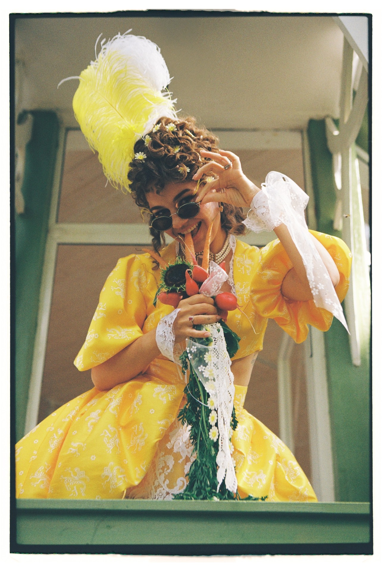 Дресс-код для гостей мы описали шутливыми образами: «грозовое небо», «глаза котёнка», «хрустящие простыни», «цветы огурца и капустного качана». А в качестве букета я выбрала пучок редиски и морковки с подсолнухом.