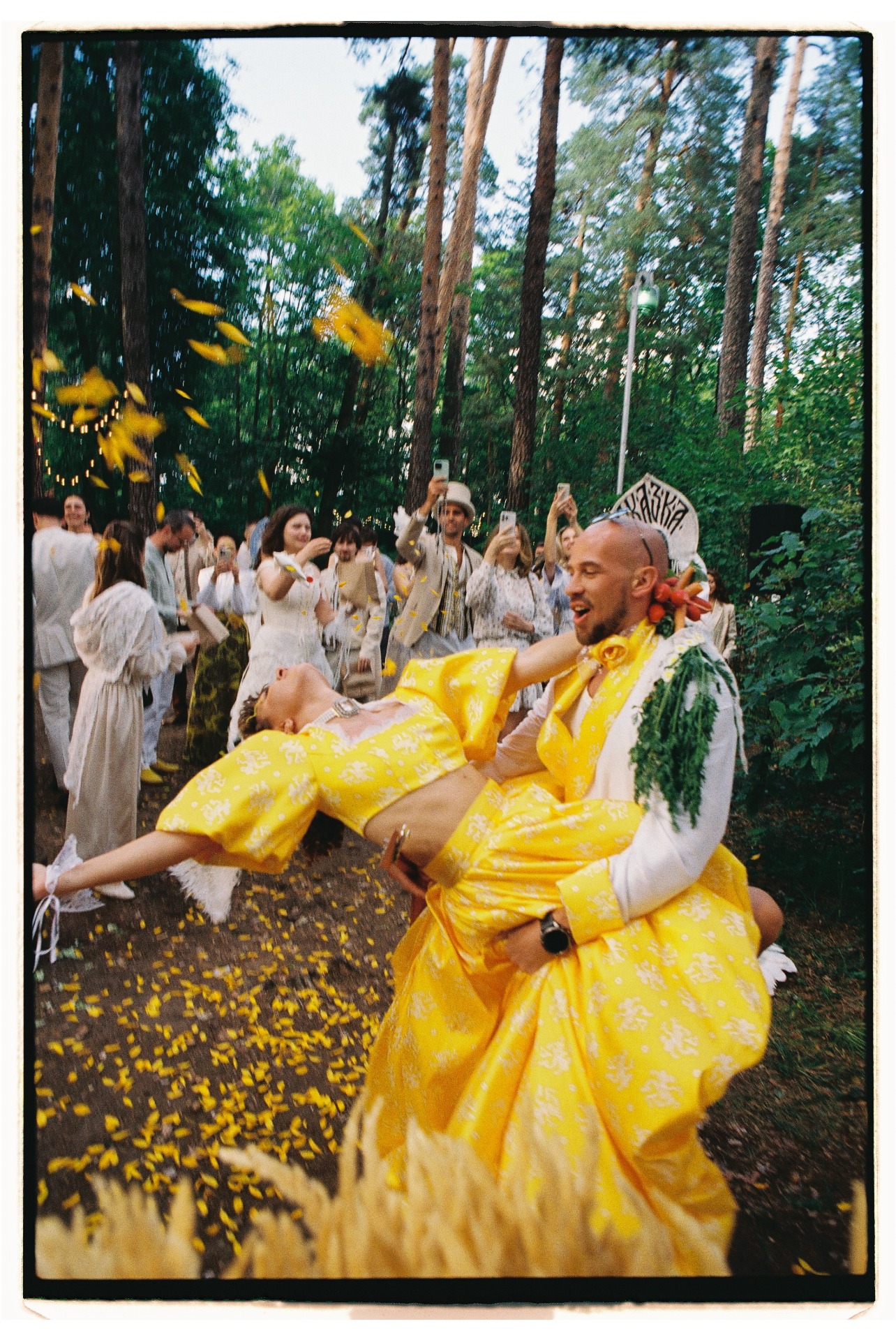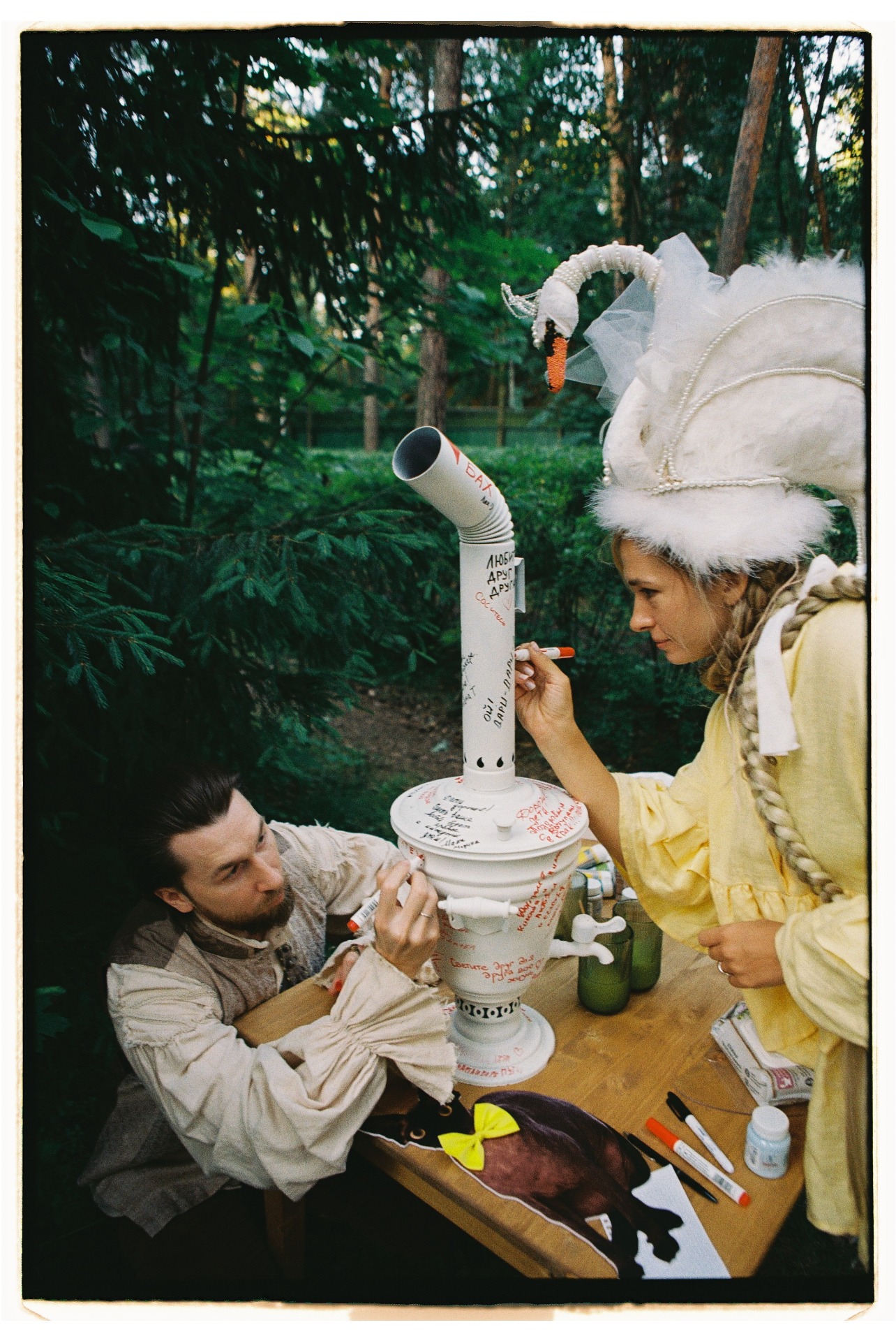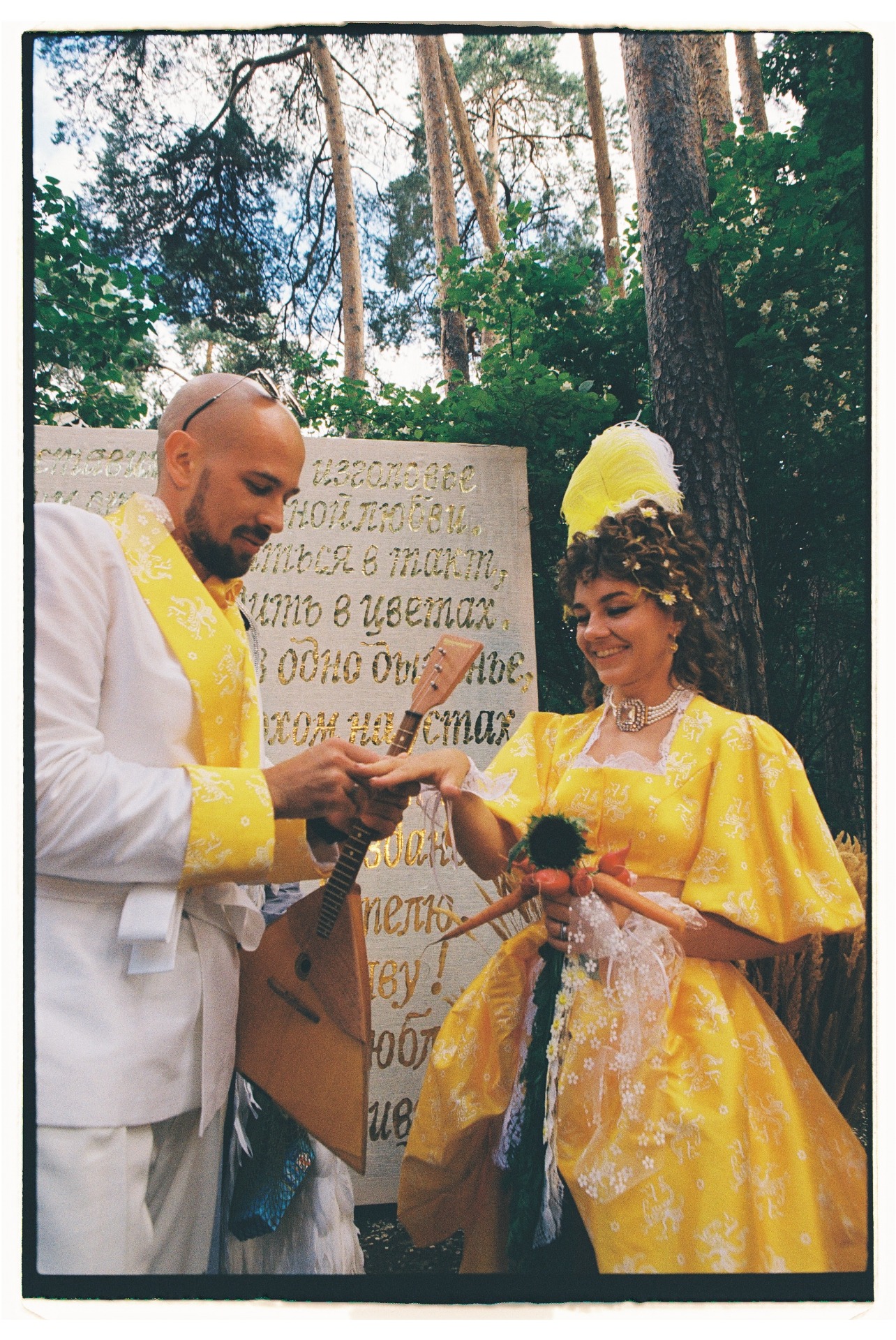 Традицию «украсть невесту» мы тоже обыграли: Дима строгал полено, выпил три литра берёзового сока, залез на дерево и угадывал свою «царевну» среди подружек в надувных лягушках.