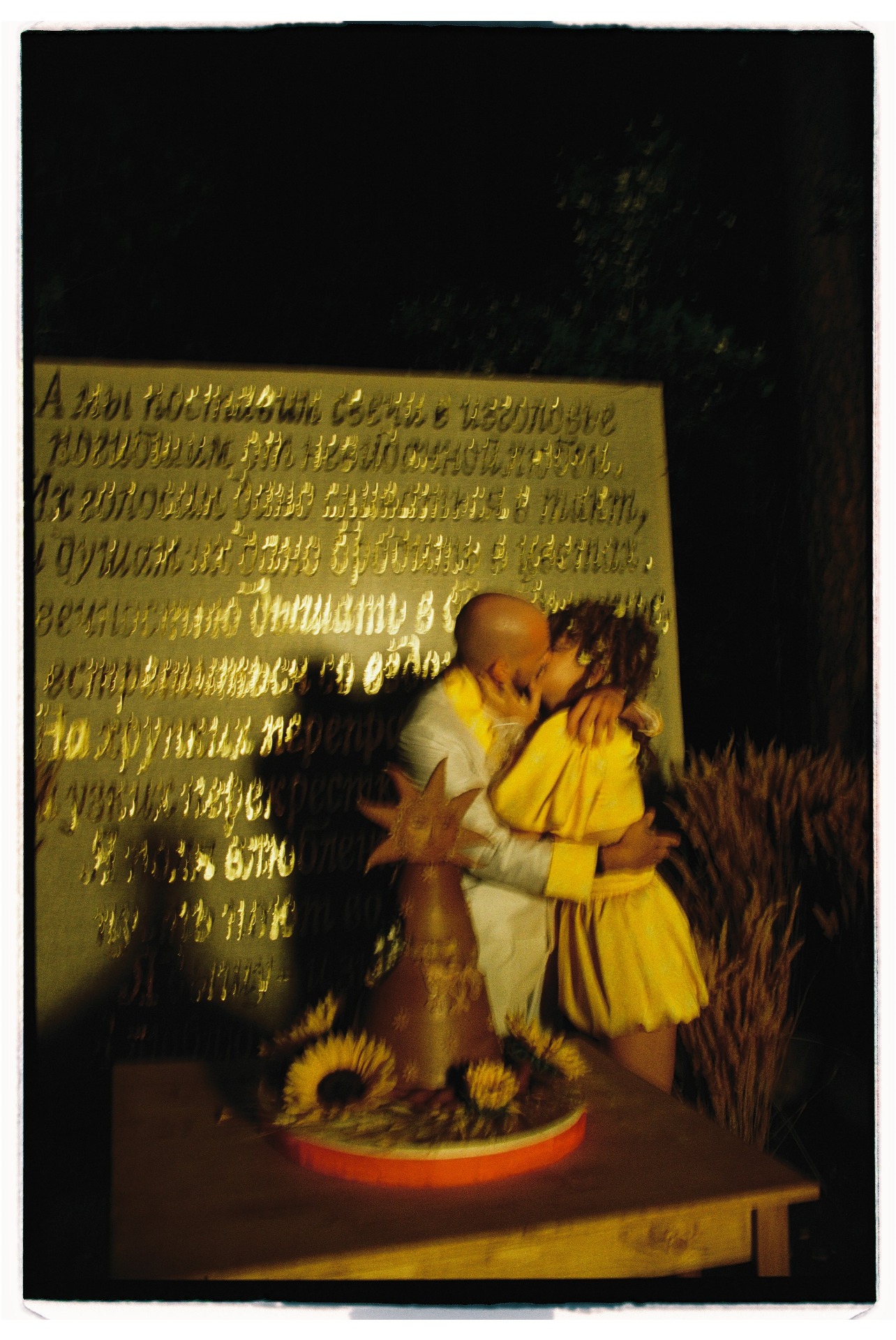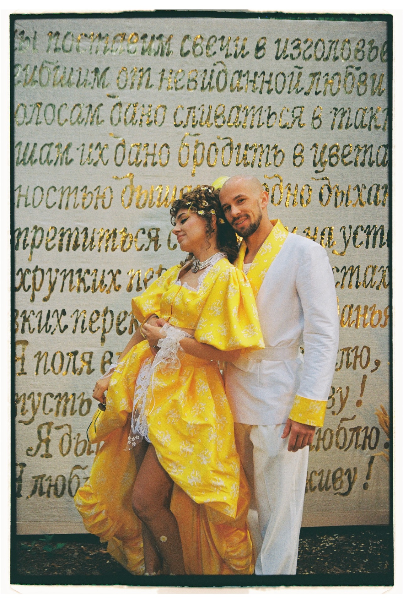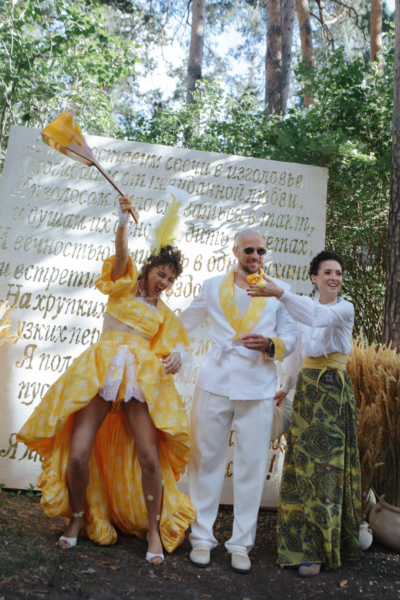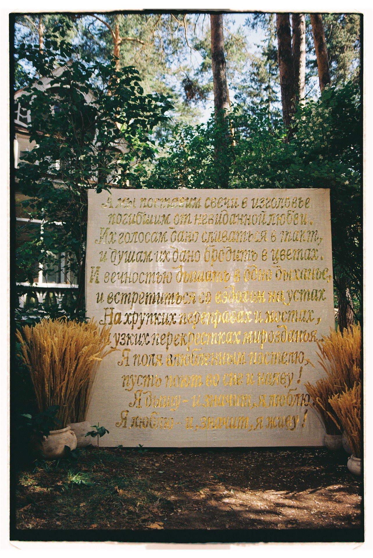 В центре церемонии мы разместили панно, сделанное в виде золотой аппликации на необработанном льне со стихами Высоцкого из «Баллады о любви». Этот арт-объект сделал для нас художник Большого театра, а после свадьбы панно переехало с нами в Доху и стало сердцем нашего дома.