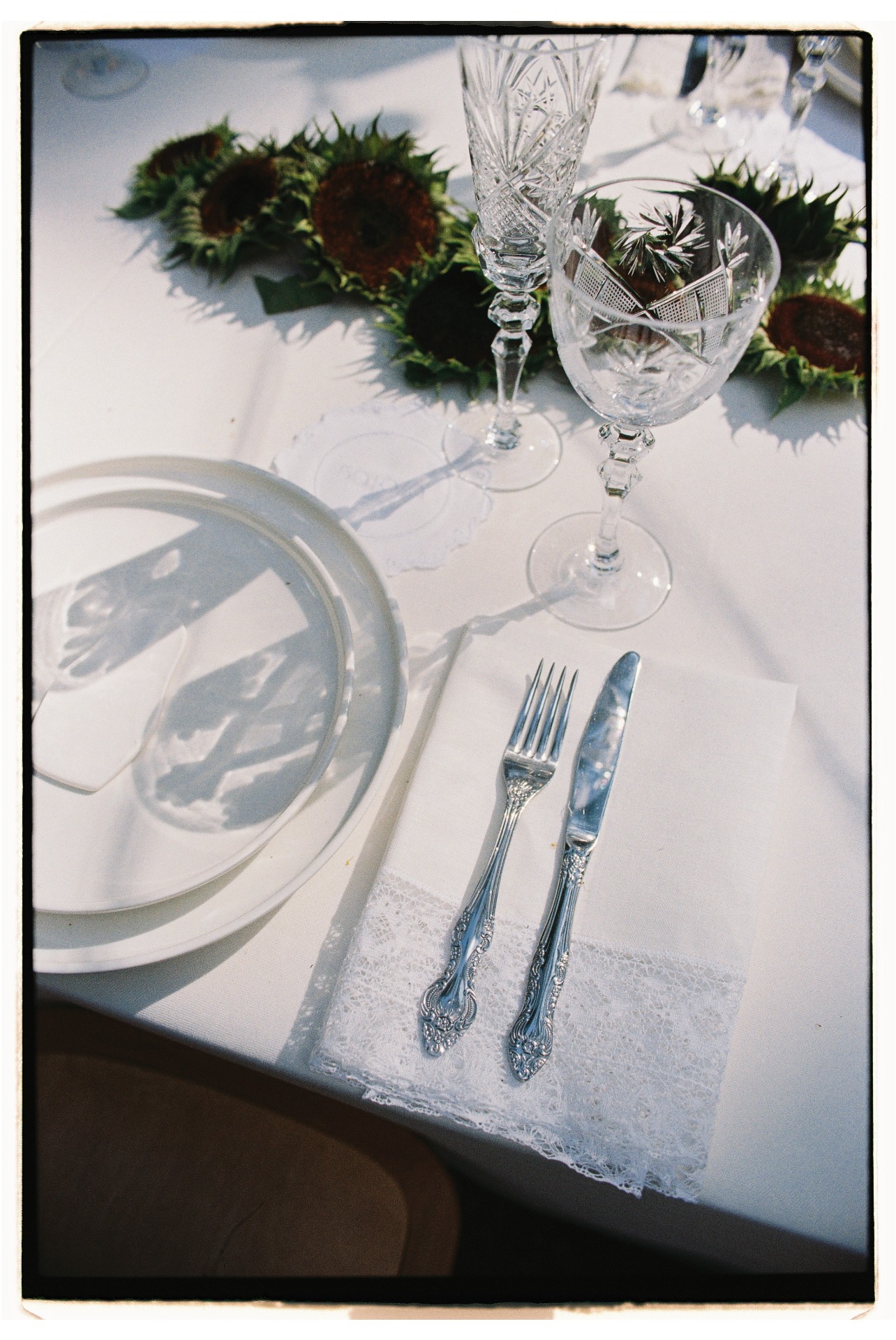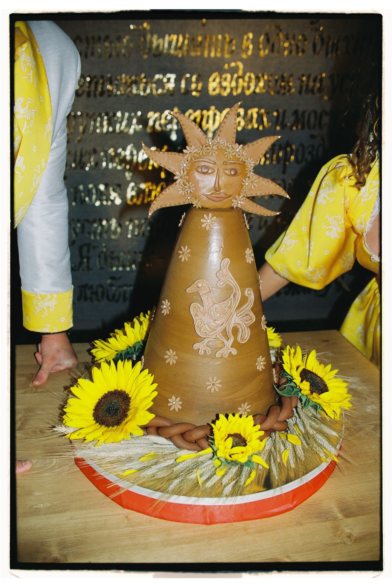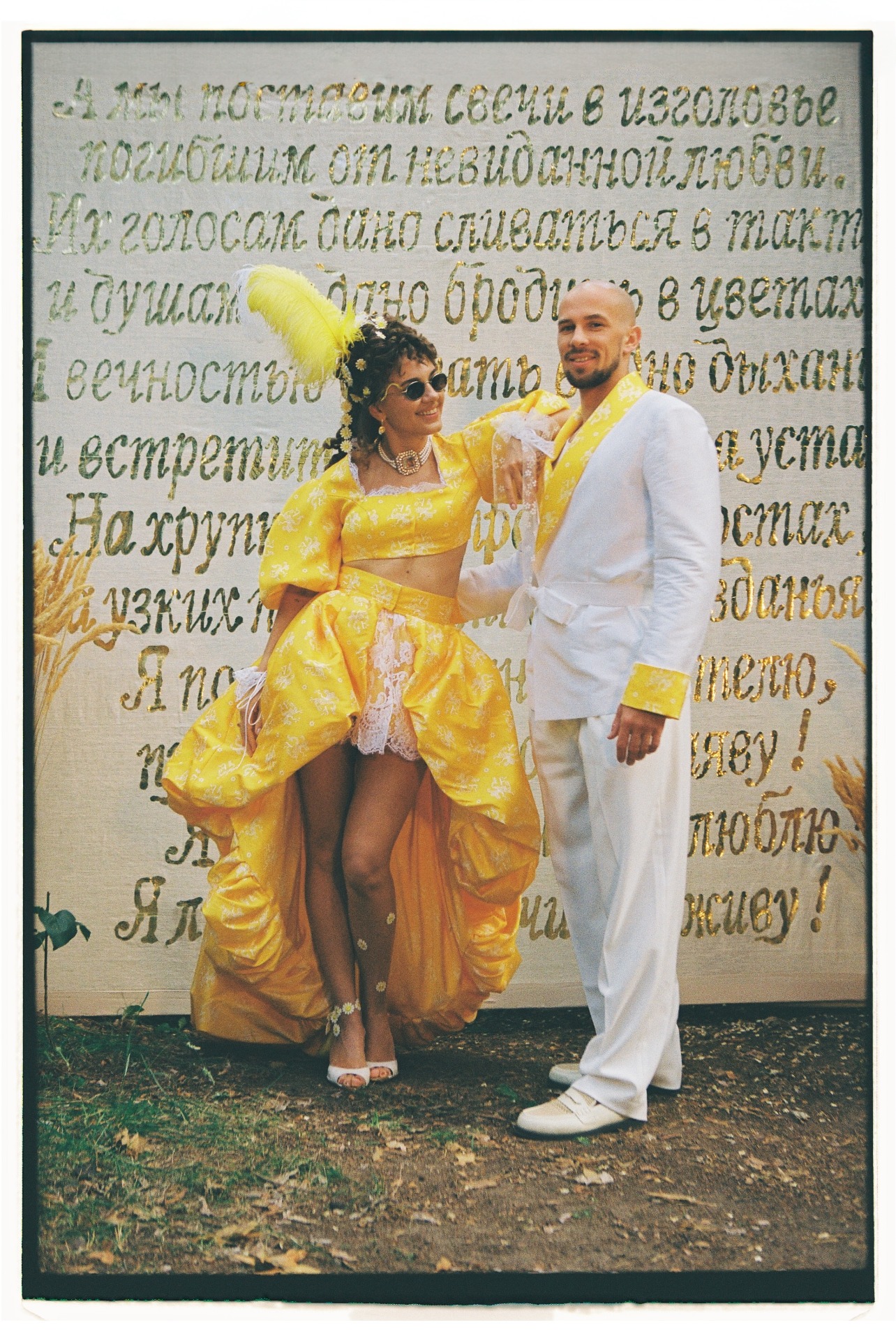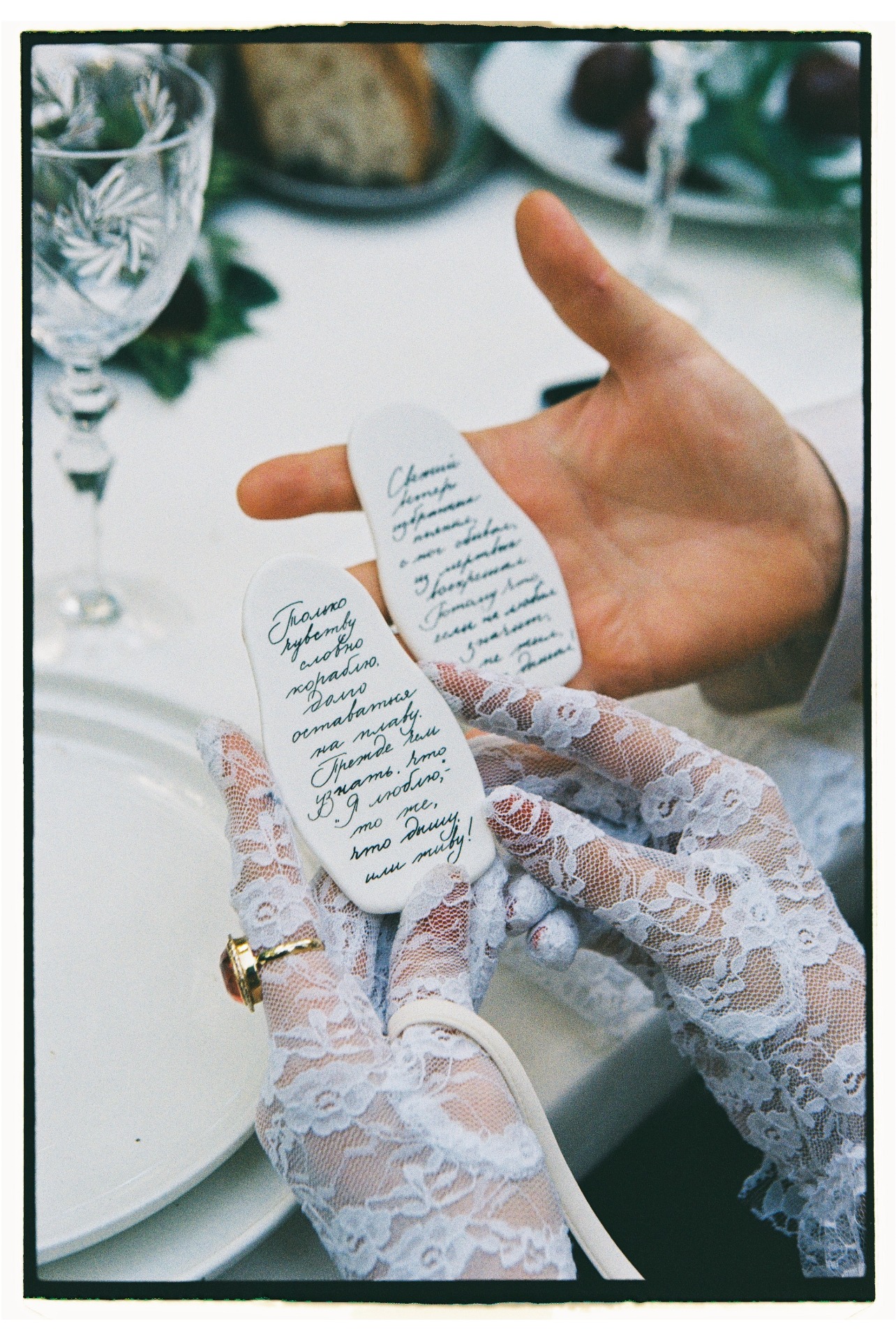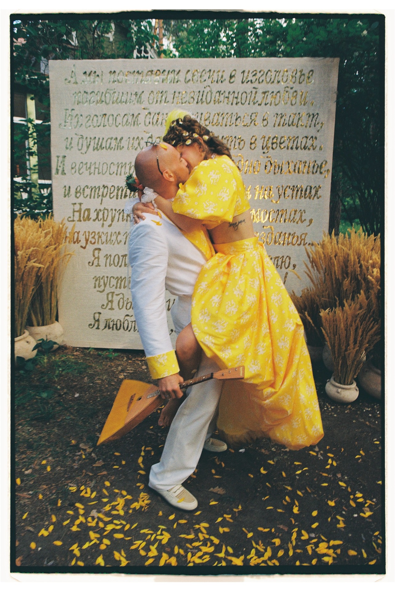 В центре церемонии мы разместили панно, сделанное в виде золотой аппликации на необработанном льне со стихами Высоцкого из «Баллады о любви». Этот арт-объект сделал для нас художник Большого театра, а после свадьбы панно переехало с нами в Доху и стало сердцем нашего дома.