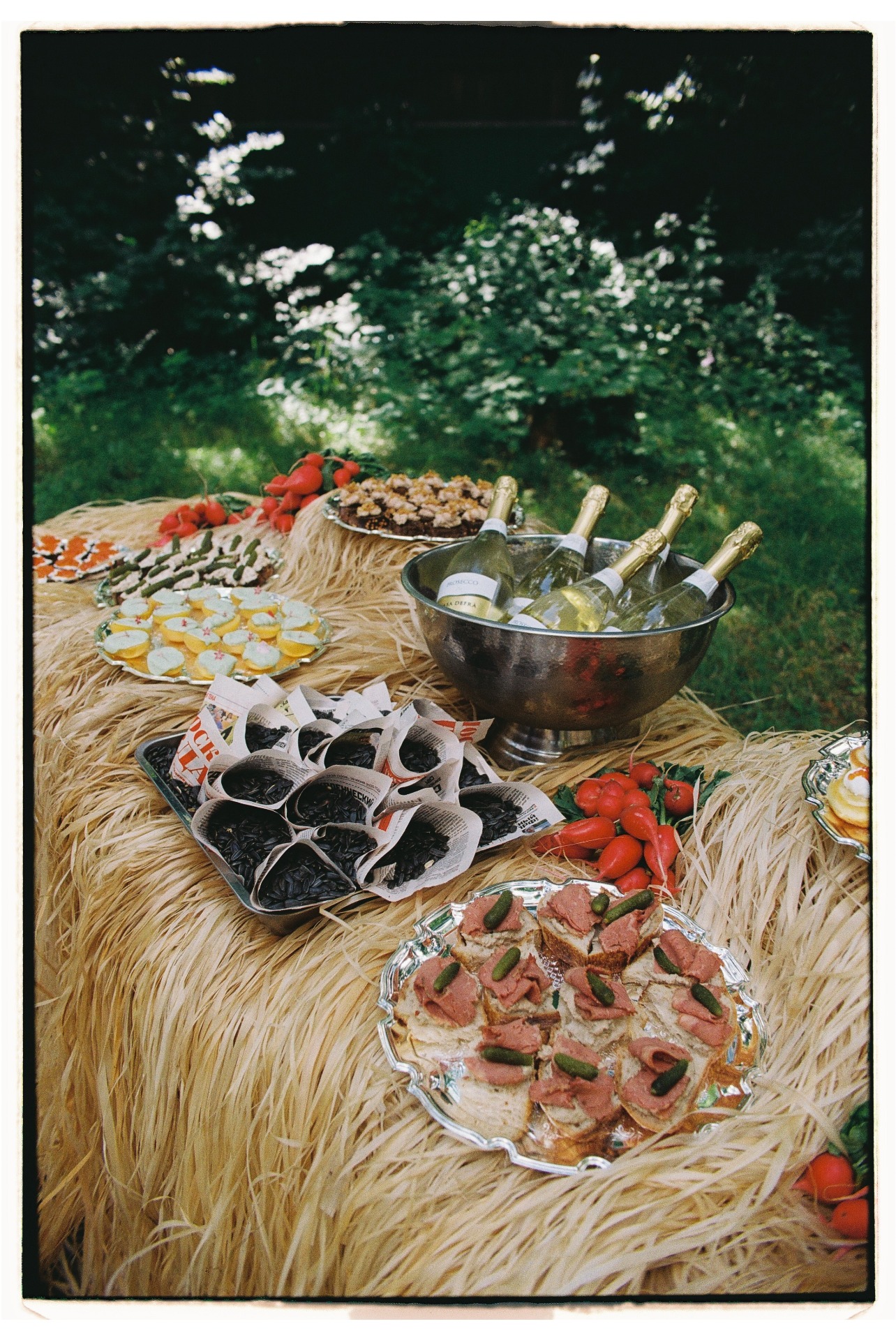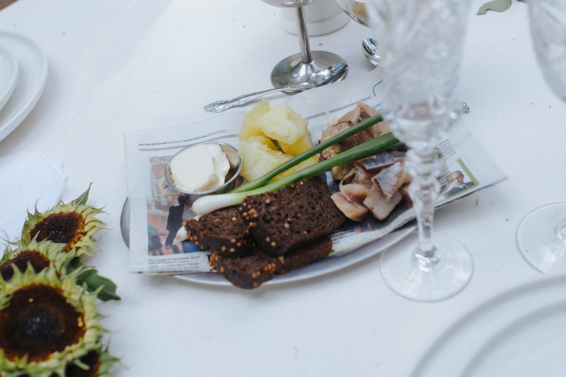В меню мы сделали акцент на «домашнем вайбе»: кульки с семечками, редиска с хреном, икра, шпроты на хлебе. А на столах разместилась «селёдка на газетке», жареная картошка с зеленью, паштет со сливами, сало с зелёным луком и чебуреки. Десерты мы выбрали с ноткой ностальгии по детству: трубочки со сгущёнкой, вареники с вишней, клубника со сметаной и торт в виде каравая.