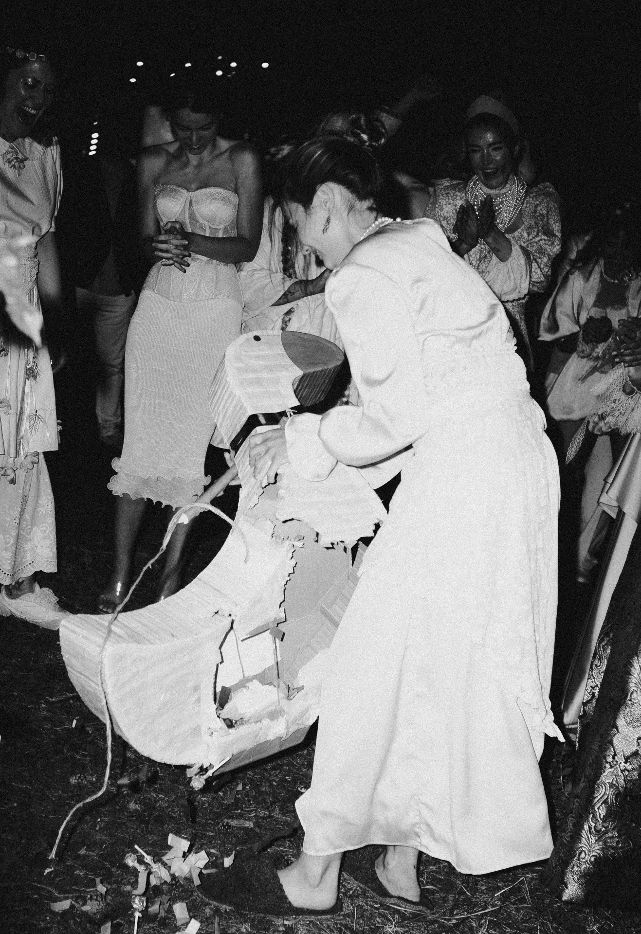 Вместо броска букета мы вспомнили другую старую традицию: раньше гуся выпускали в толпу незамужних подруг — кого он ущипнёт, та следующая и выходит замуж. Переосмыслив этот обычай, подругам мы вручили биту и сделали пиньяту в виде гуся. Они били куклу, ожидая, на чьём ударе та рассыпется.