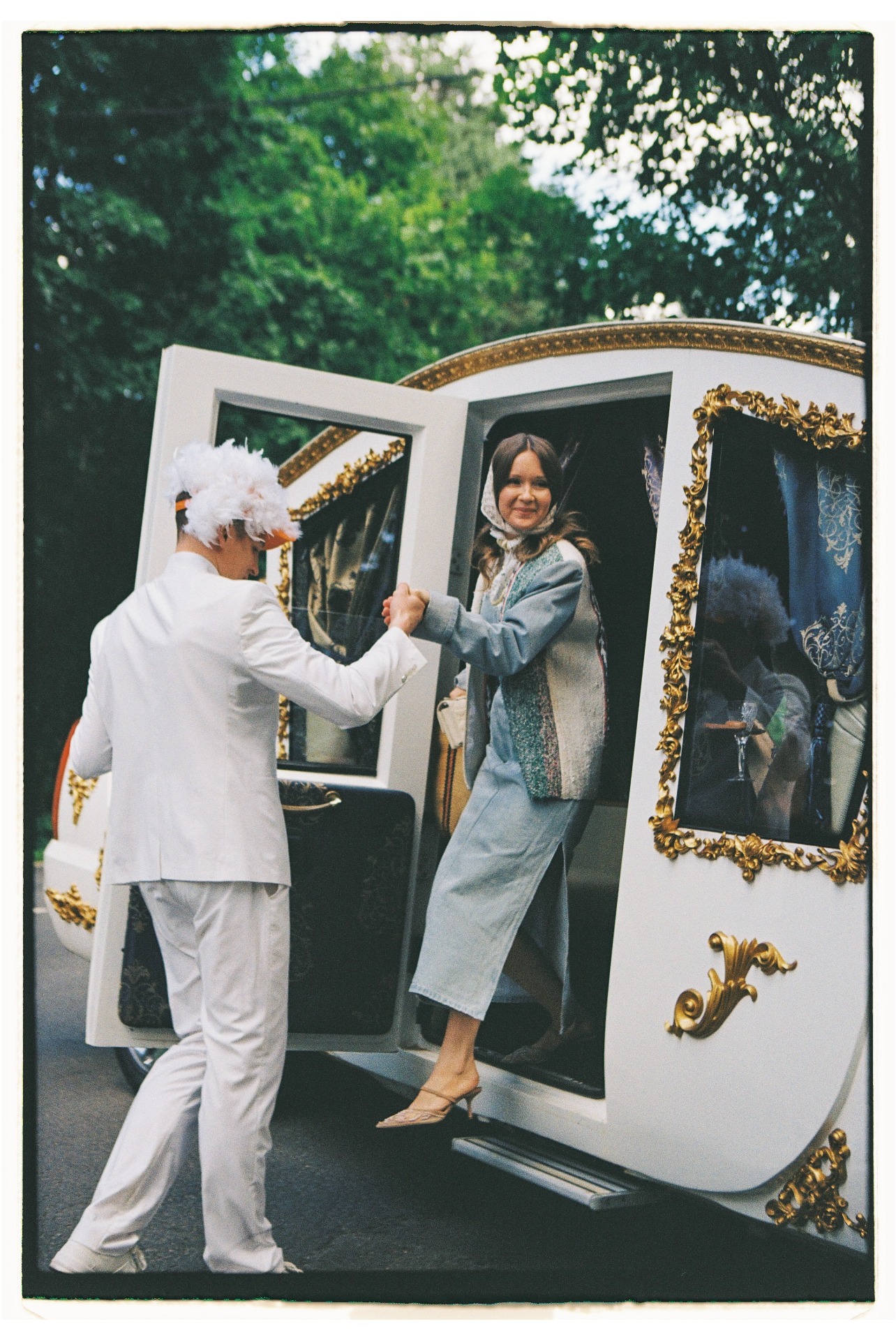 Праздник начинался с того, что гостей на площадку привозили на гибриде автомобиля и кареты. А у ворот всех приглашённых встречали двое в костюмах «весёлых гусей».