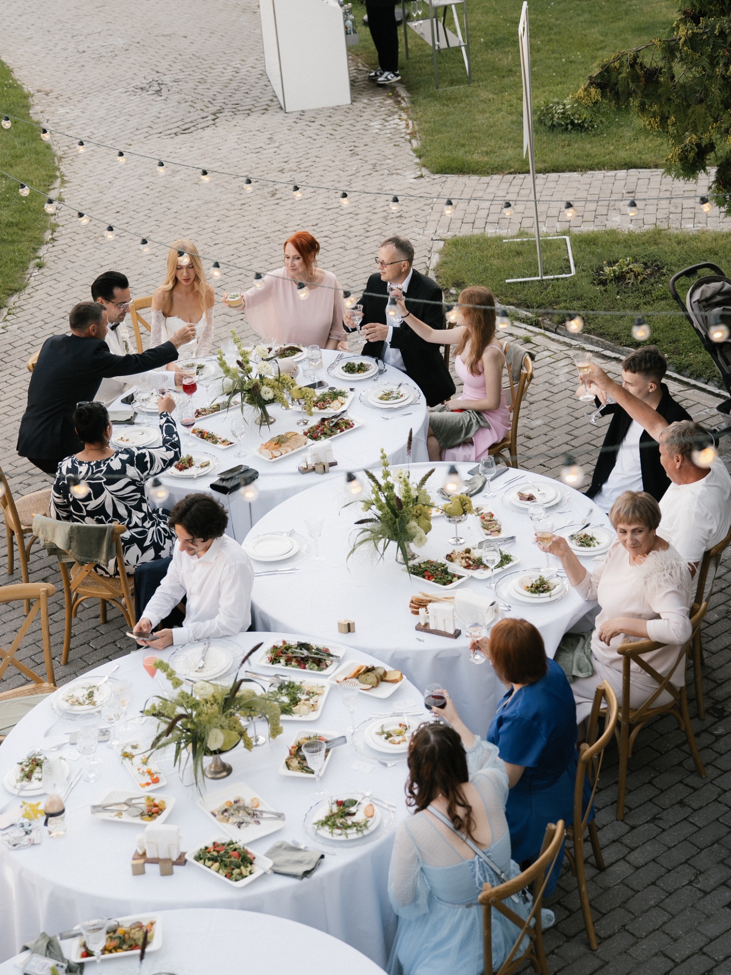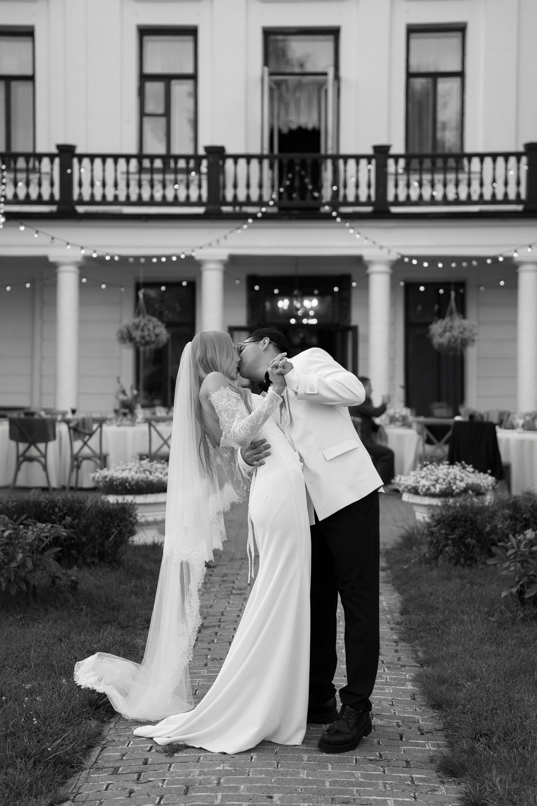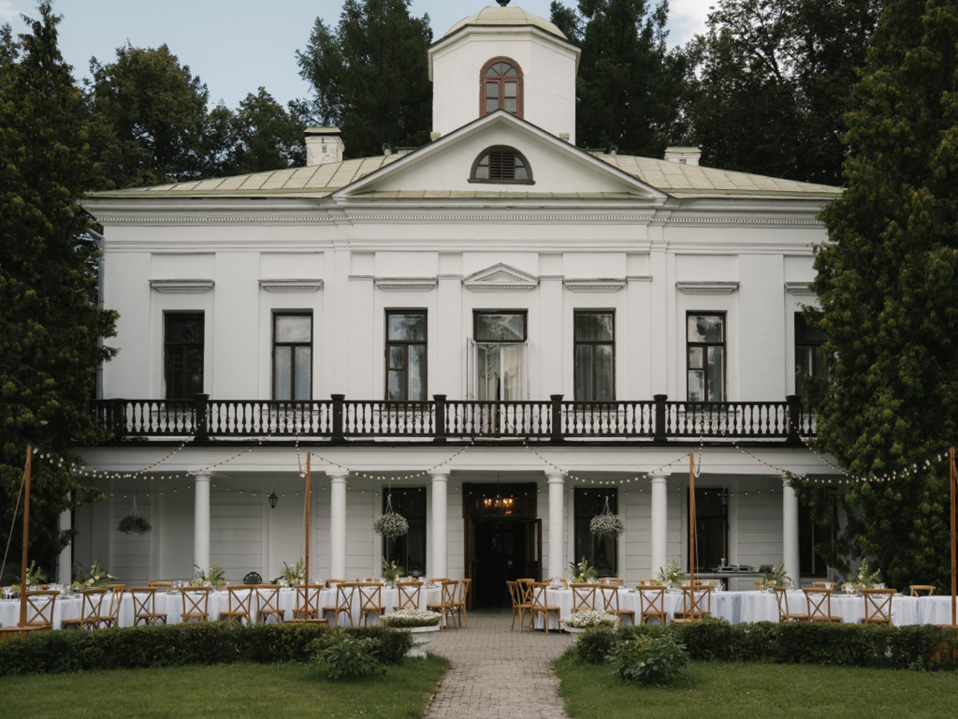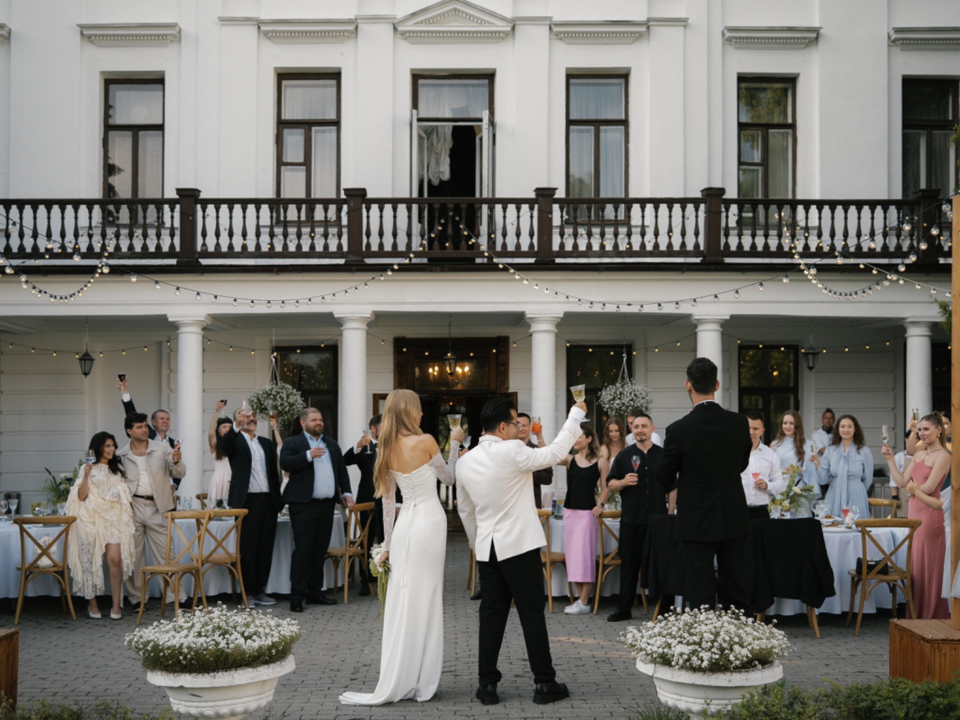 Торжество было продумано до мелочей. Мы разделили площадку на две зоны: одна — для ужина в парадном дворе особняка с необычной расстановкой столов, вторая — для вечеринки с кавер-группой, коктейльным баром и лаундж-зонами. Мы успели насладиться каждым моментом. От трогательной церемонии до окончания шумной вечеринки.