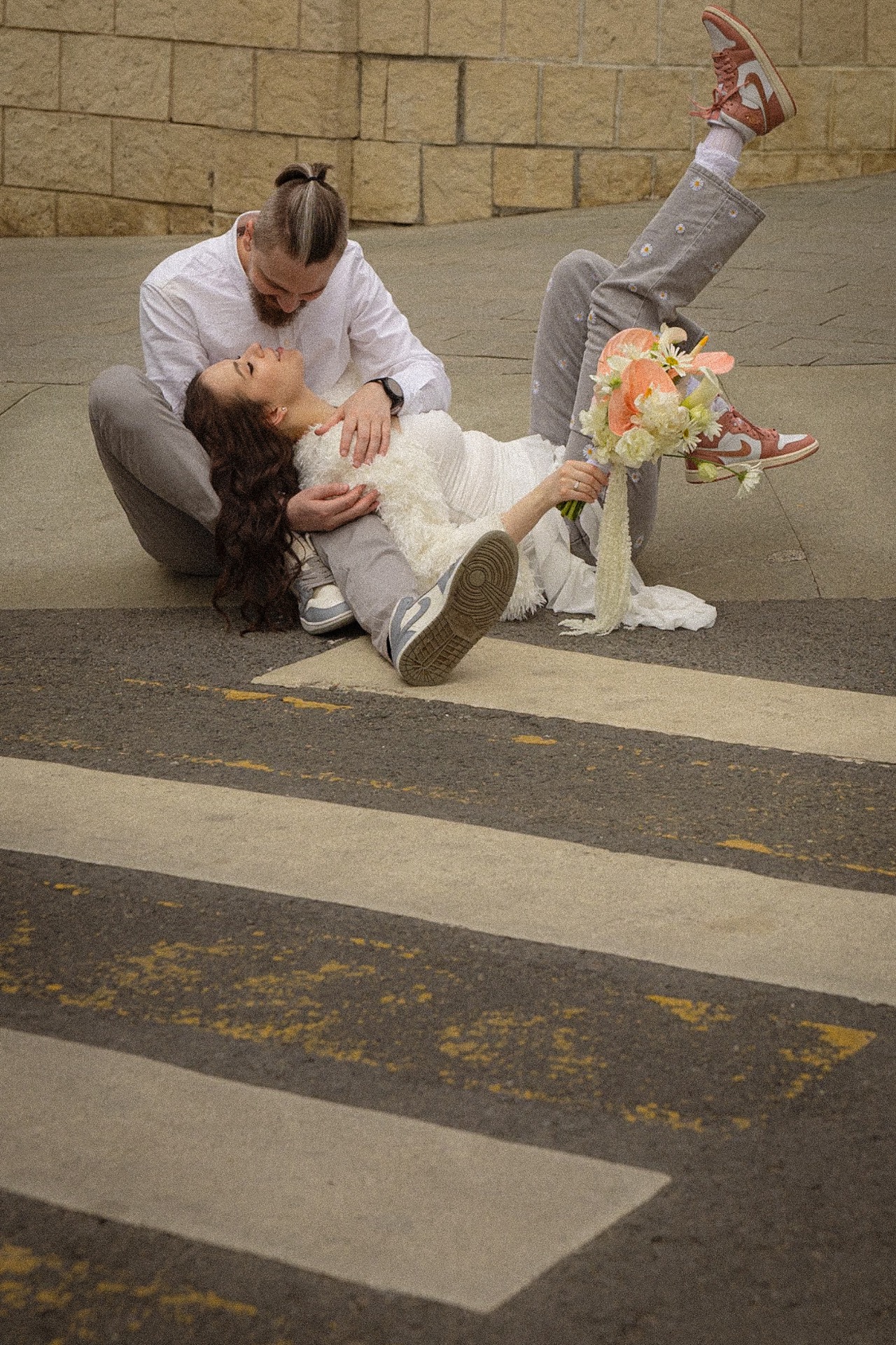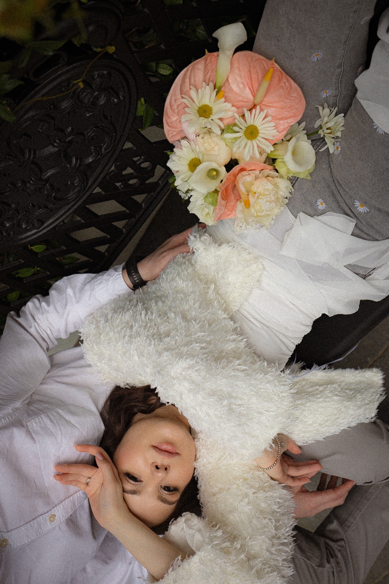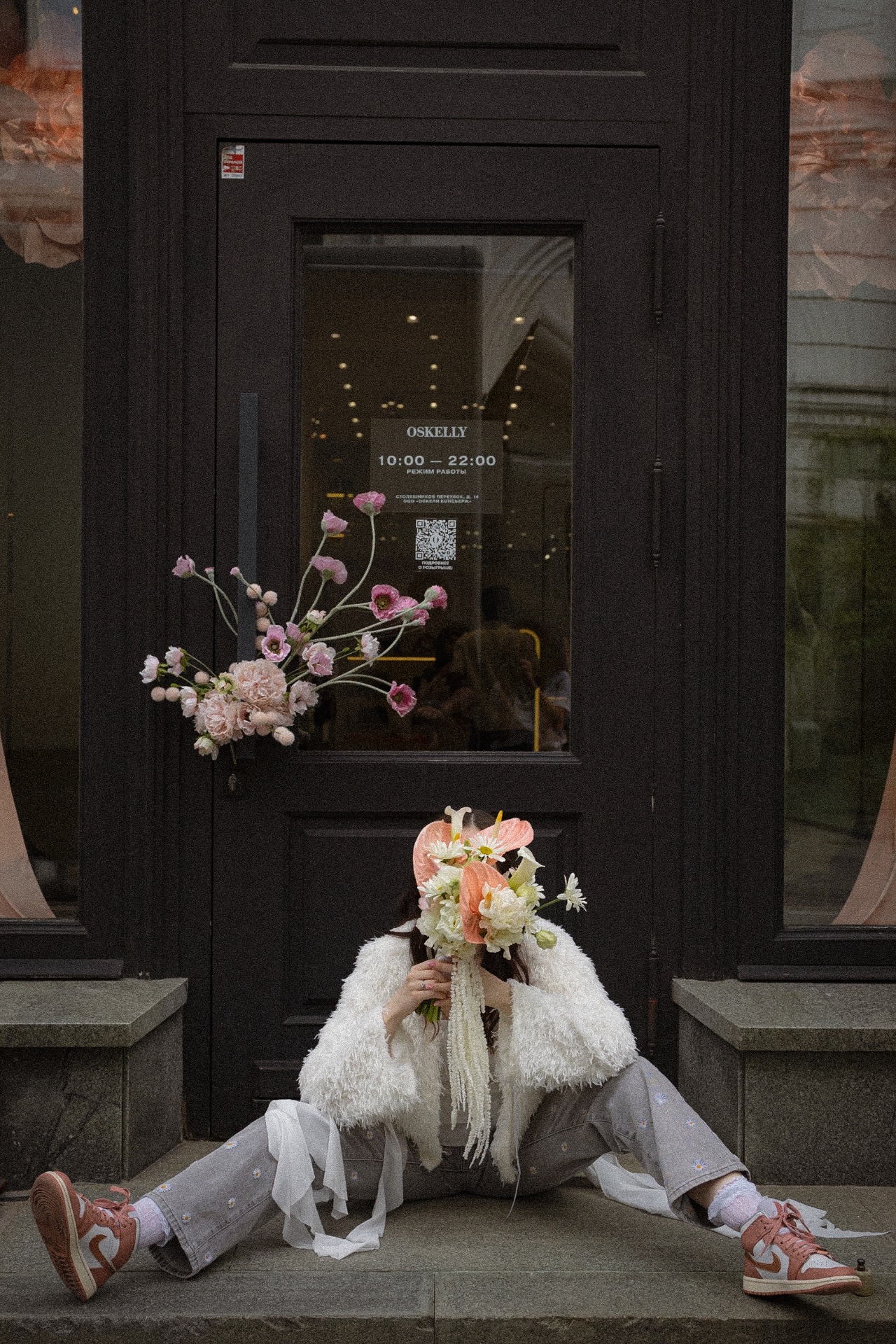 День регистрации в ЗАГСе мы решили провести вдвоём, без лишнего официоза. Нам хотелось, чтобы этот день тоже был ярким и весёлым. Поэтому мой образ получился нестандартным: джинсы с ромашками, перекликающимися с букетом, белый топ с воланами и жакет с перьями.