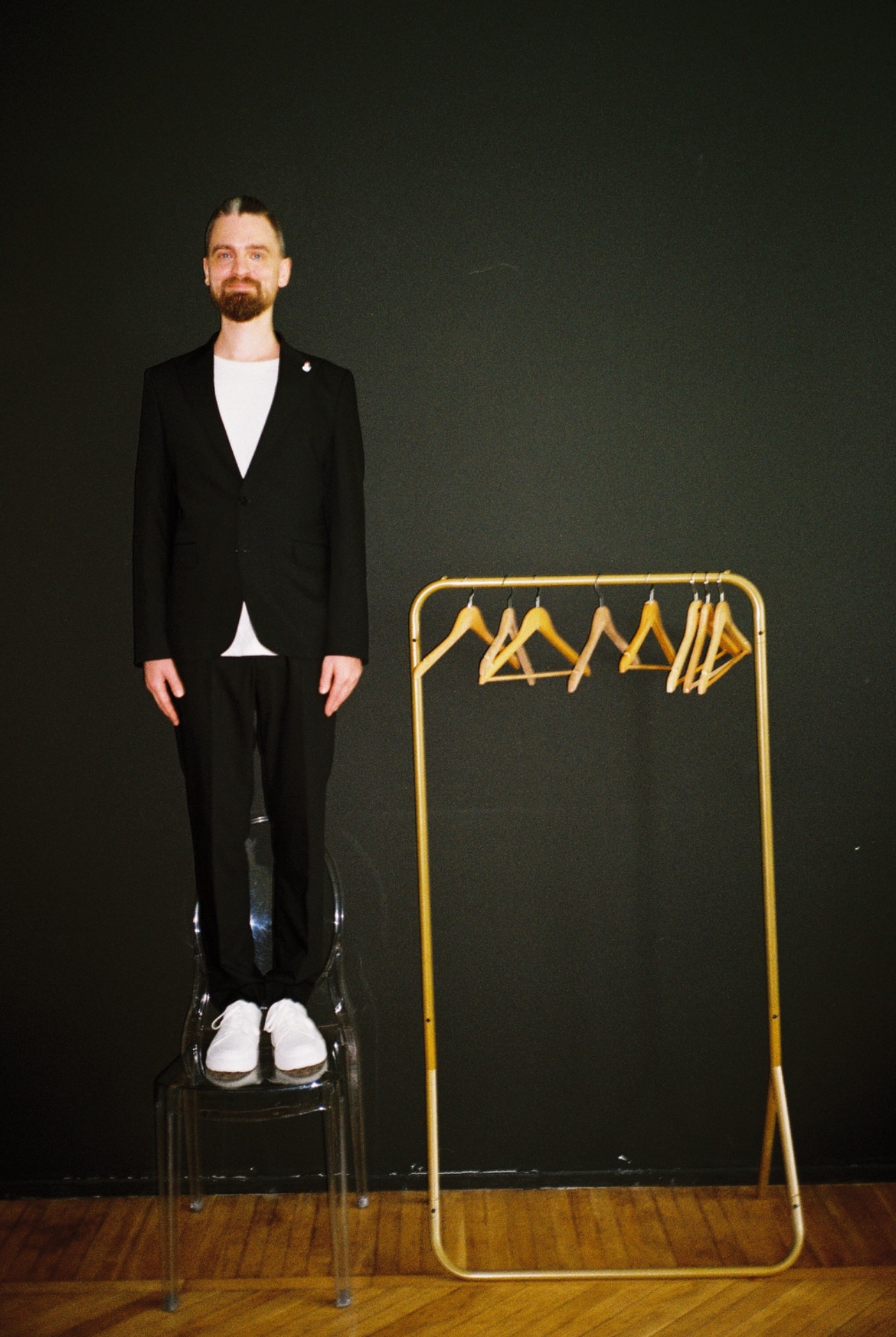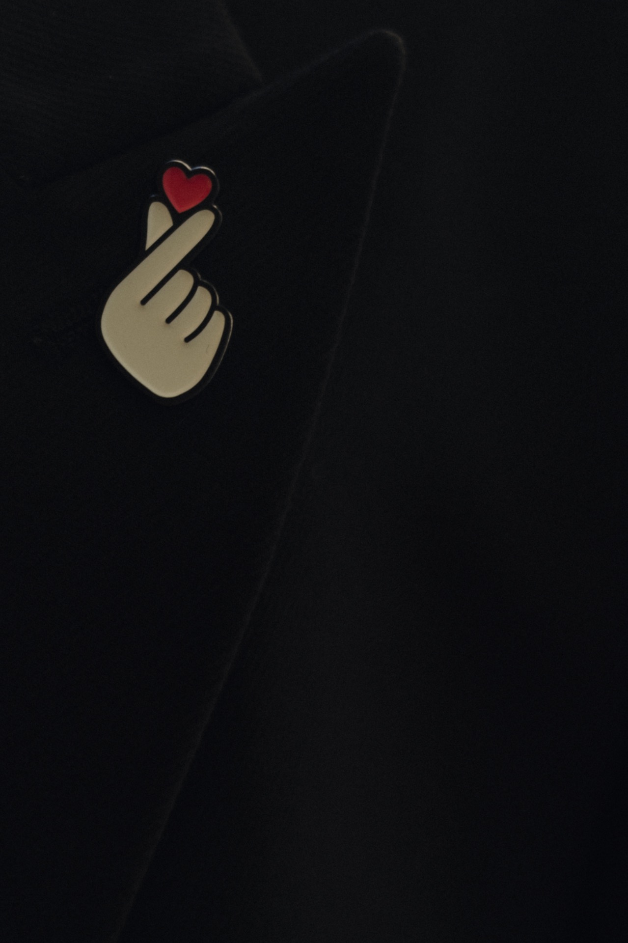 Кирилл выбрал для себя чёрный костюм-двойку в кэжуал-стиле с текстурной футболкой и кедами. На лацкане он разместил брошь-сердечко — наш личный символ и маленький знак любви.