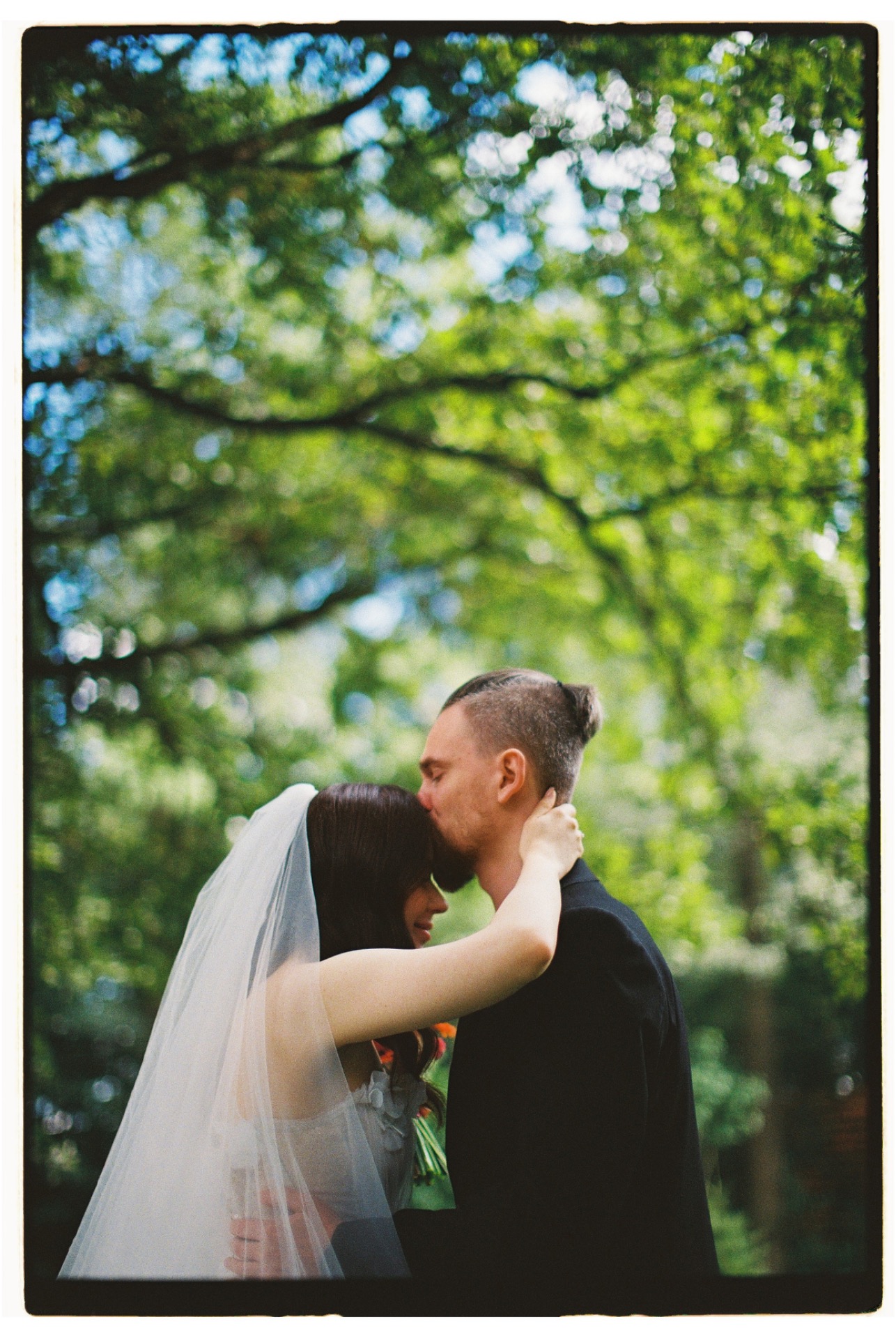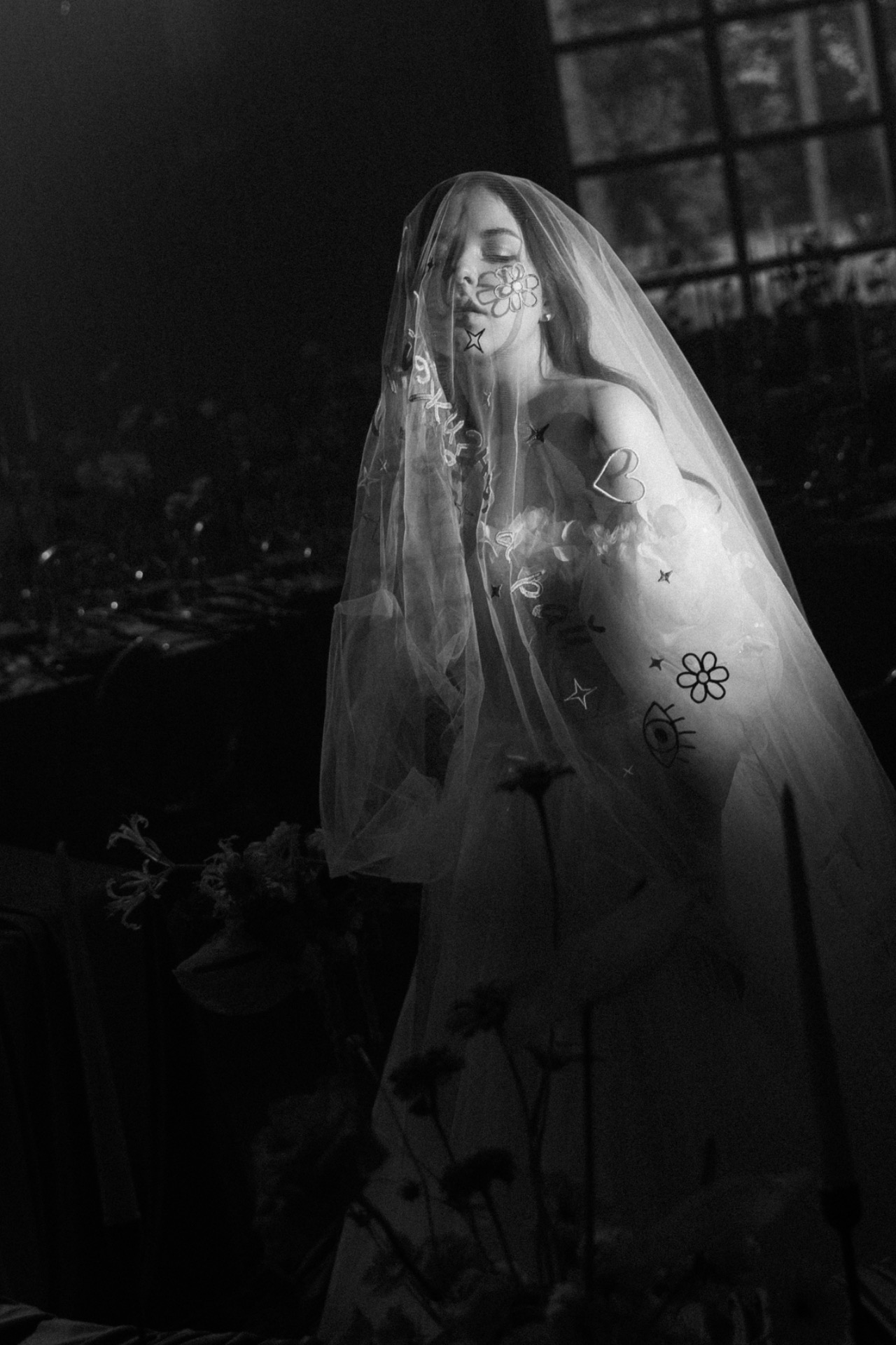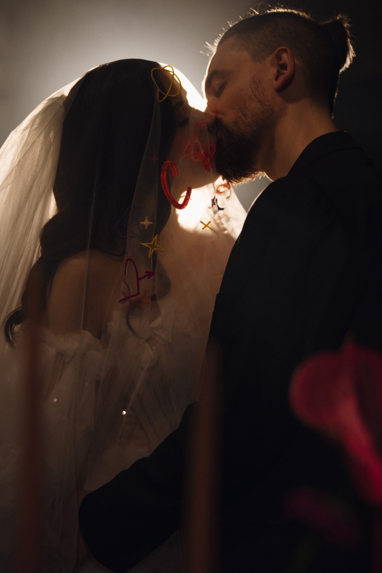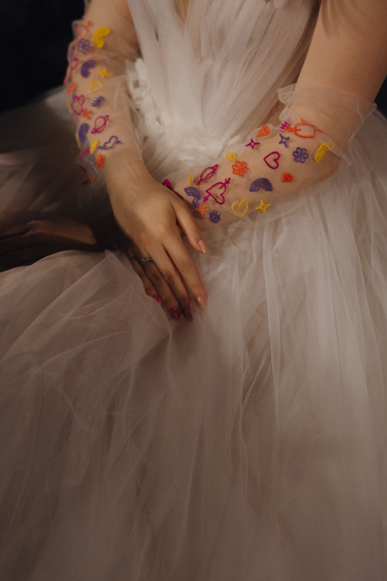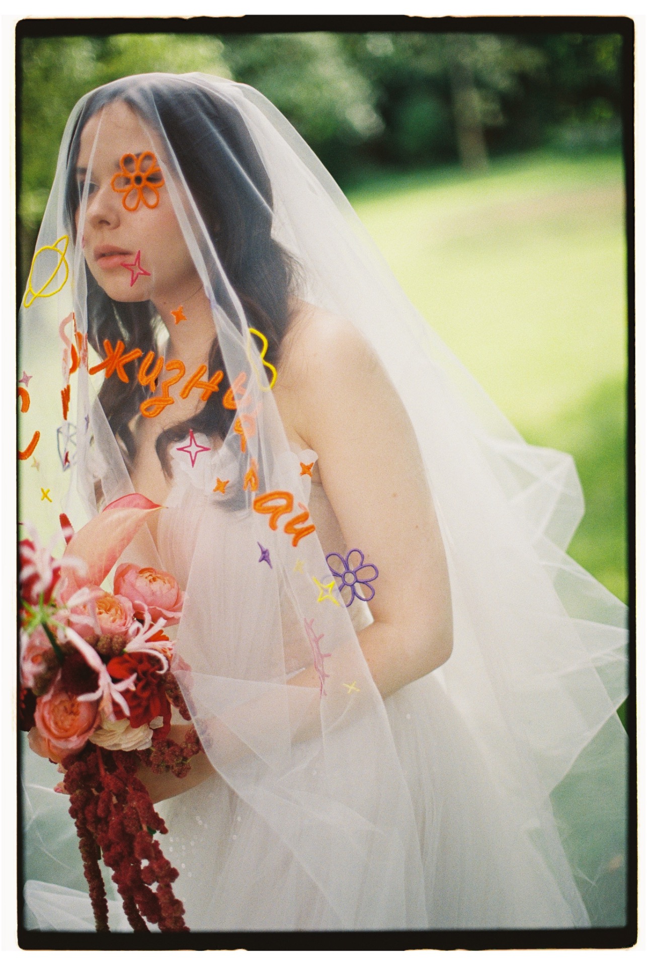 Платье дополнили ярко-розовые слингбэки, серьги-сердечки и фата, сделанная на заказ. Её украшала яркая вышивка с цитатой из песни The Hatters — «С тобой не жизнь, а рай». Эта песня, кстати, завершала нашу церемонию, а цитату мы использовали ещё и на подиуме.