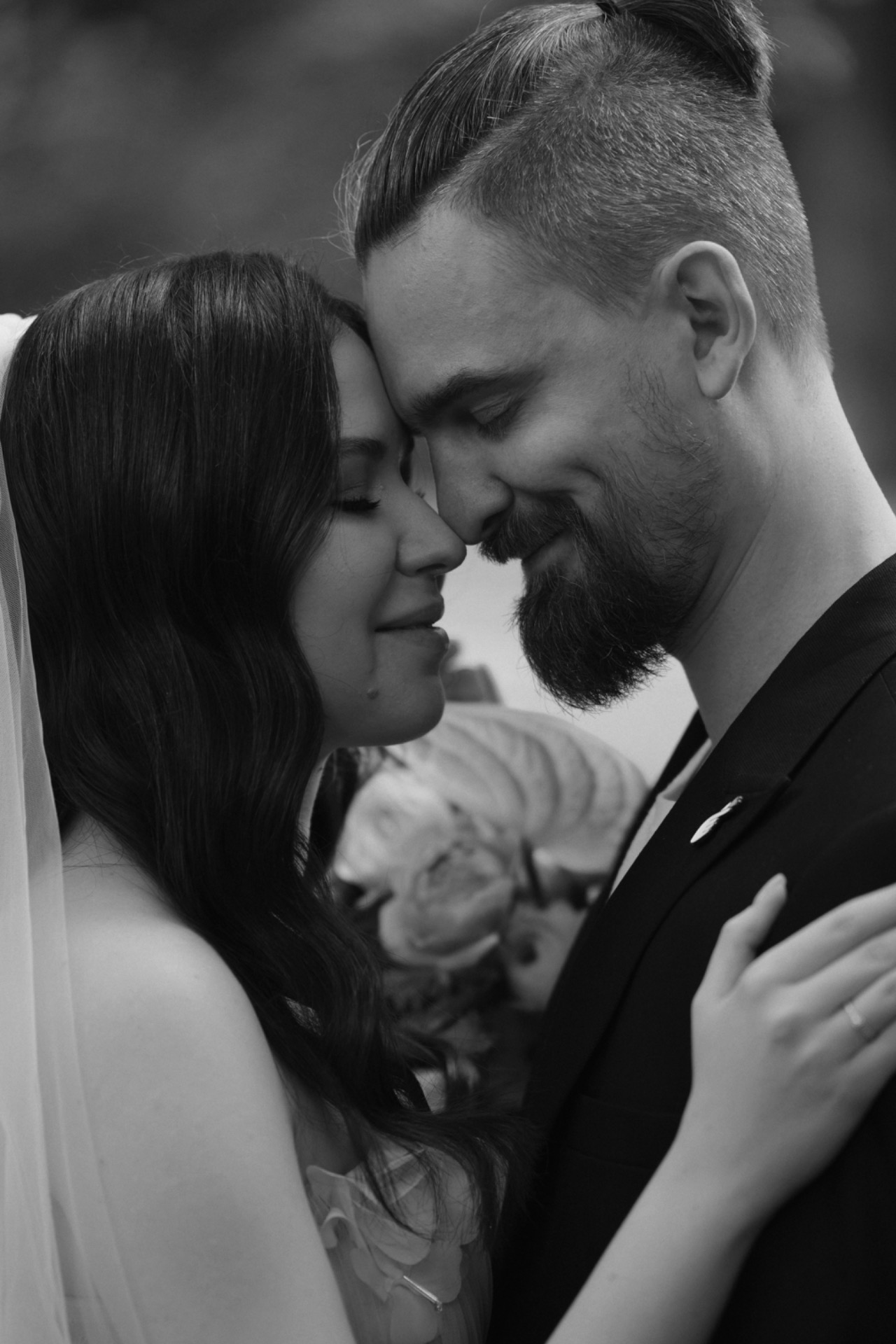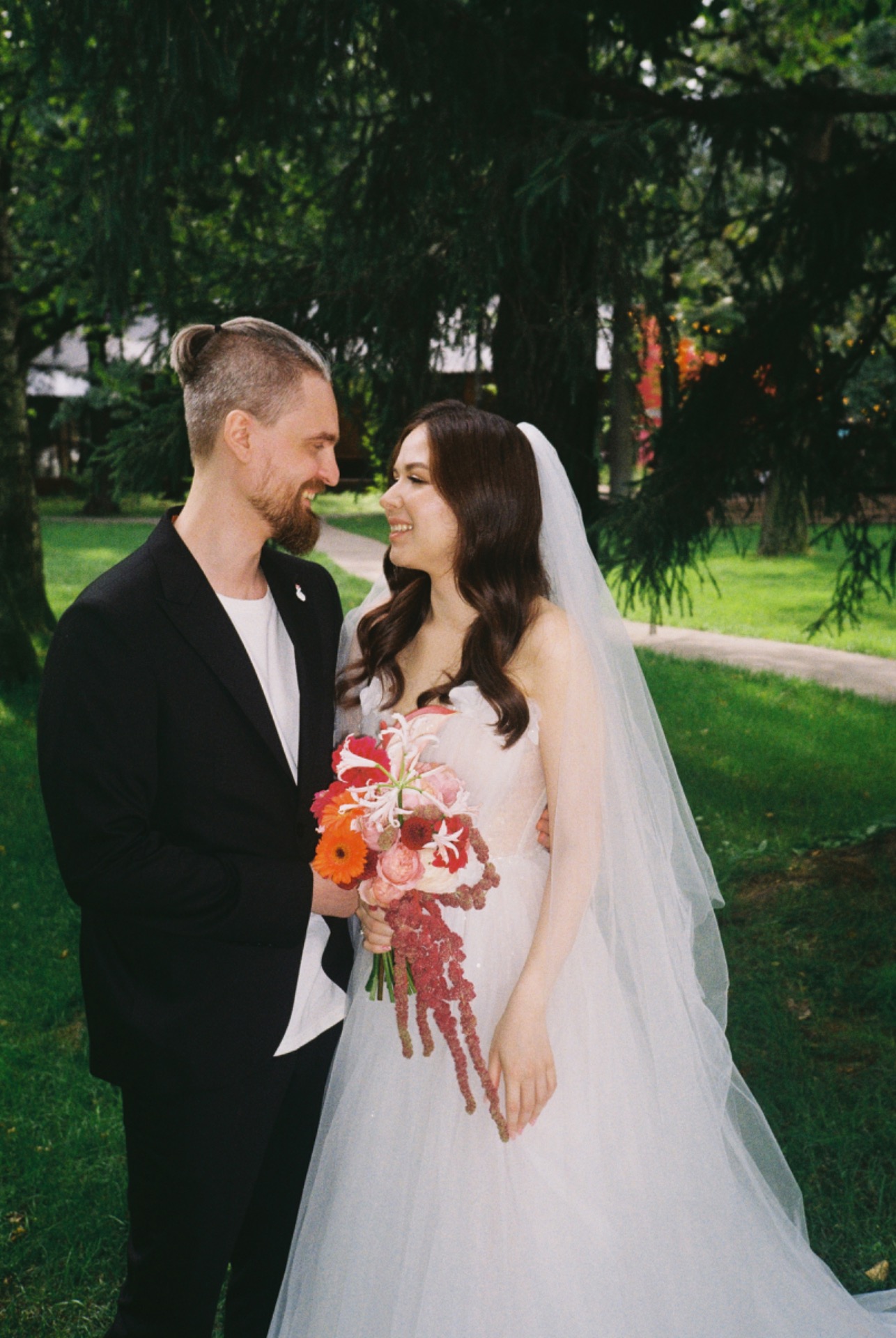 В день торжества мы встретили гостей на велкоме в более расслабленных нарядах, а на церемонии появились уже в основных образах. Своё платье я нашла на первой примерке. Им стала модель Melissa из салона «Кураж»: пышная юбка, А-силуэт, цветы ручной работы и множество тонких деталей, которые хотелось рассматривать бесконечно. Мы немного доработали его с модельером, чтобы получилось идеальное попадание. Также мы сделали съёмные рукава, чтобы можно было сменить образ.