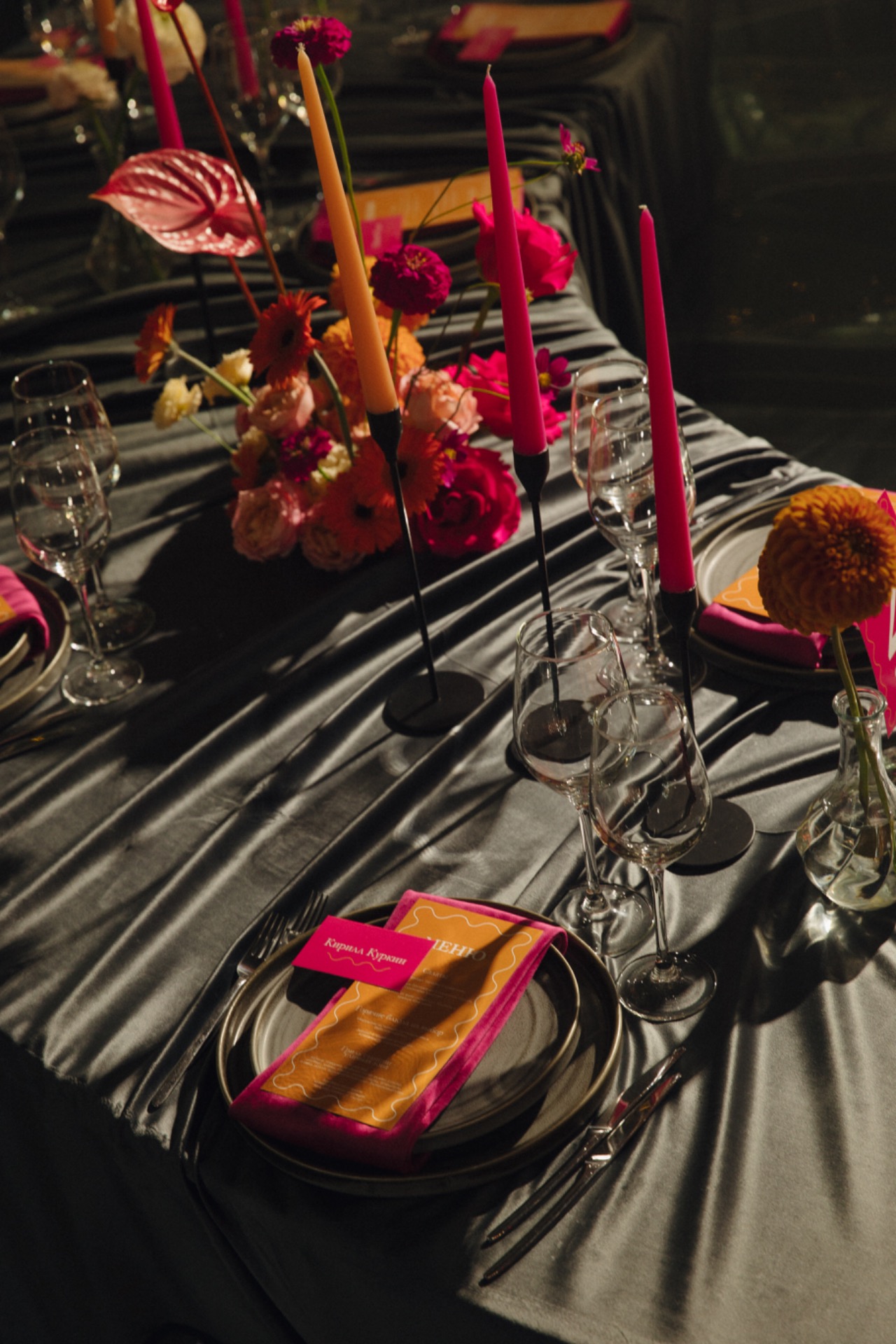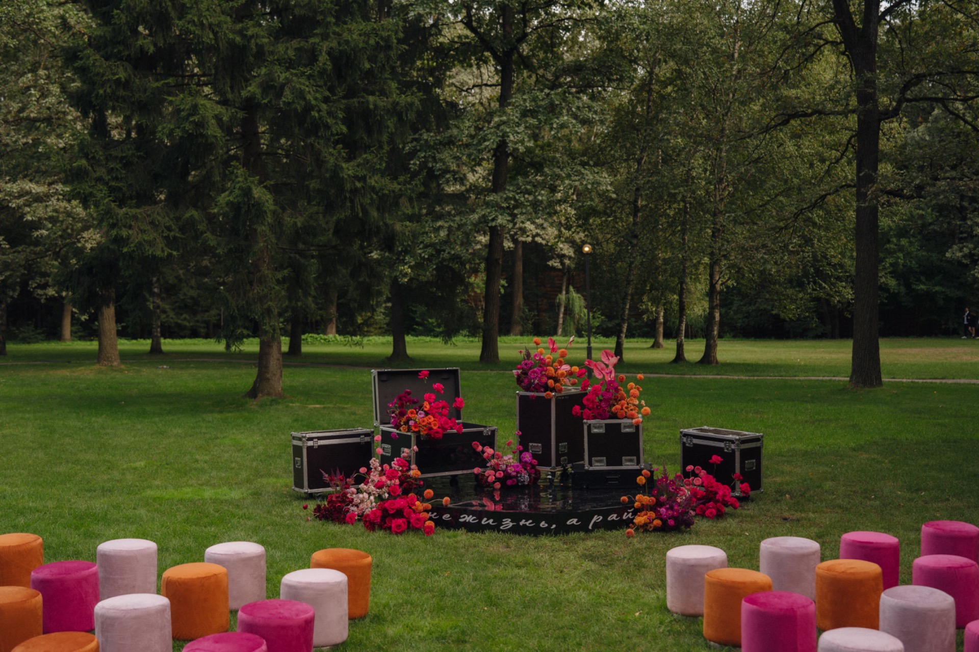 С самого начала я видела наш праздник ярким, сочным, «про нас», а идеальная палитра уже была у меня в голове: фуксия и оранжевый. С декоратором Викой мы быстро поймали одну волну: она сразу почувствовала мои идеи, которые мы лишь дорабатывали дальше.
