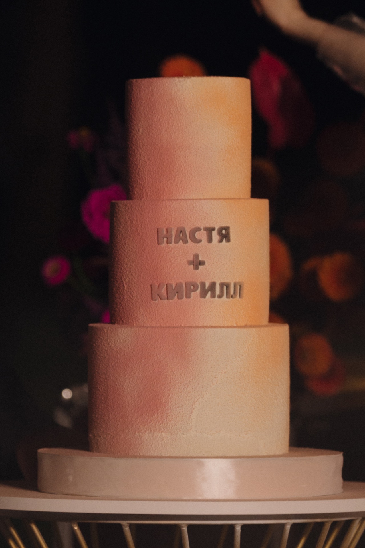 Торт для нас сделала мама моей близкой подруги, с которой мы дружим уже 20 лет. Она работает в команде известного кондитера и редко берёт заказы, но для нас согласилась сделать исключение. Мы решили немного похулиганить, поэтому белый торт в финале ярко раскрасили баллончиками с пищевыми красителями.