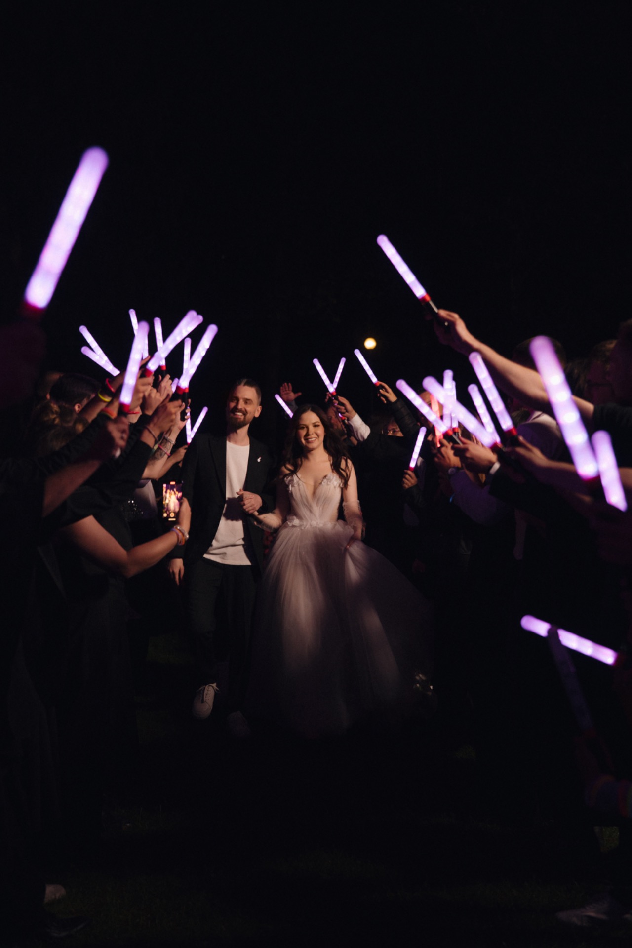 Все визуалы для мерча мы придумали сами с помощью ChatGPT. А вместо бенгальских огней мы завершили свадьбу неоновыми палочками.