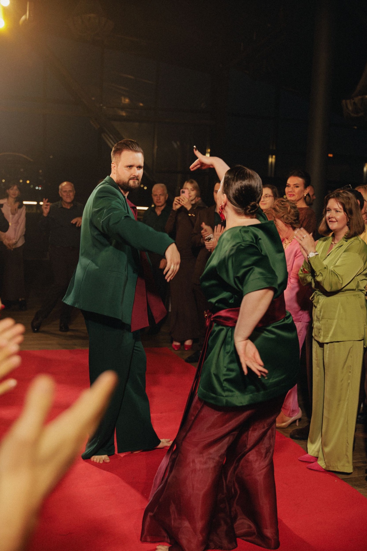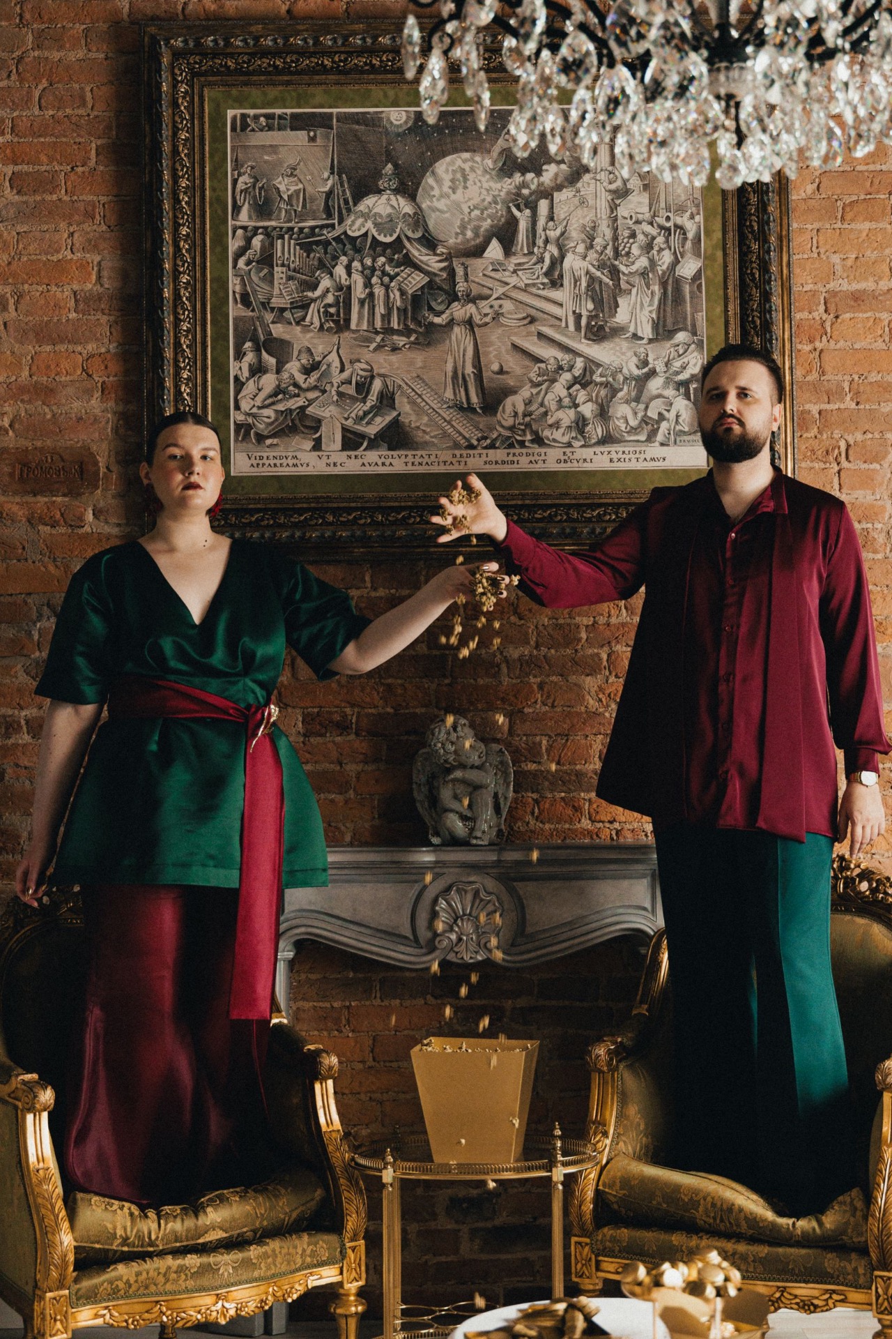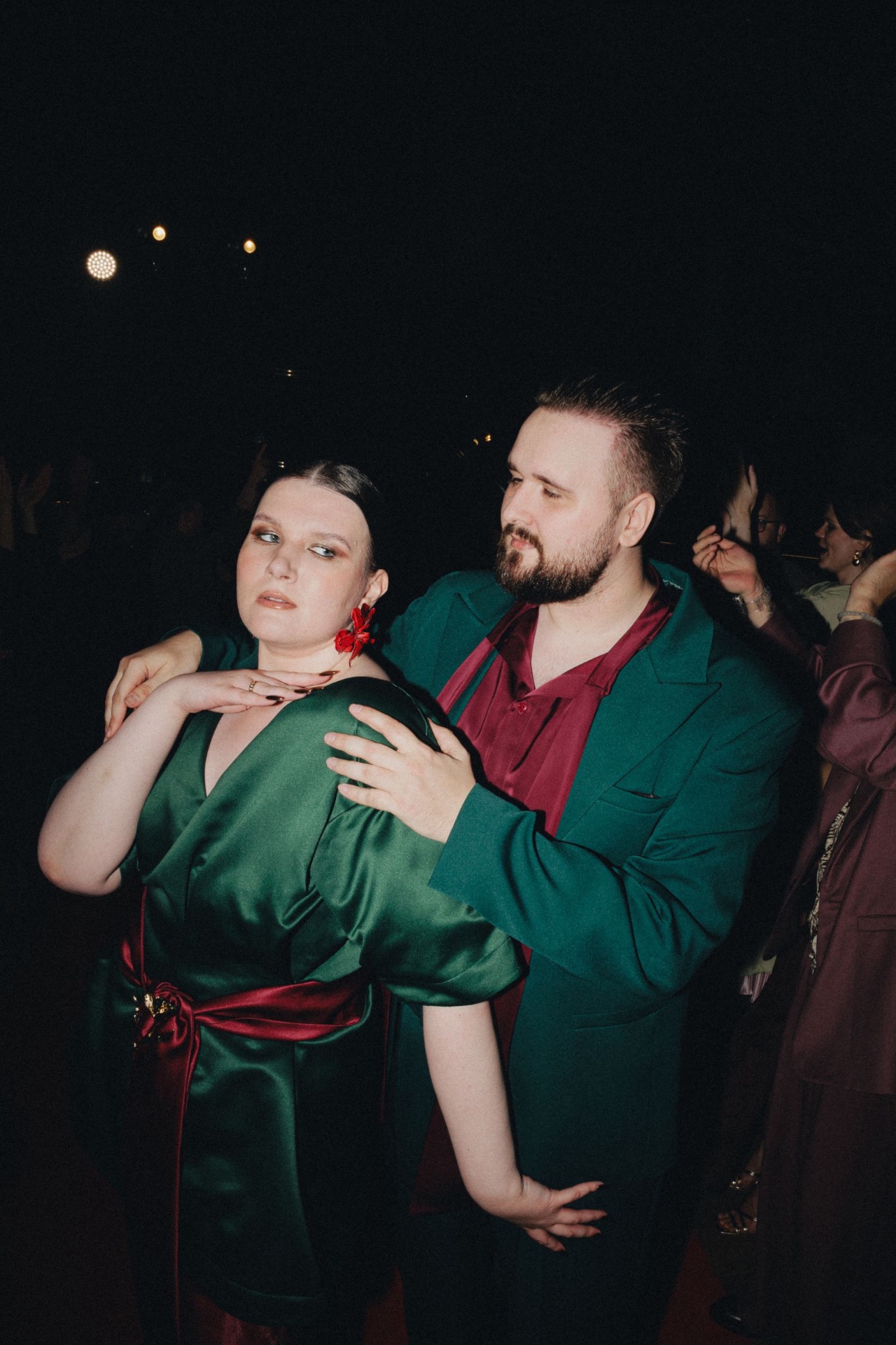 Третьи образы предназначались для вечеринки. Антон был в костюме тёмно-зелёного цвета и винной рубашке с бантом. У меня были бордовые штаны из органзы и короткое зелёное платье с винным поясом, на котором располагалась большая брошь-цветок. Большие тёмно-красные цветы также присутствовали у меня в ушах в виде серёг.