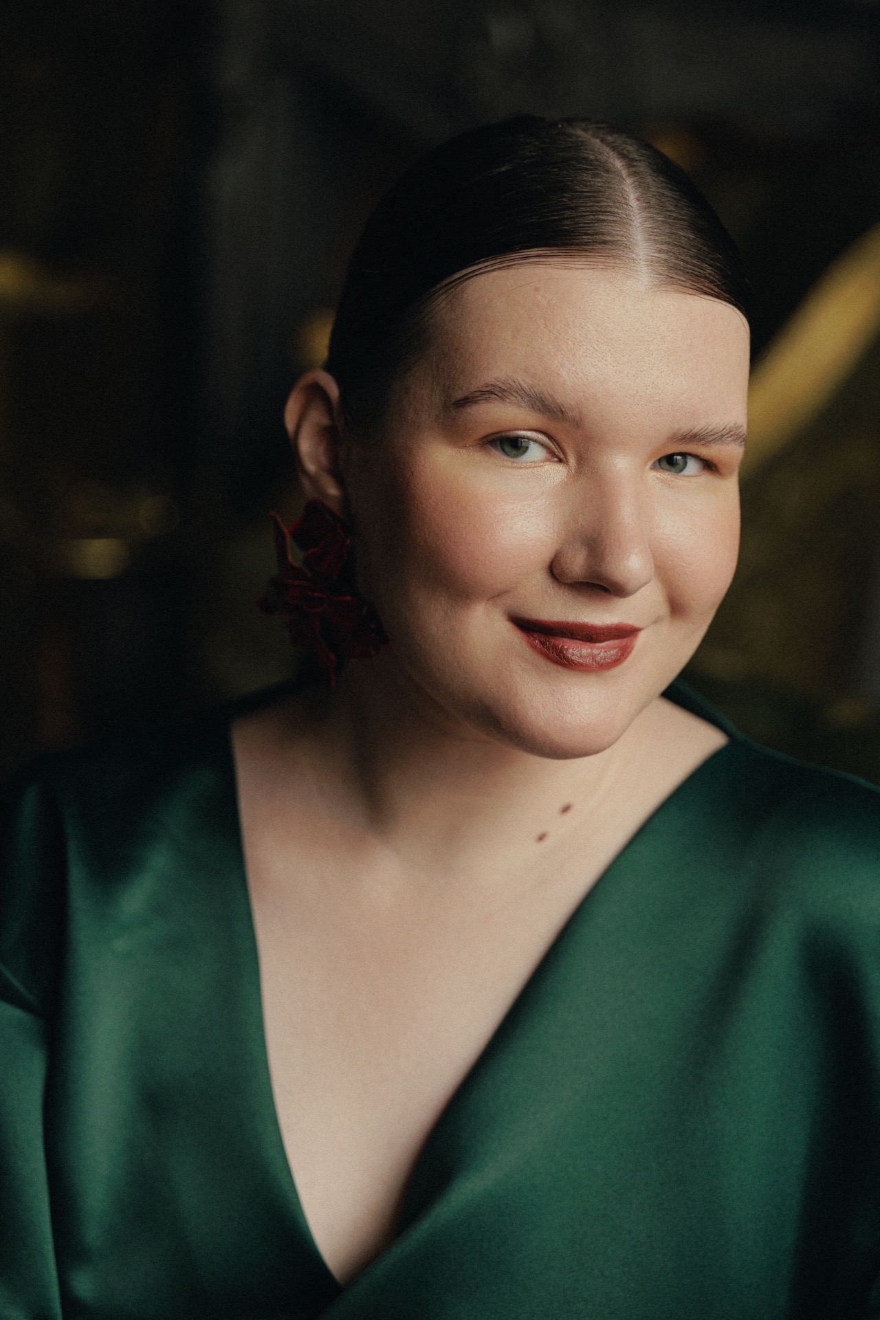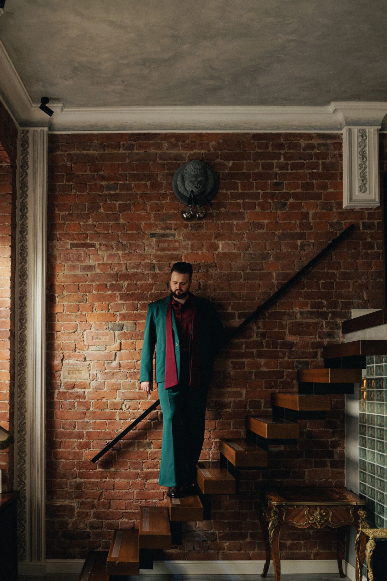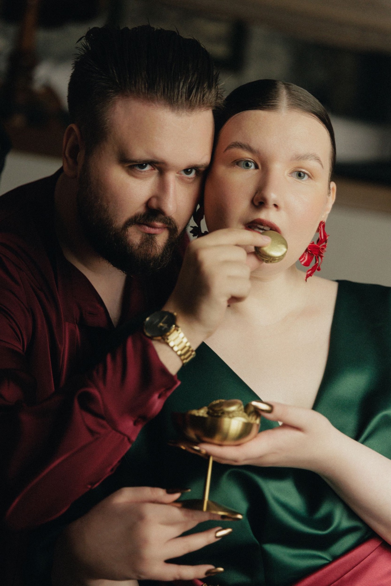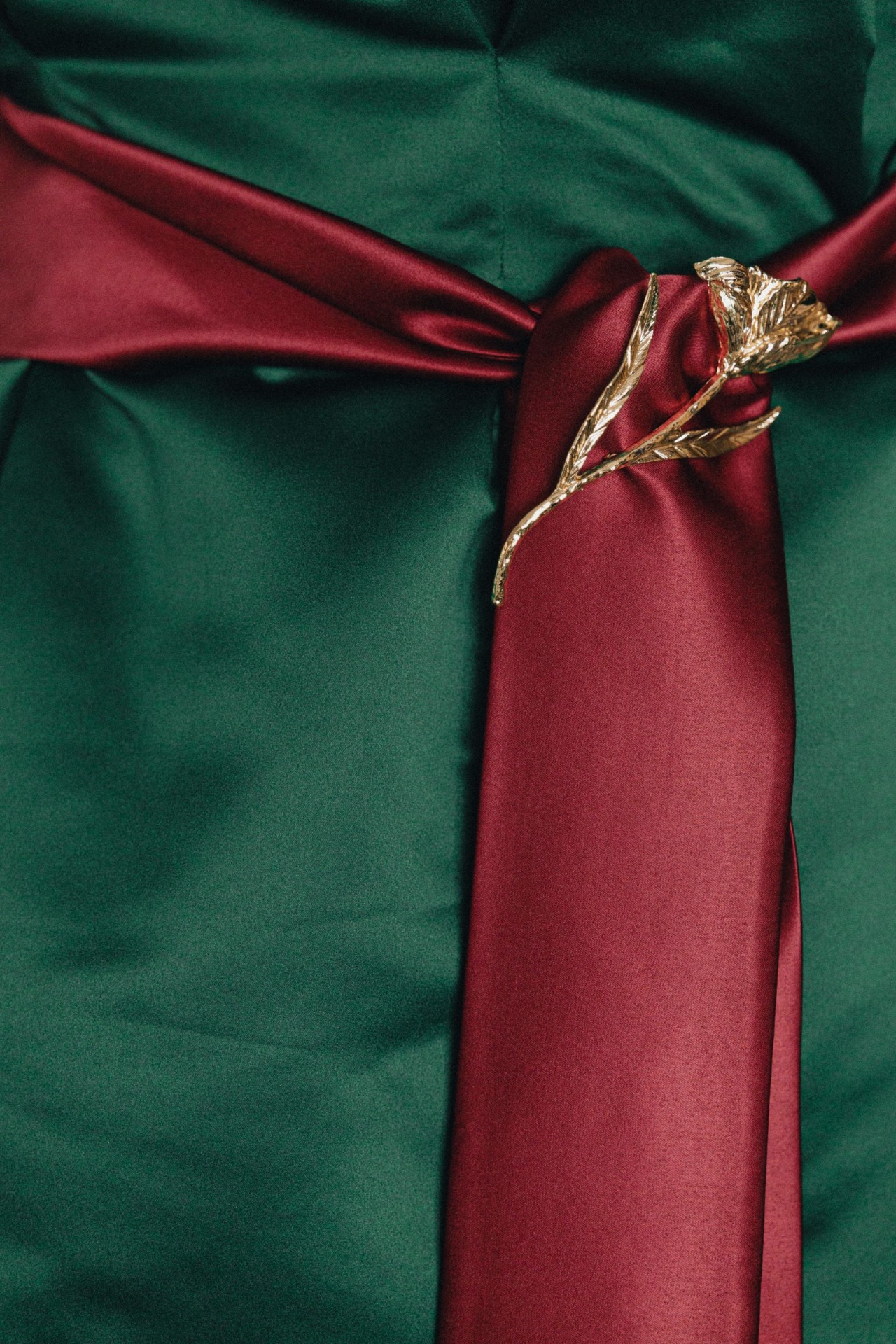 Третьи образы предназначались для вечеринки. Антон был в костюме тёмно-зелёного цвета и винной рубашке с бантом. У меня были бордовые штаны из органзы и короткое зелёное платье с винным поясом, на котором располагалась большая брошь-цветок. Большие тёмно-красные цветы также присутствовали у меня в ушах в виде серёг.