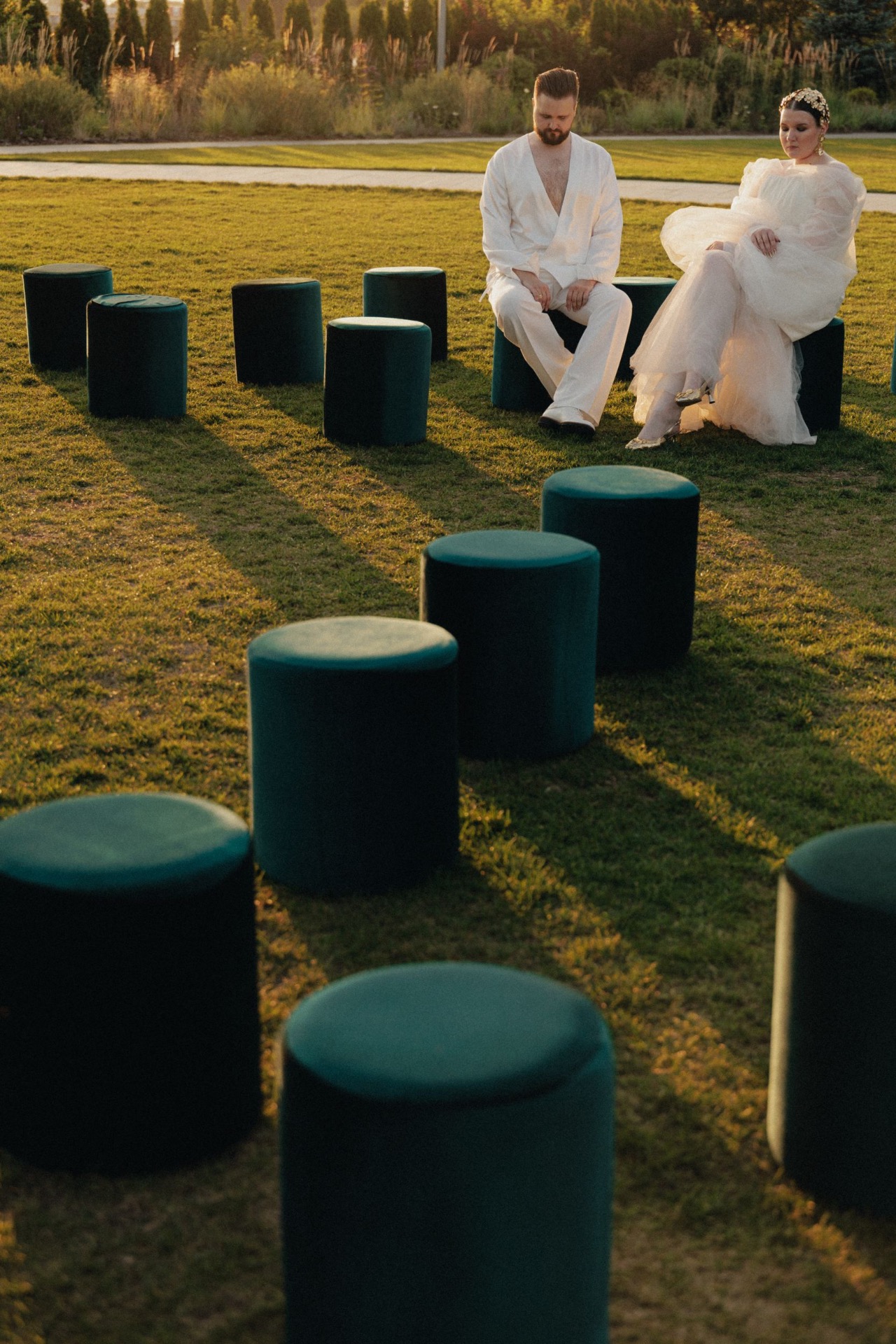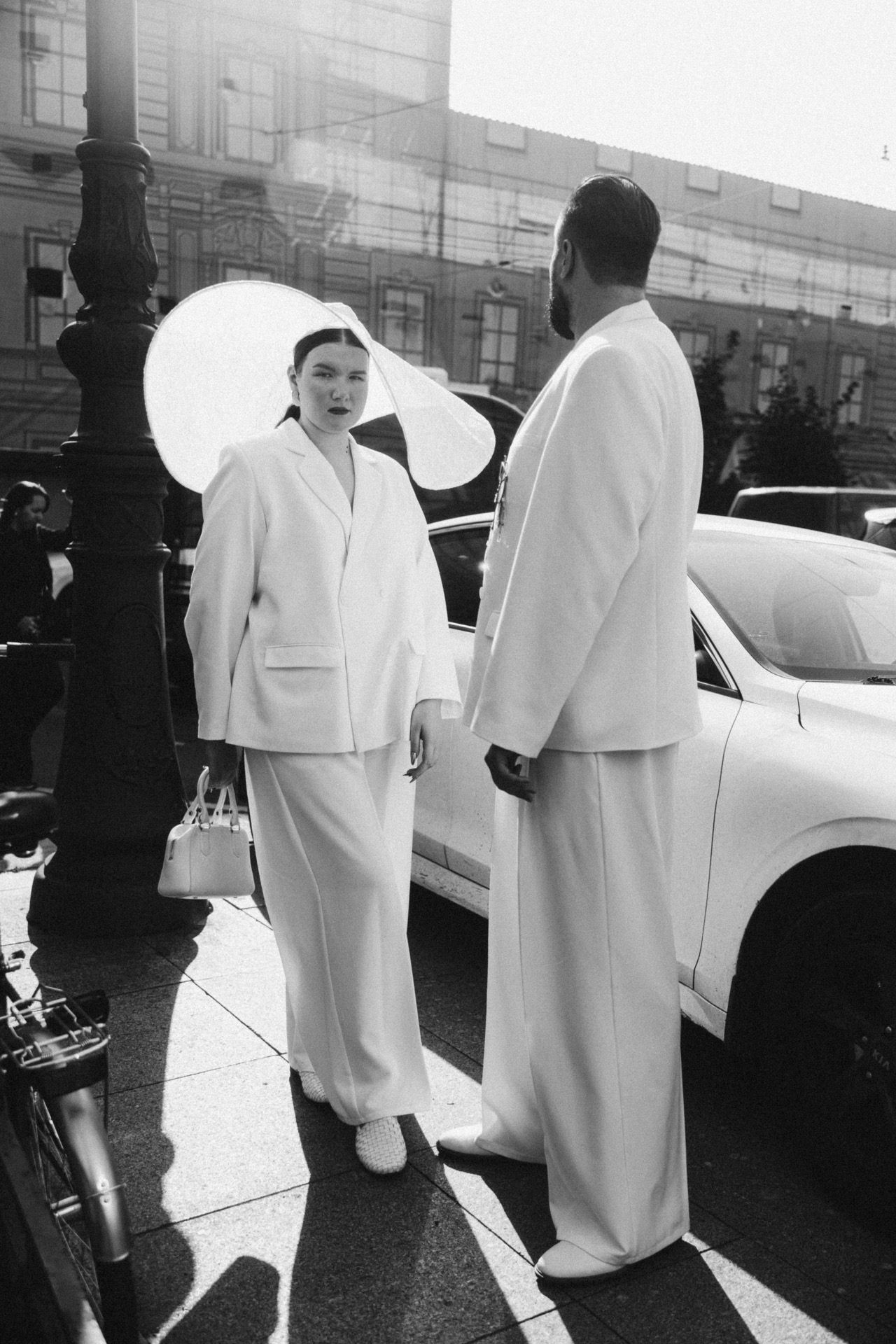 В первых образах мы встречали гостей на welcome и расписывались в ЗАГСе несколькими днями ранее. Это были идеально одинаковые белые костюмы на голое тело. Мы дополнили их необычными аксессуарами: у Антона — золотая брошь с инициалами и каффы, у меня — огромная кружевная шляпа и стеклянная ваза в виде сумки с красными пушистыми герберами внутри.
