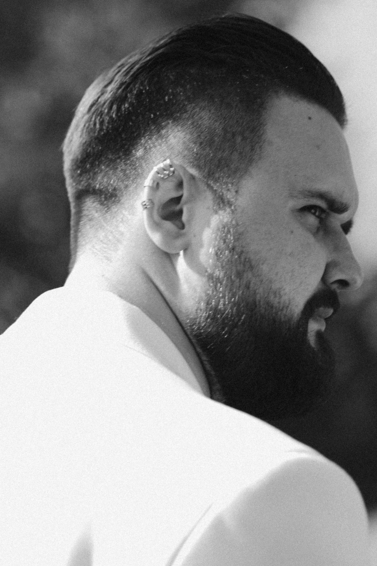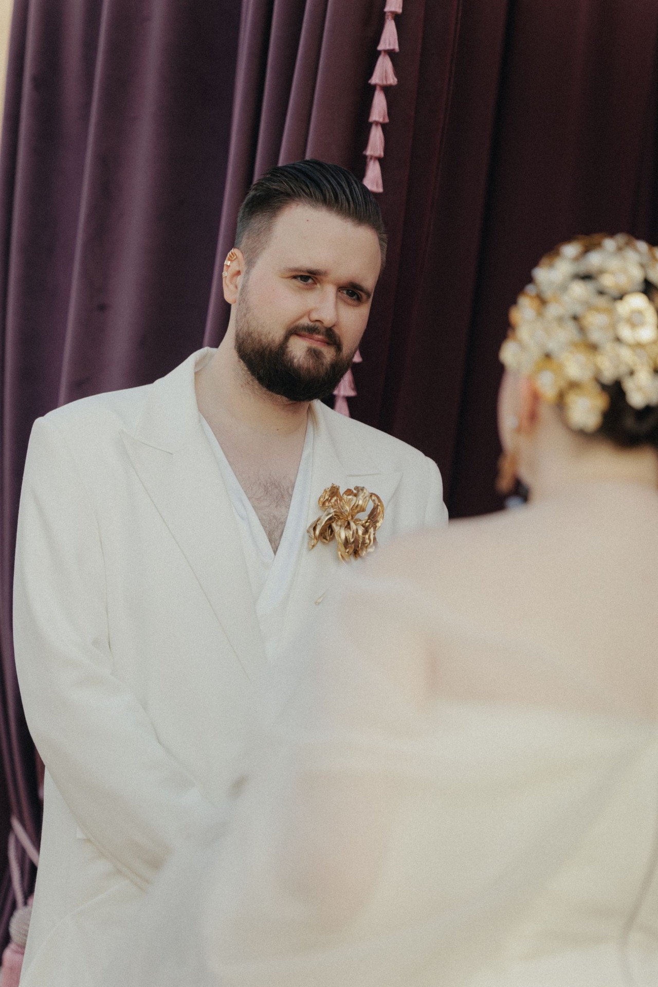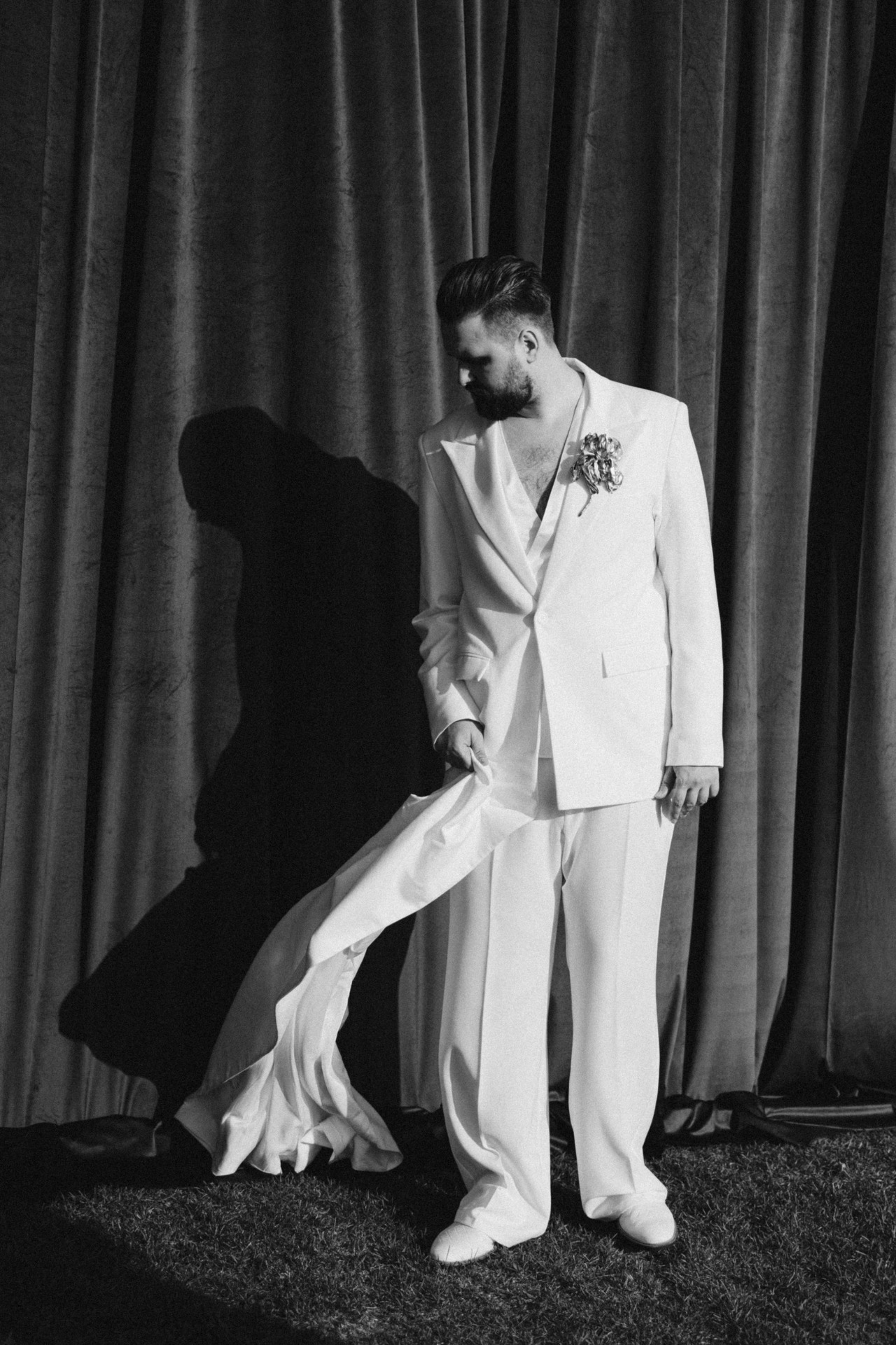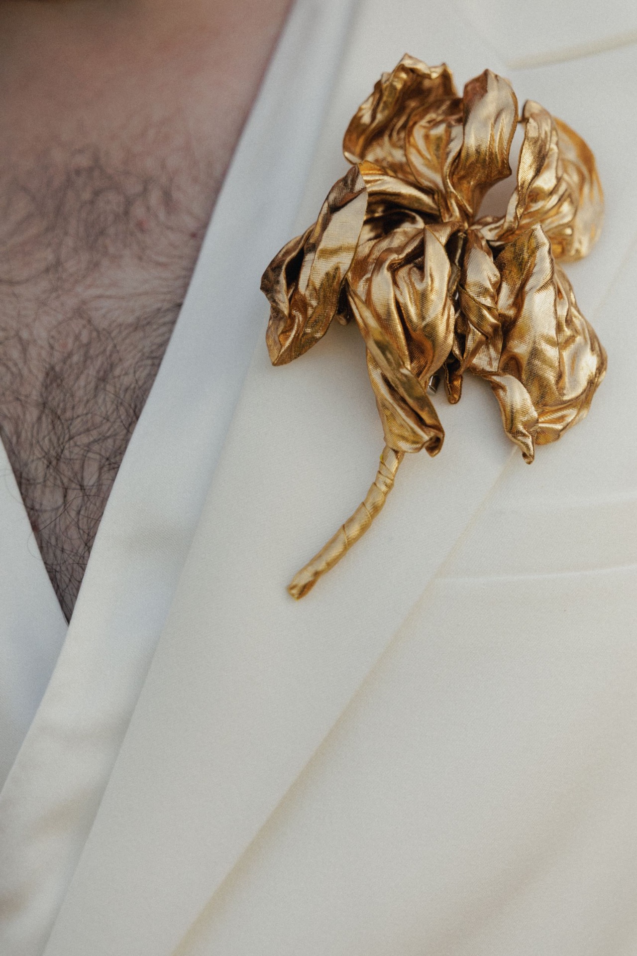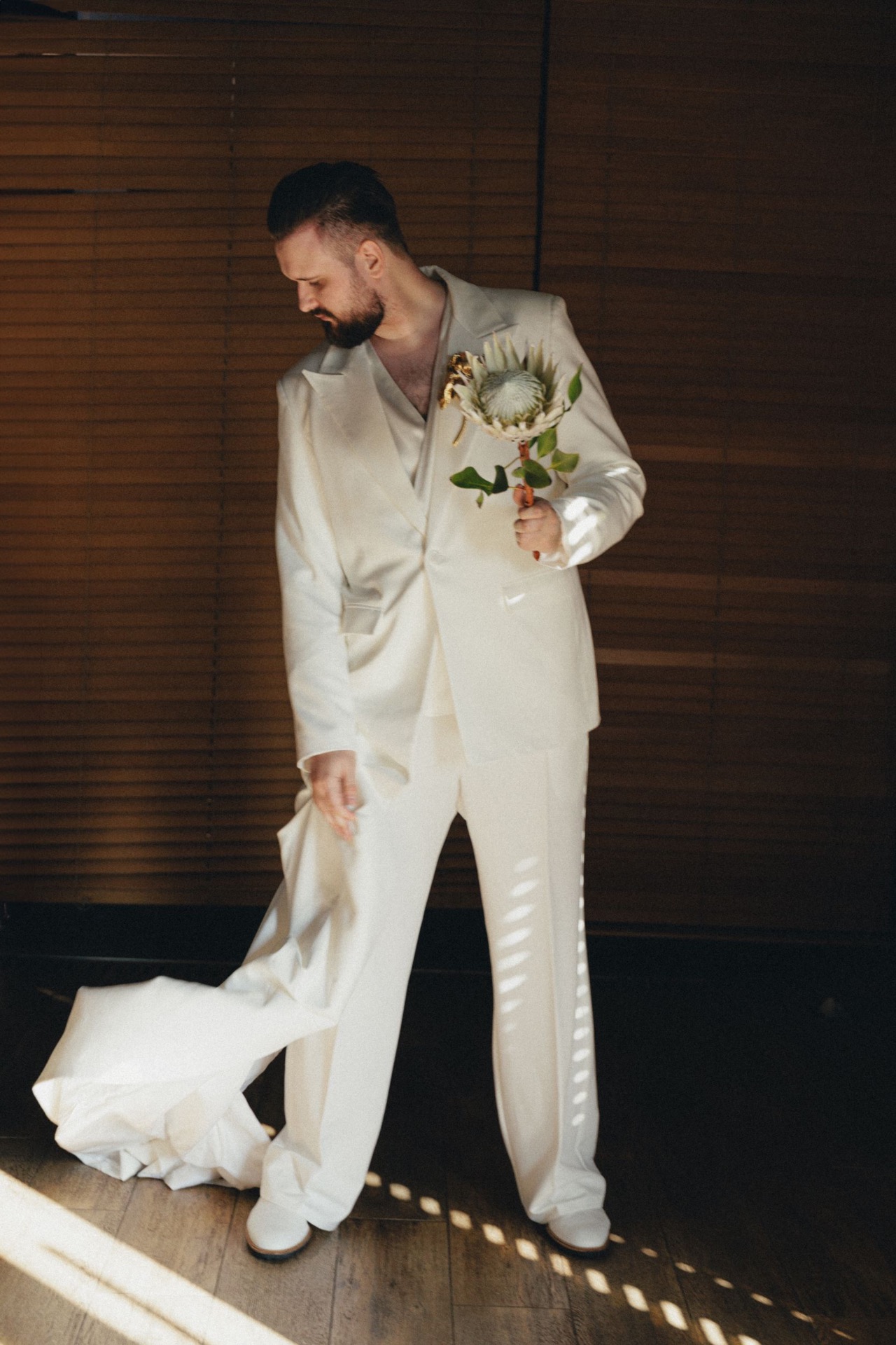 Антон выбрал для себя белый костюм со шлейфом и шёлковой белой рубашкой. Его дополняли большая золотая брошь-цветок и глубокий вырез на груди. В руках у каждого из нас была по одной гигантской белой протее, которые мы бросили в начале церемонии в качестве «букета невесты» гостям.