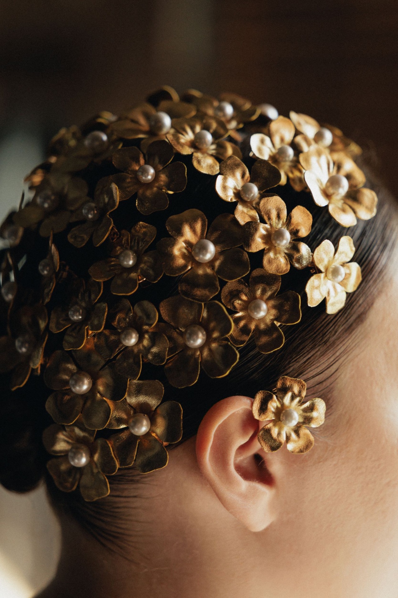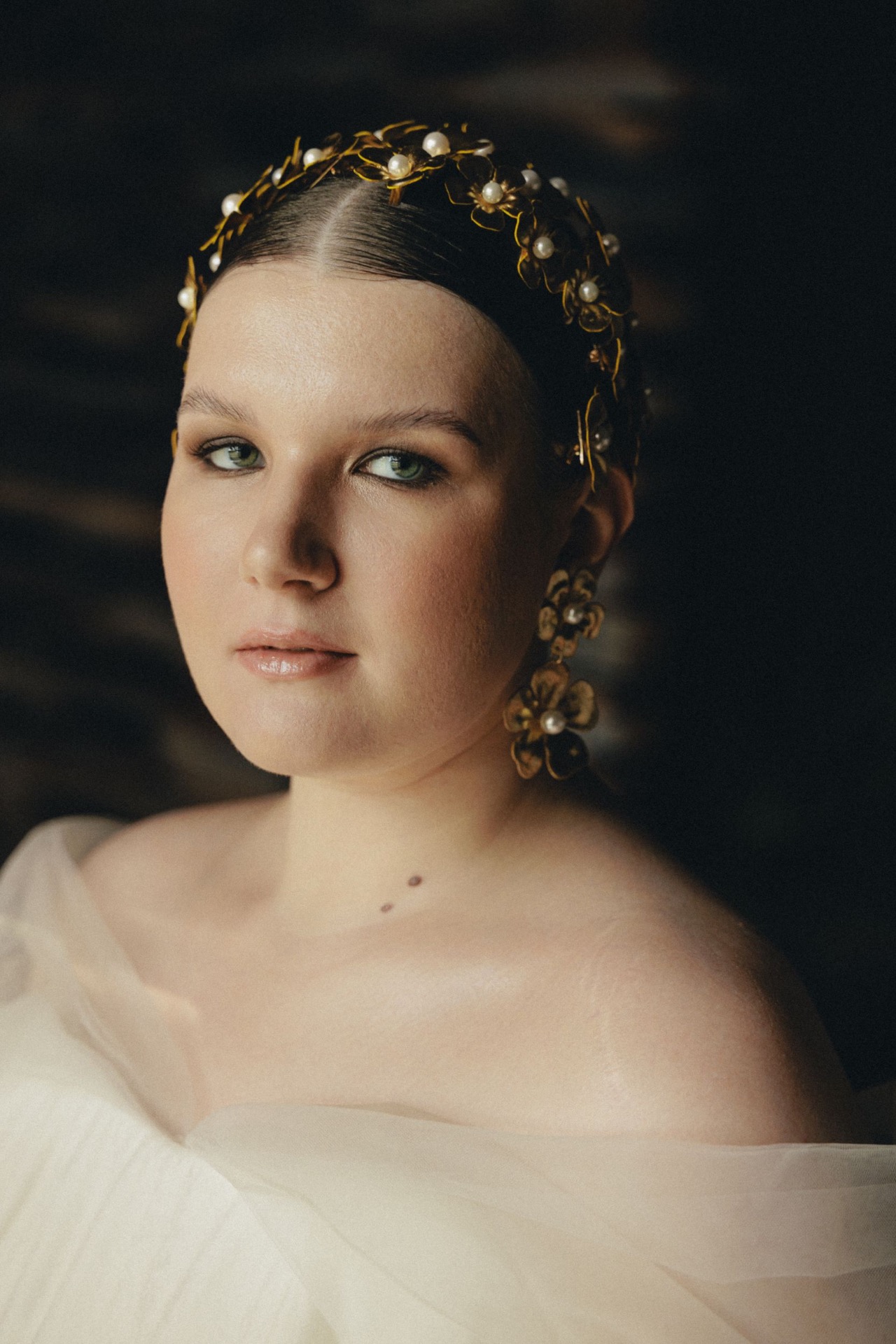 Вторые образы стали основными. Я была в белом платье с длинным бархатным корсетом и пышными рукавами, с множеством золотых заколок-цветов в волосах, массивными серьгами в том же стиле и золотыми туфлями.