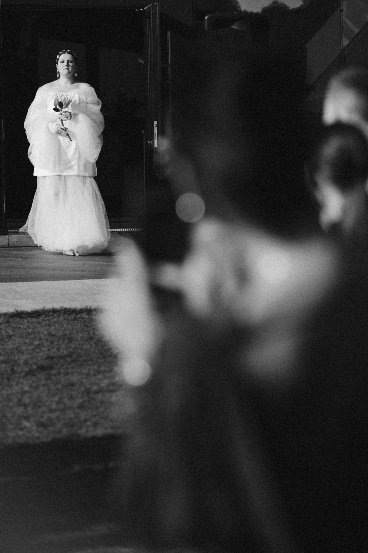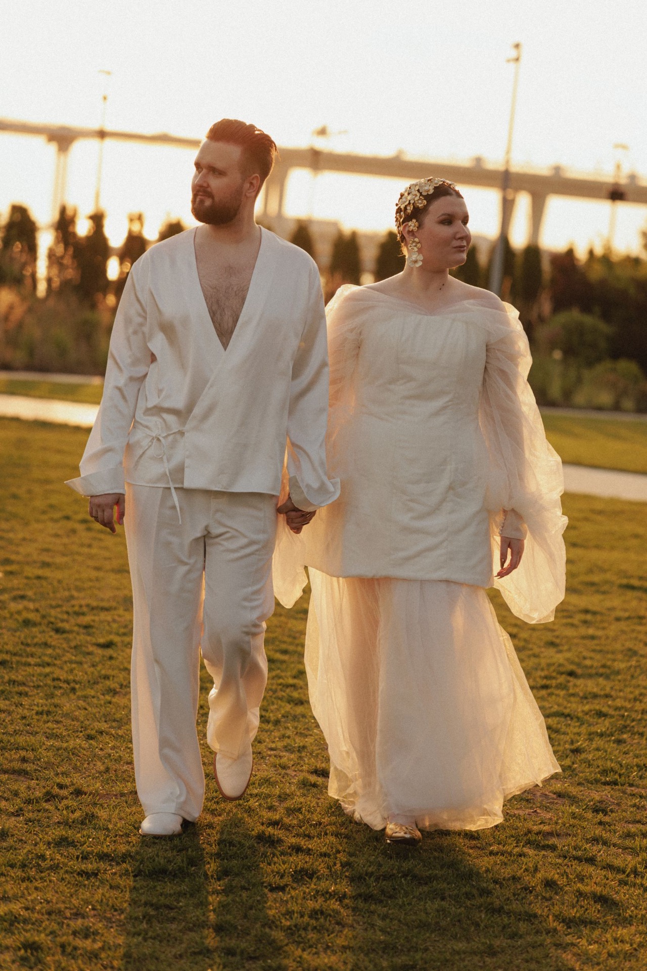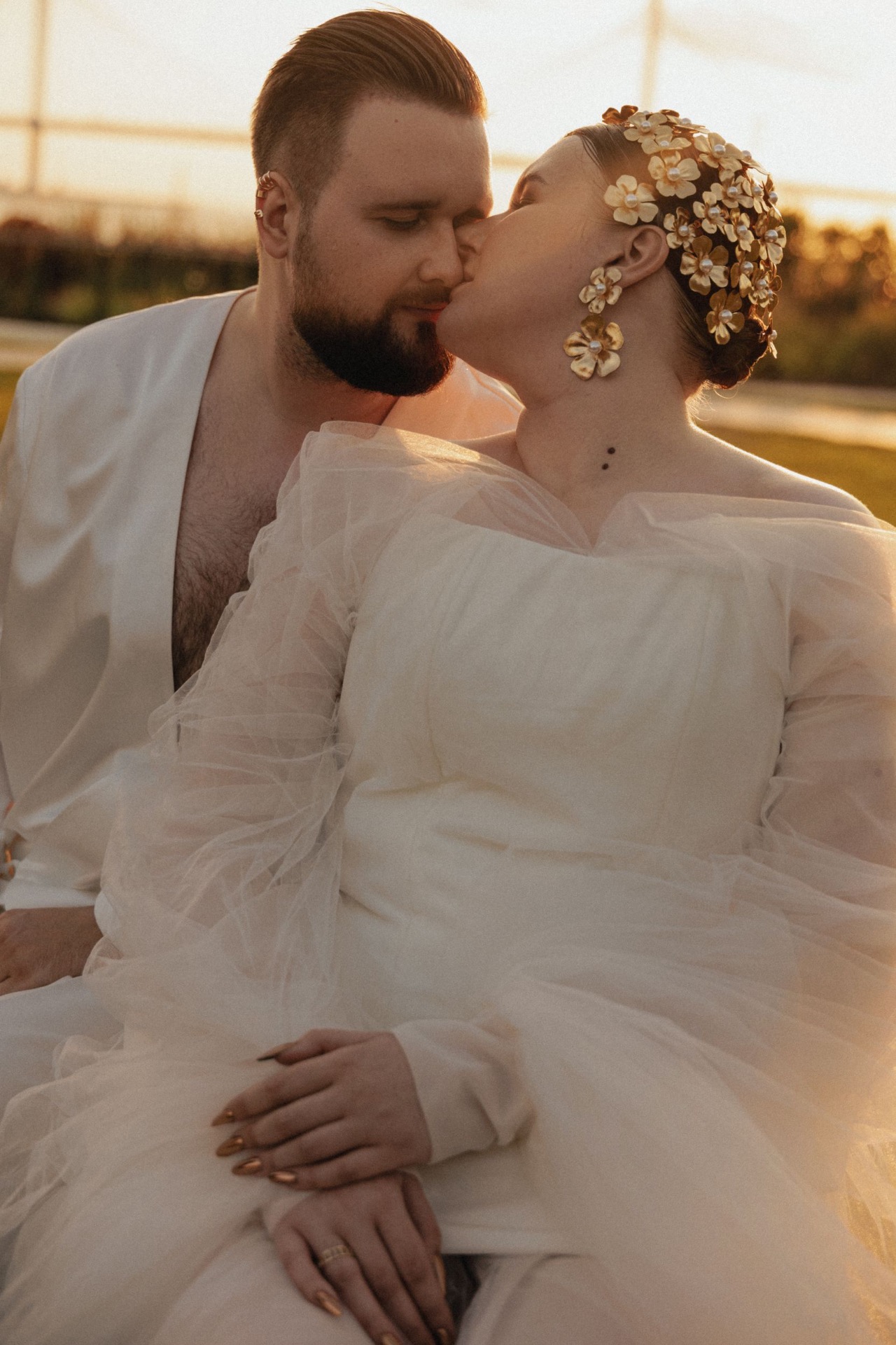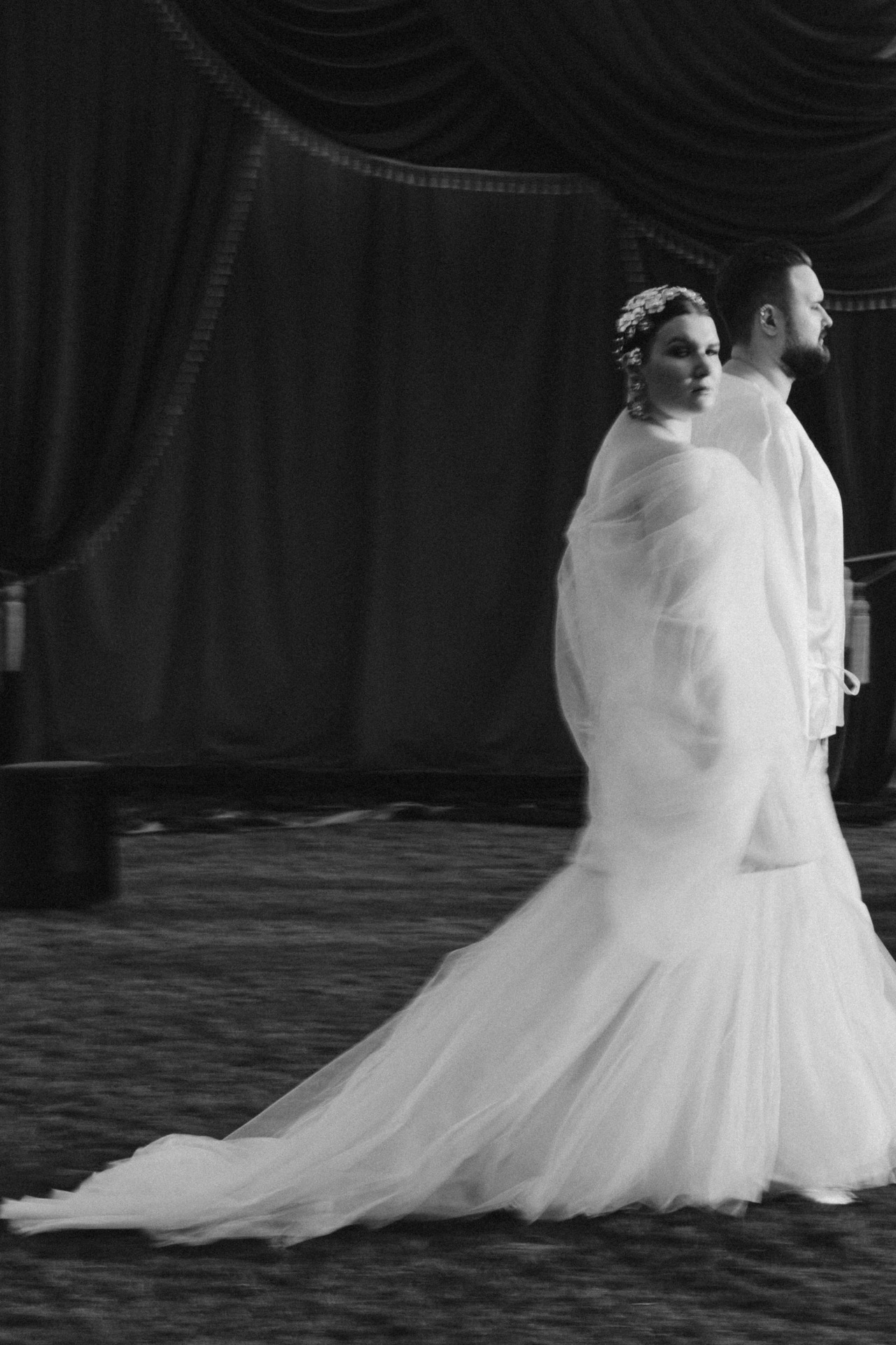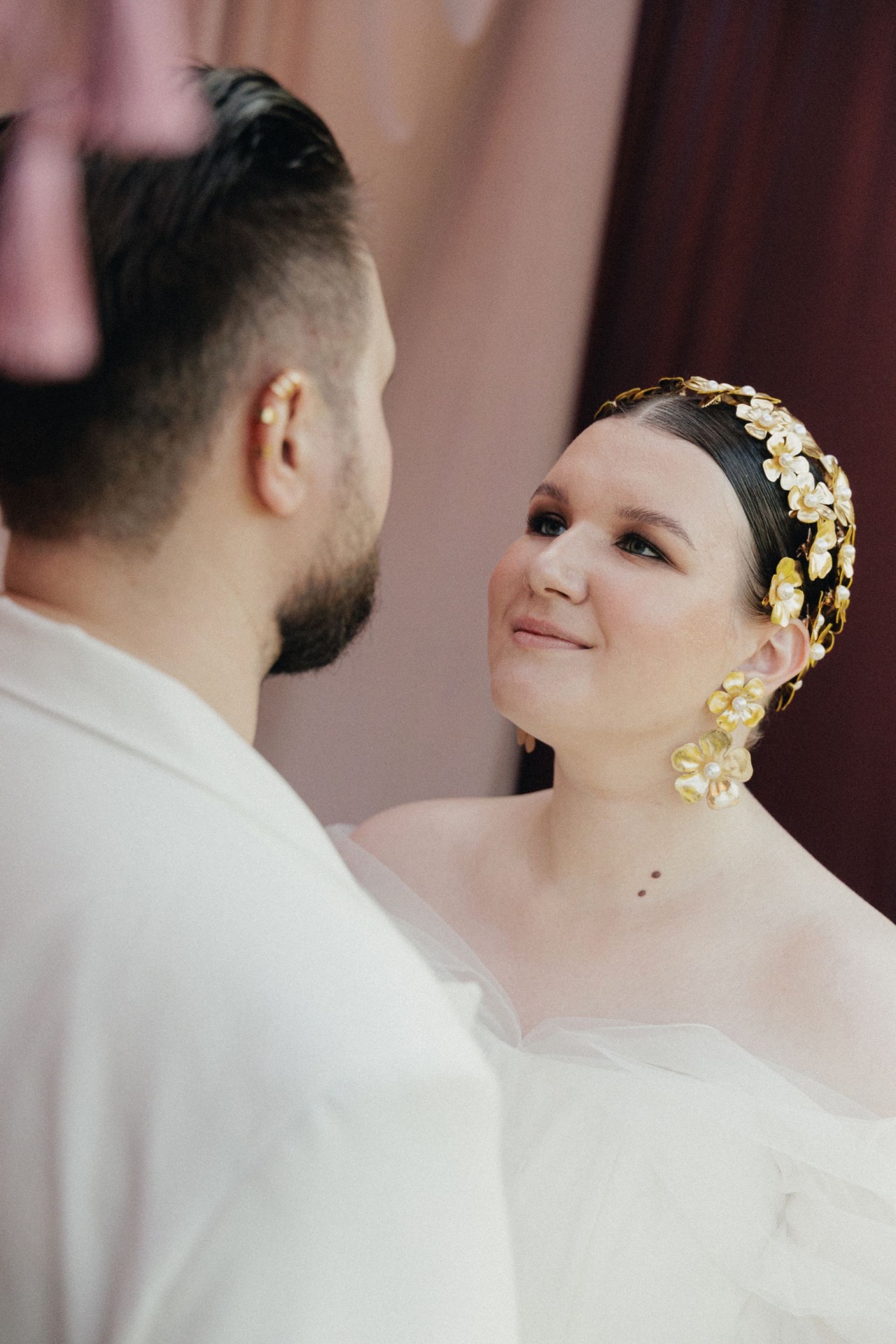 На церемонию мы вышли по отдельности, в новых образах и под любимые песни каждого из нас, бросили «букеты», сказали друг другу очень трогательные слова и обменялись кольцами. Кольца мы сделали из семейного золота по нашим референсам и с гравировкой: город, где я родилась — у Антона, город, где родился он — у меня. Мы решили оставить частичку души каждого из нас на наших пальцах в виде своеобразного крестража.