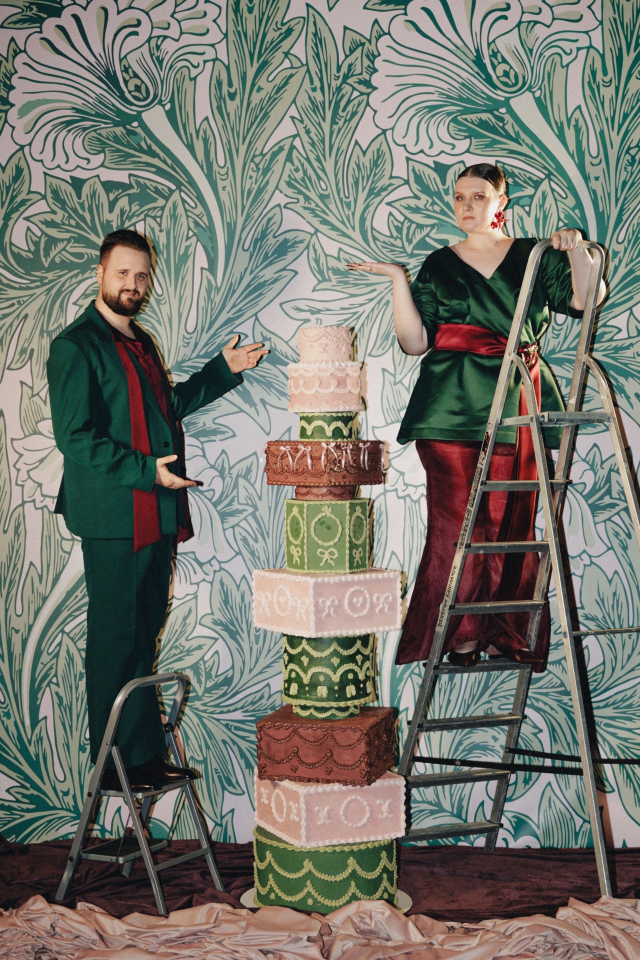 Огромный торт я давно заприметила на фотографиях со дня рождения кого-то из семейства Кардашьян и поняла, что нам такое нужно. Тогда и развилась история с гигантским тортом из разноцветных ярусов, к которому мы встали на стремянках. Всё это происходило внутри нашей церемониальной конструкции. А для особого вау-эффекта мы добавили штору, которая резко упала в нужный момент под новый трек Tyler, the Creator.