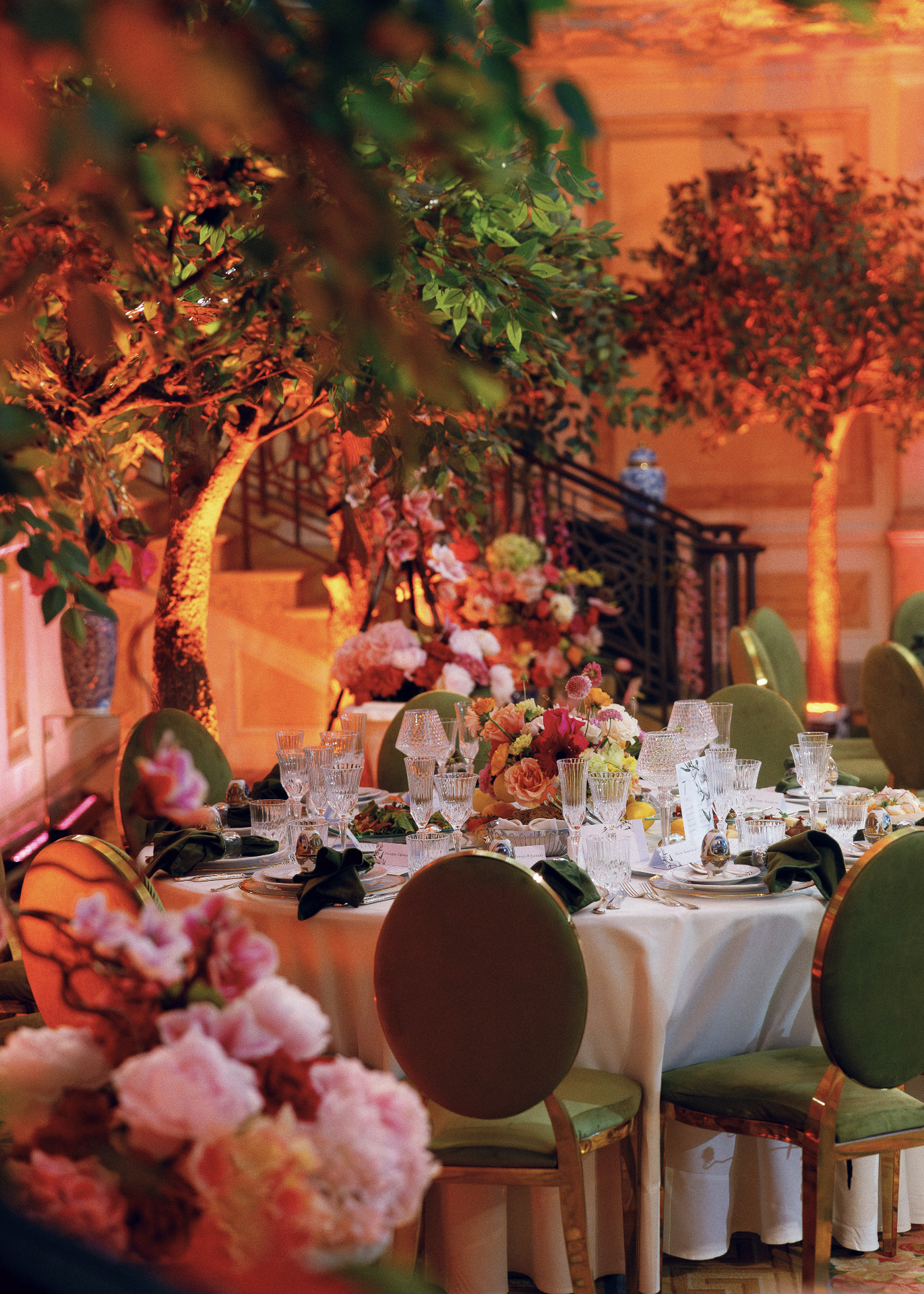 Декор был очень стильный и атмосферный – в качестве украшения зала были привезены огромные яблоневые деревья, много живых цветов ярких оттенков. Была очень красивая сервировка – бархатные салфетки, Яйца Фаберже в качестве амисбюш. На столах кроме красивых цветочных композиций было много живых лимонов, свежий аромат которых, разносился по всему залу.