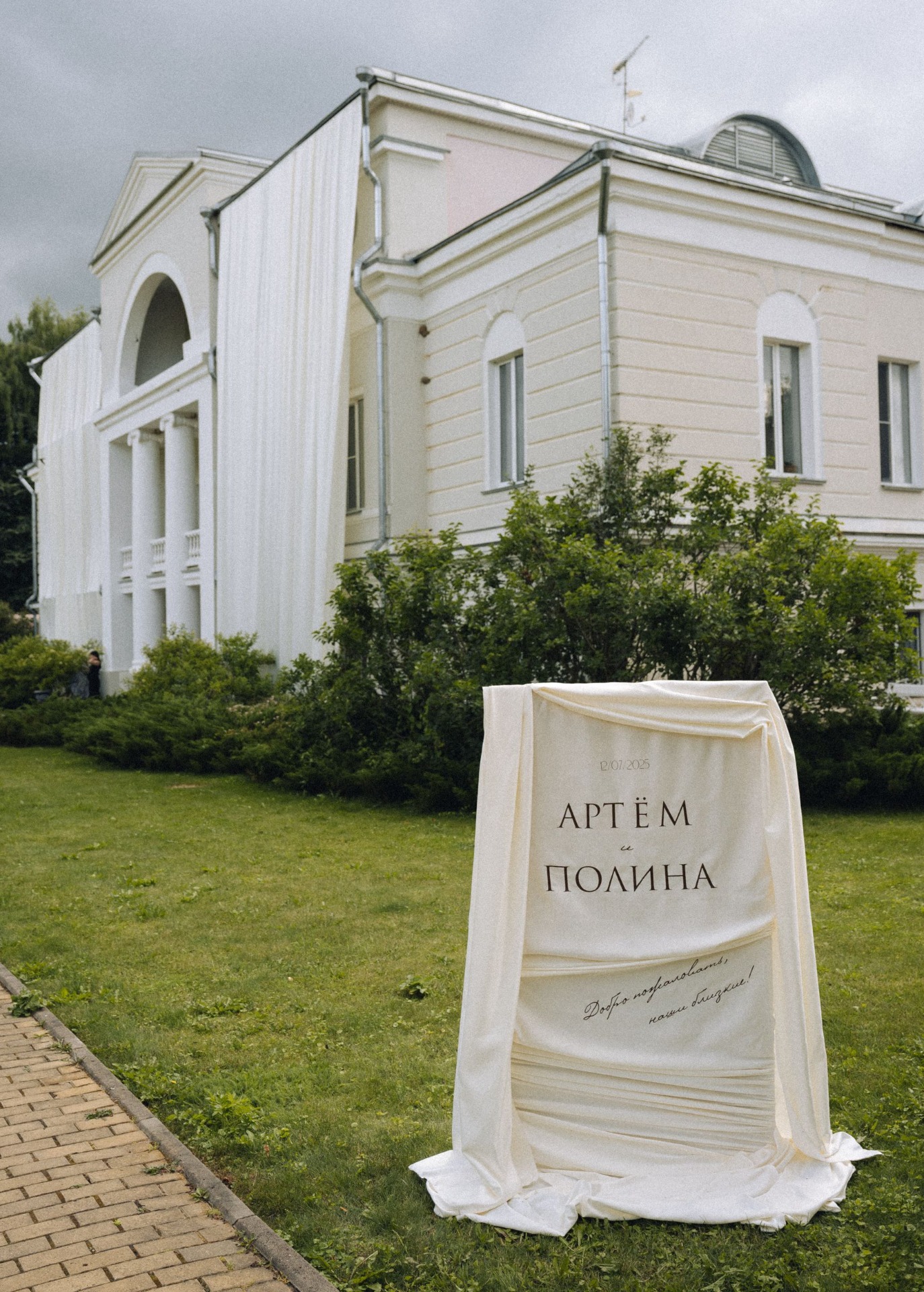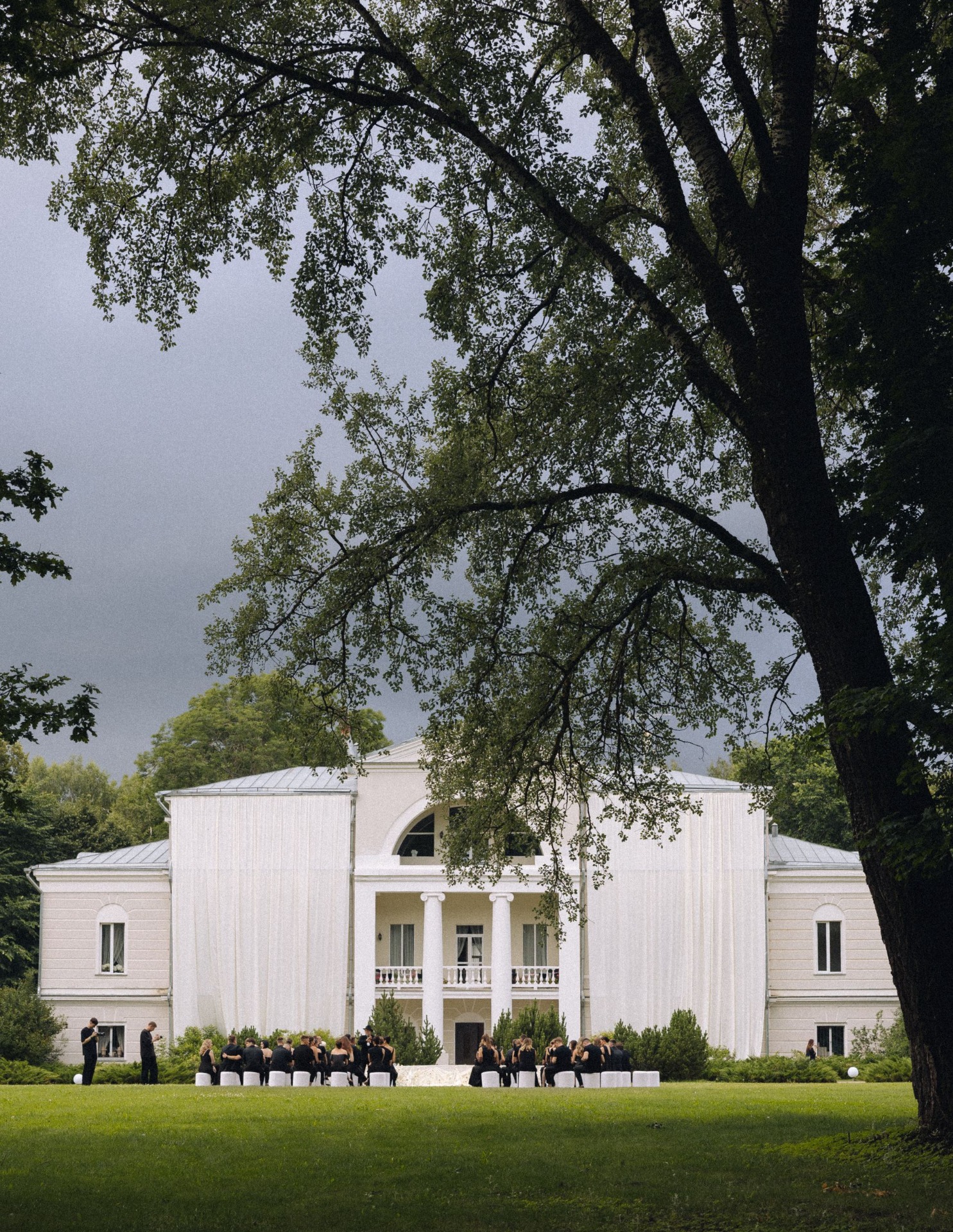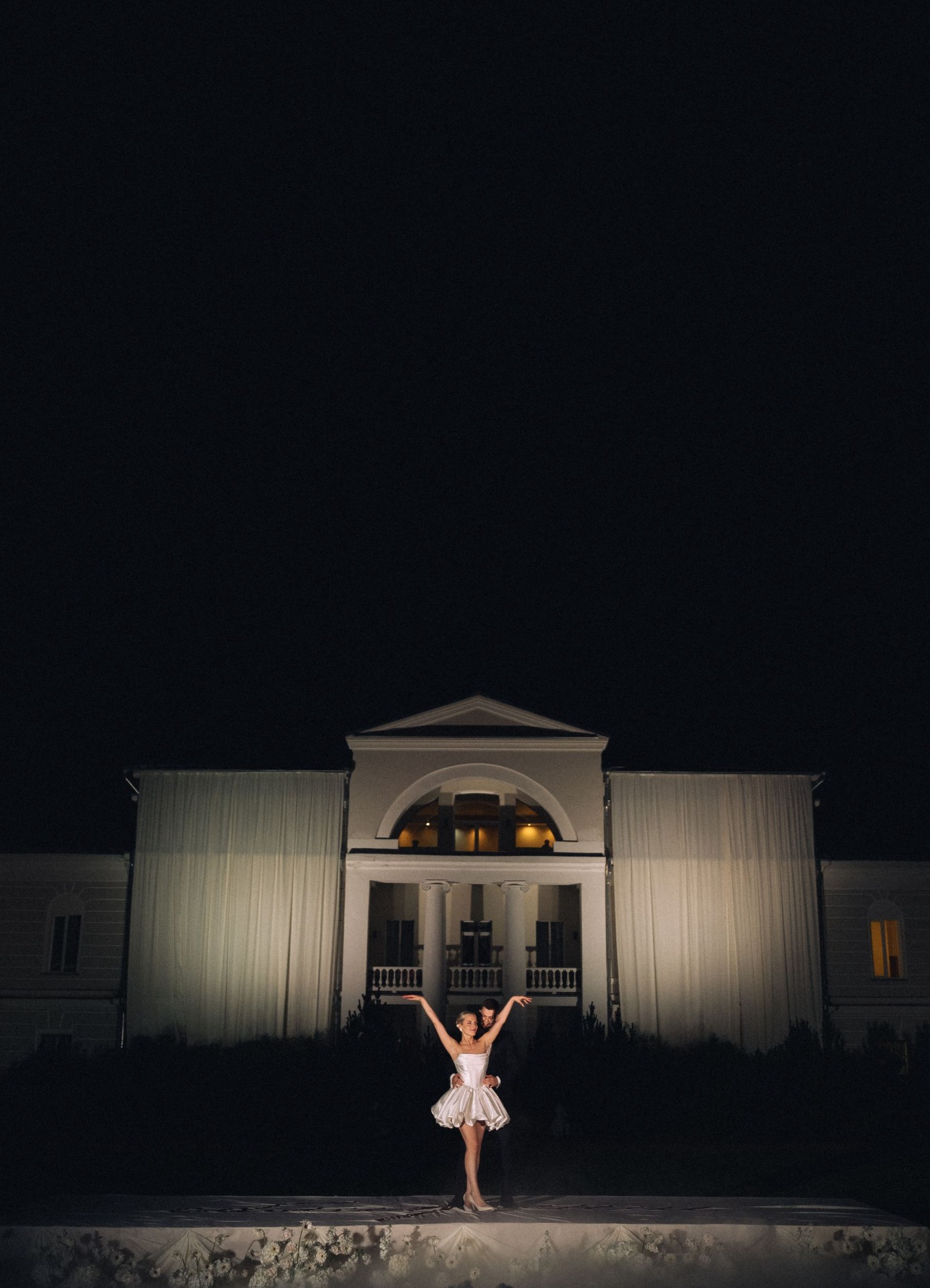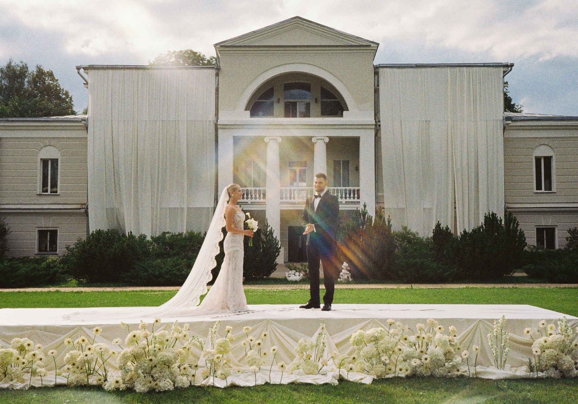 Самые жаркие обсуждения у нас были по поводу зоны церемонии. Мы смотрели референсы, эскизы, но во всём видели нюансы. И тут наши организаторы предложили: «Давайте сделаем церемонию на большом подиуме на фоне усадьбы? Рефы похожие мы найти не можем, но будет кайф! Вечером с подиума будет стекать тяжёлый дым, вы станцуете на нём первый танец, а над вами, за усадьбой, пустим салют!»